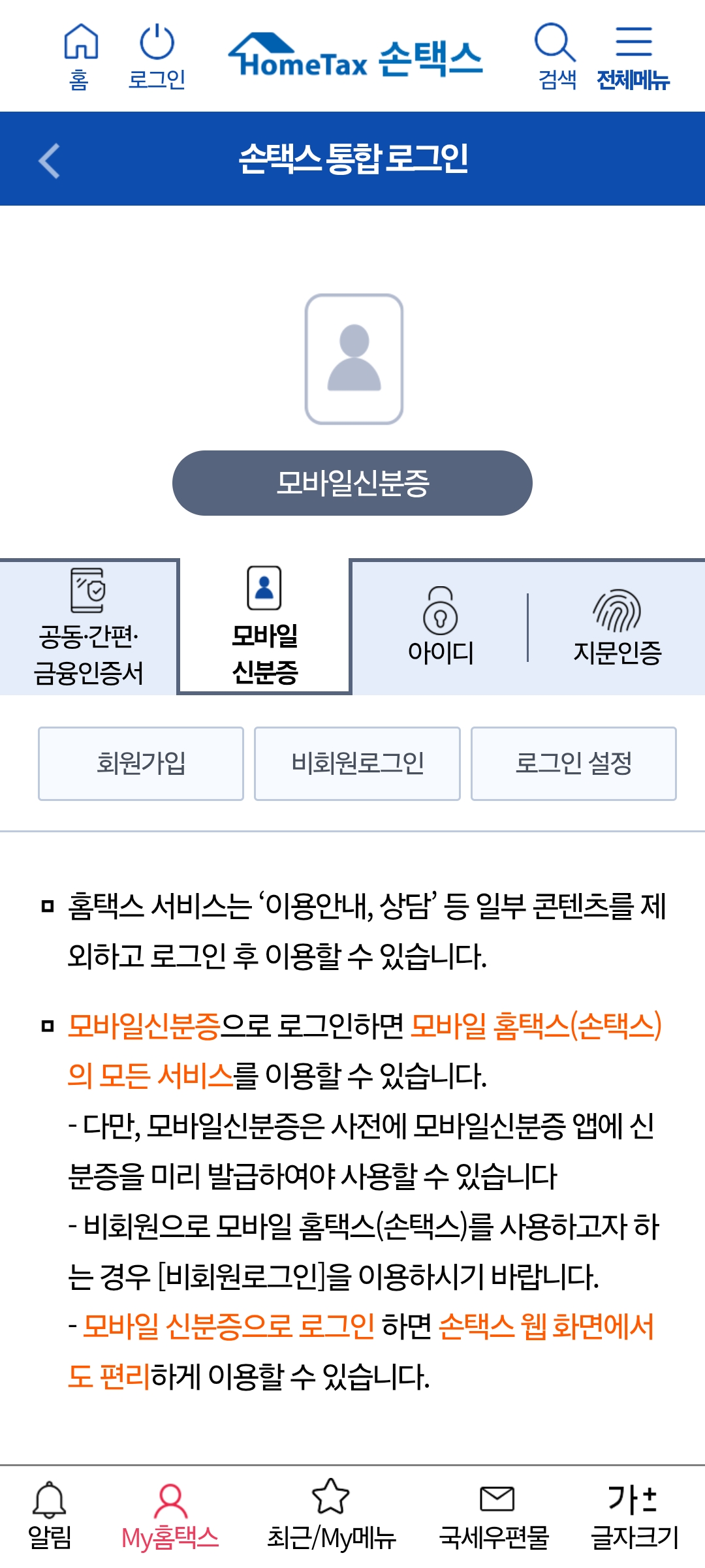 홈택스 스마트폰 앱인 손택스에서 하단 메뉴에서 [My홈택스]로 들어간다. 이때 모바일신분증으로 로그인하면 손쉽게 로그인할 수 있고 공동인증서 관리를 하지 않아도 간편하다. (뒤에 나오지만, 납부할 땐 또 모바일신분증으로 안된다... 어이없다. 따라서 처음부터 금융인증서로 로그인해도 무방하다.)