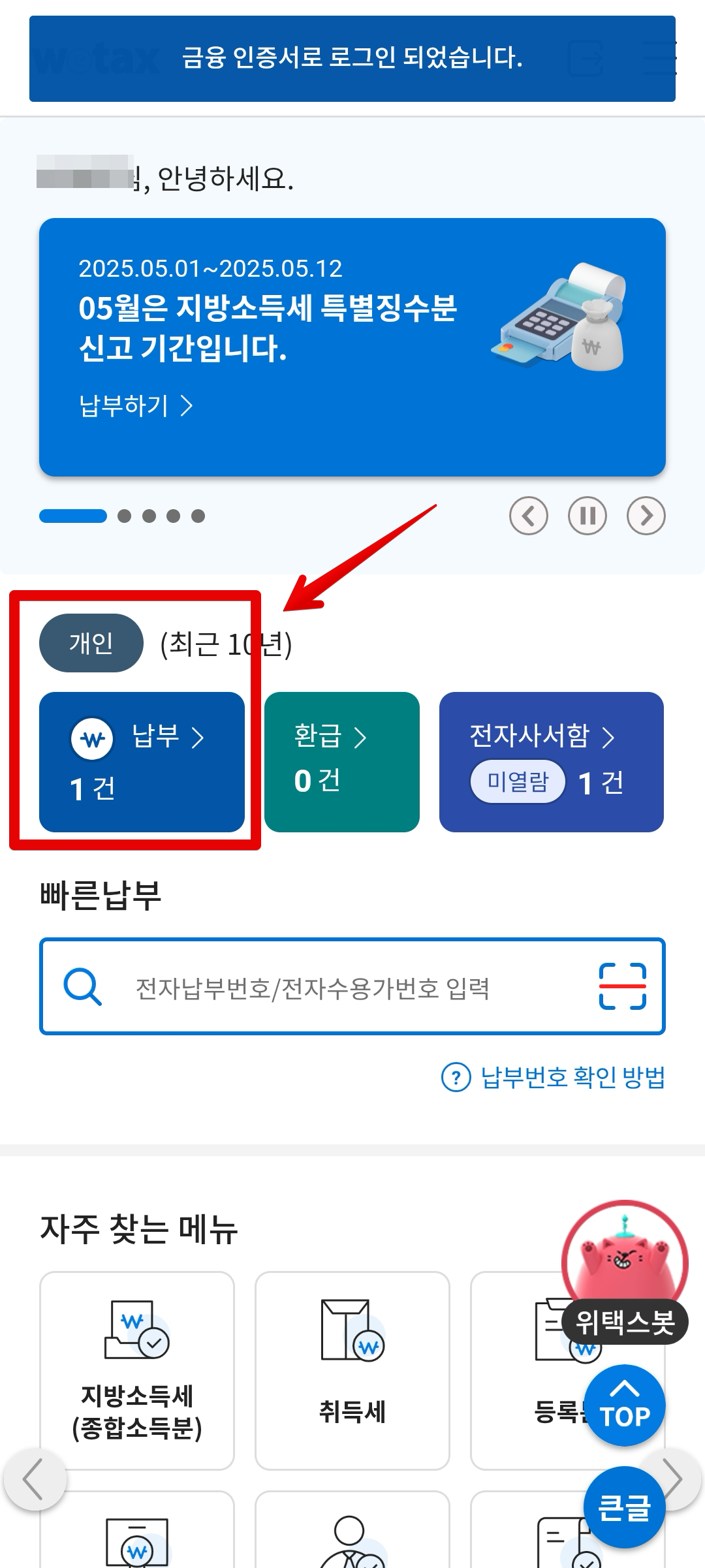 지방세의 경우에는 위택스 앱에서 진행하고, 첫 화면에서 [납부]로 들어가면 양도소득 내역을 볼 수 있다. 여기에서 납부하면 끝난다.