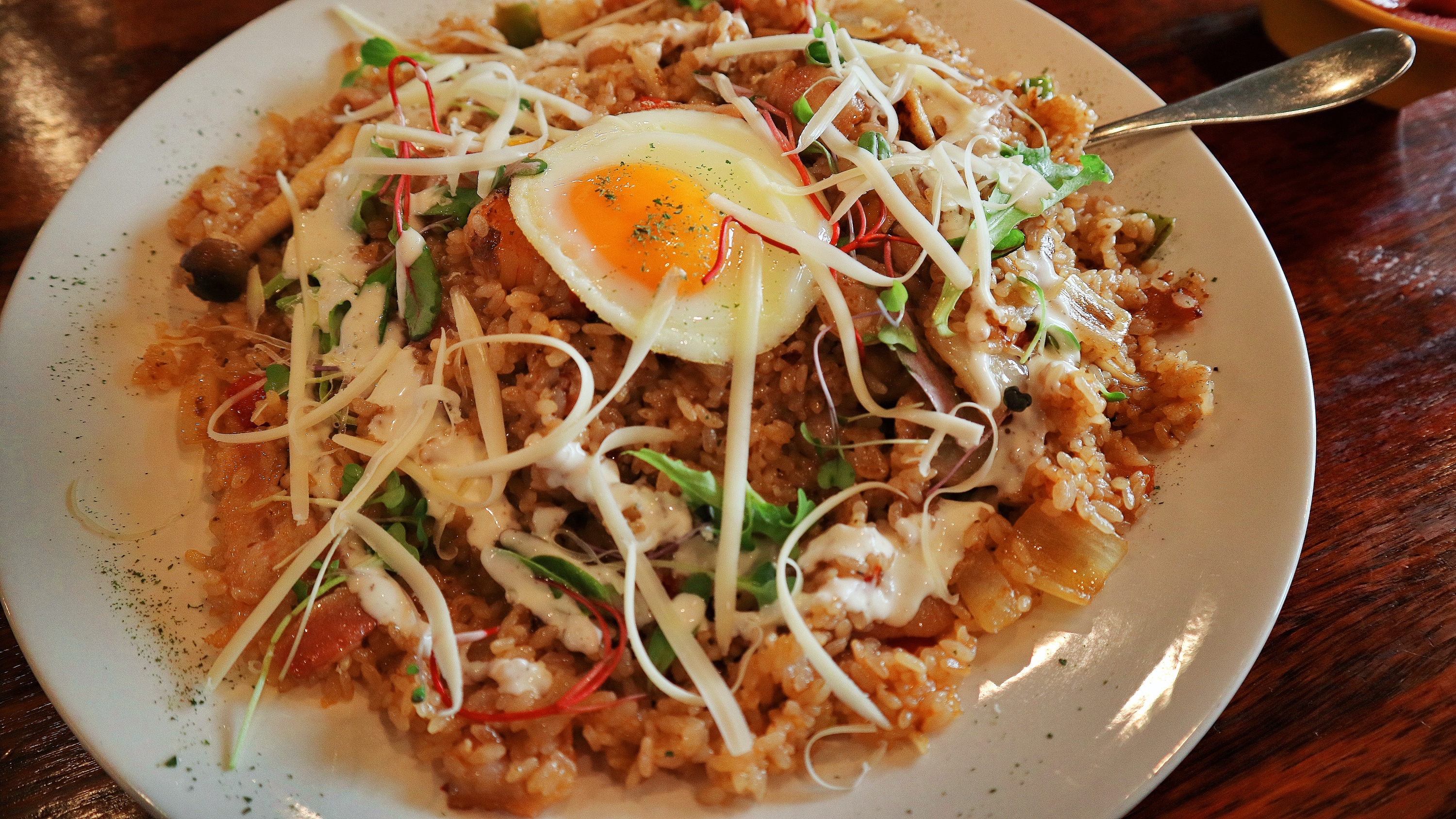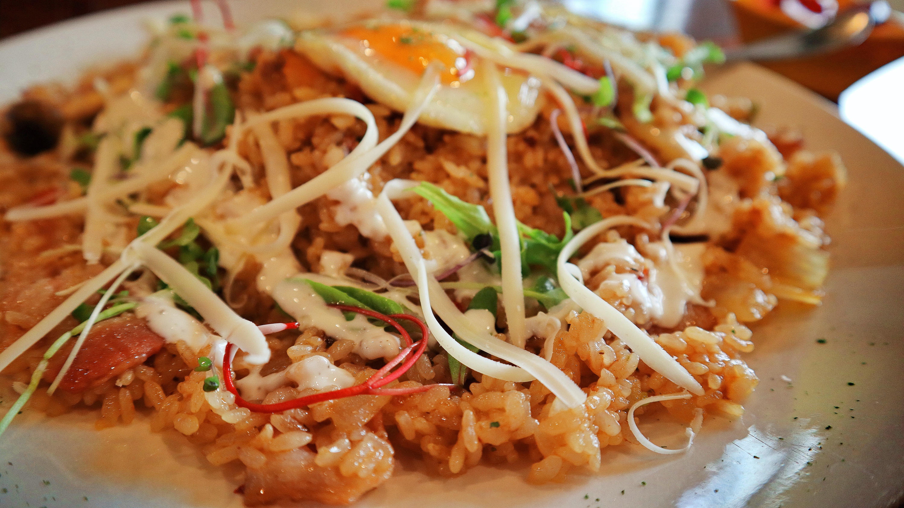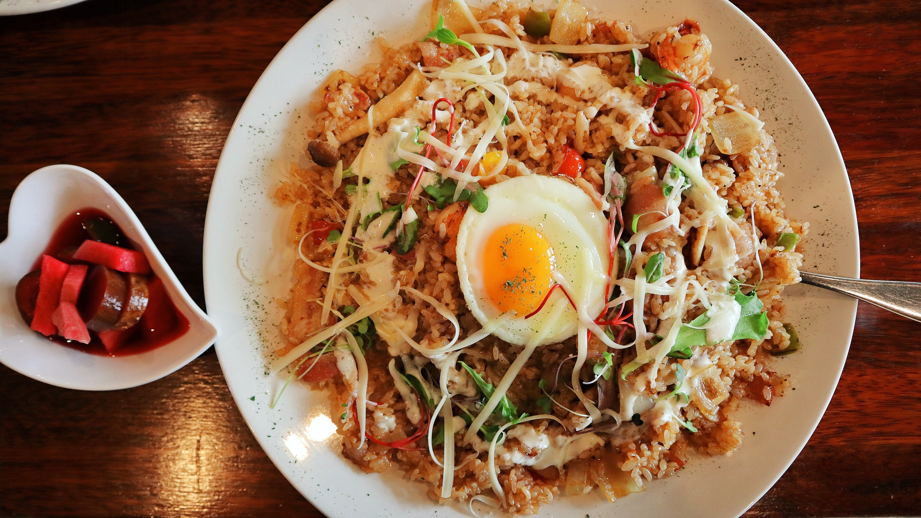 제일 먼저 메인메뉴이자 리얼키친에서 제일 맛있는 필라프! 이건 새우 베이컨 필라프인데 베이컨이 푸짐하게 들어있어서 상당히 맛있는 편이다. 새우도 꽤 들었다. 양이 굉장히 많고 2인분이라서 혼자서는 다 못먹으니까 일행과 같이 먹어야한다. 같이 주는 반숙이 하이라이트. 리얼키친 시그니처 메뉴라고 보면된다.