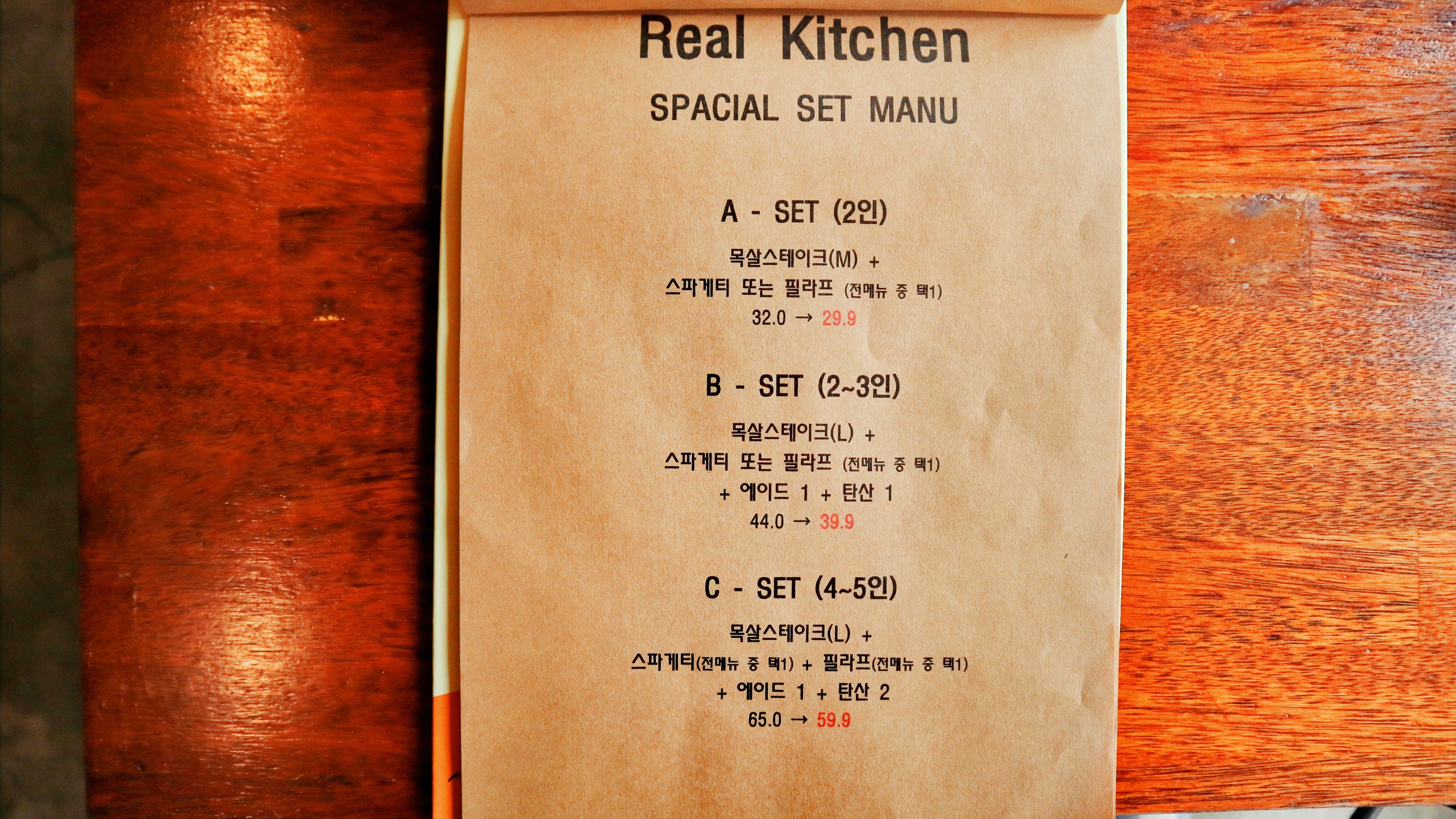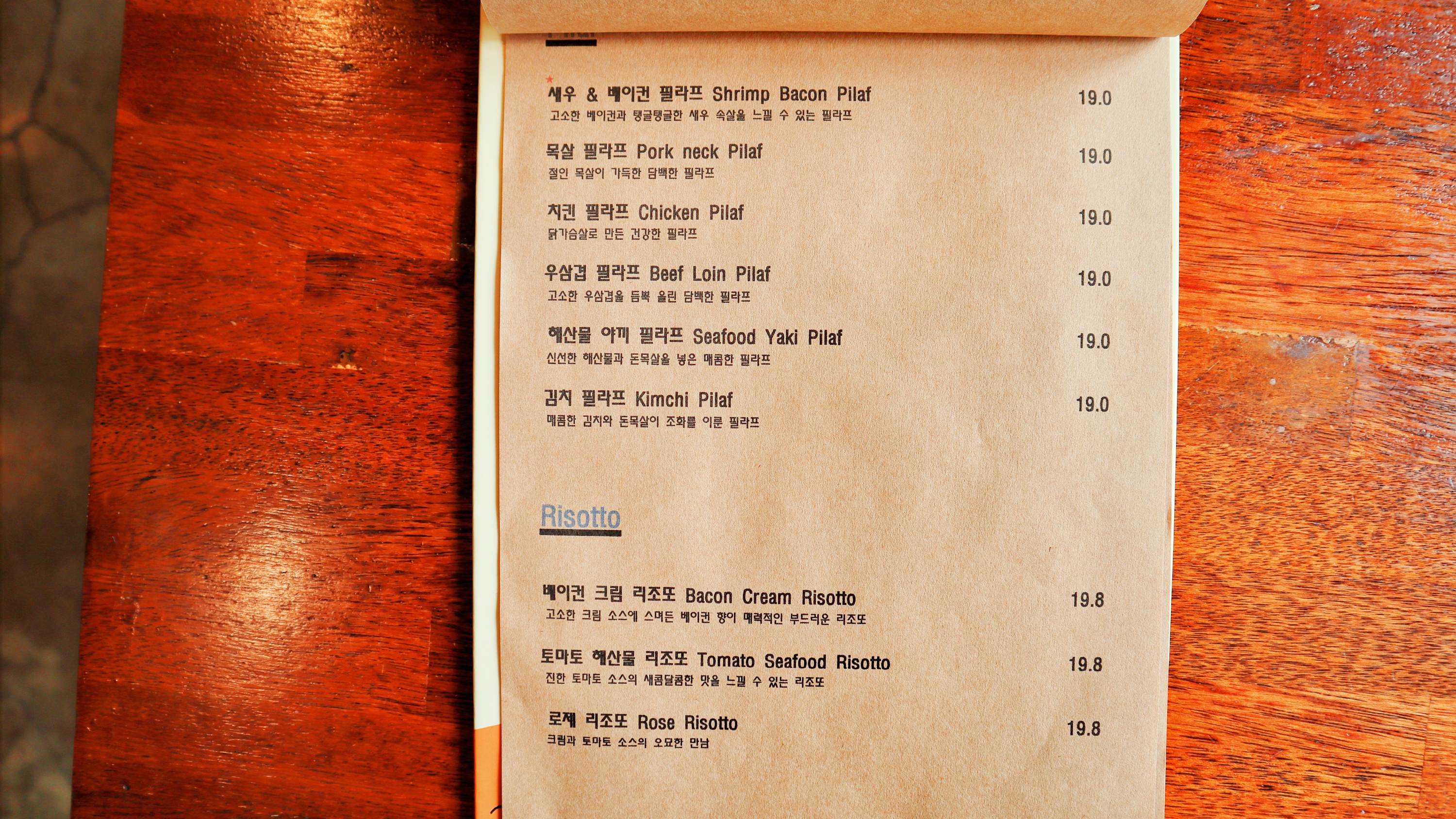 리얼키친 메뉴판. 클릭하면 크게 볼 수 있다. 필라프 맛집이니까 필라프는 무조건 필수메뉴이고 그외에 까르보나라 스파게티, 그리고 고기 좋은 사람은 스테이크류 살펴보면 GOOD.