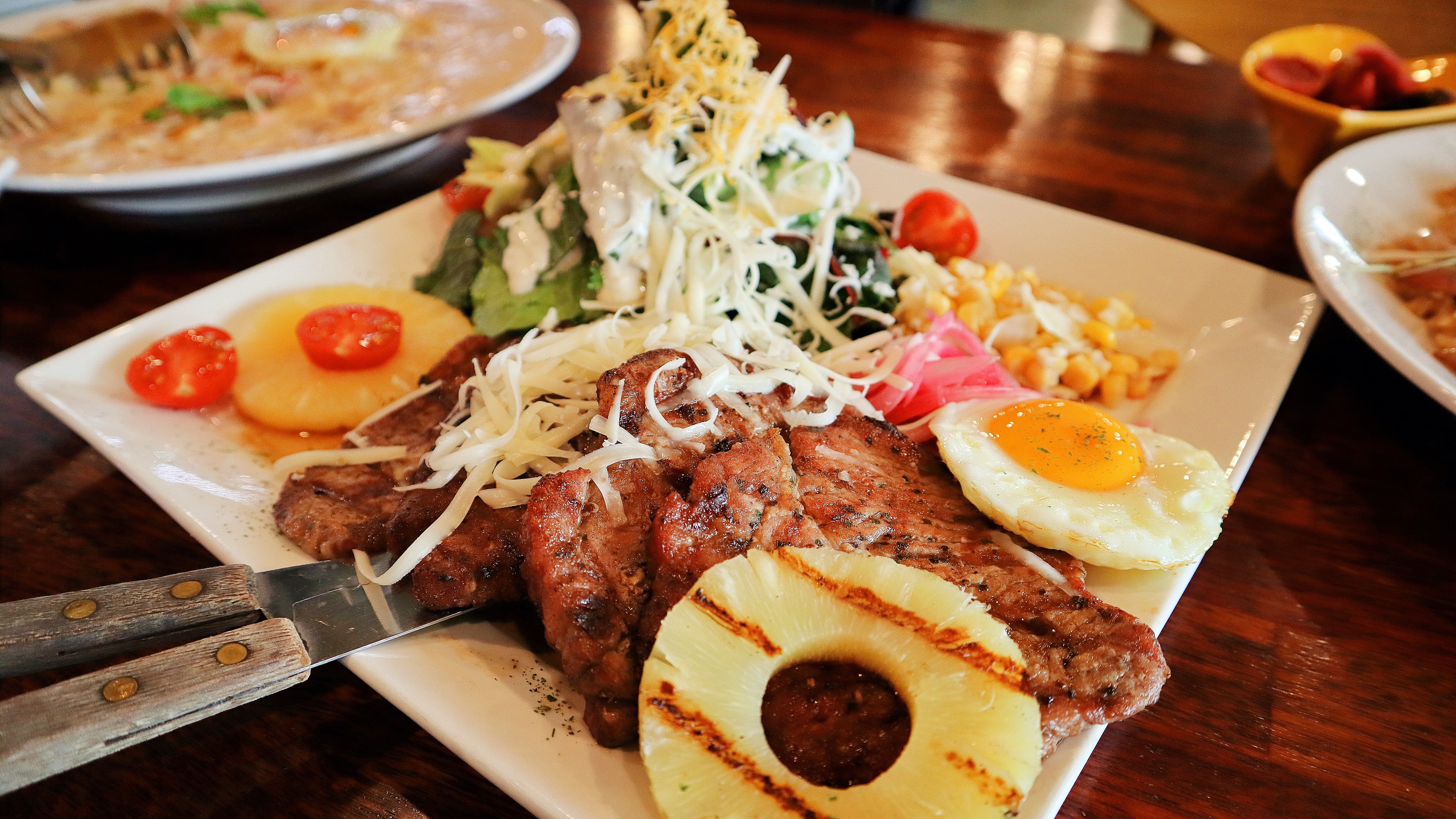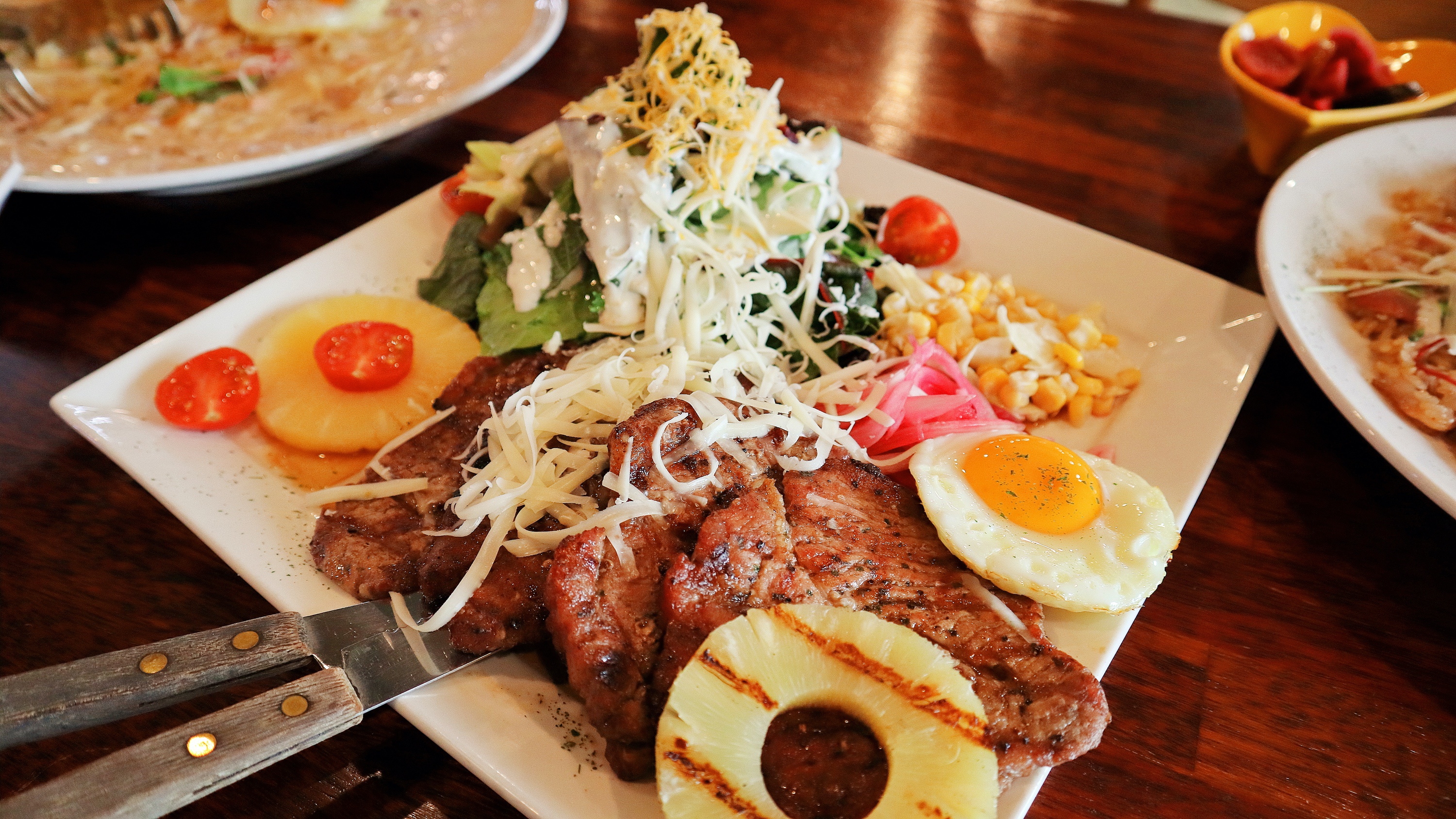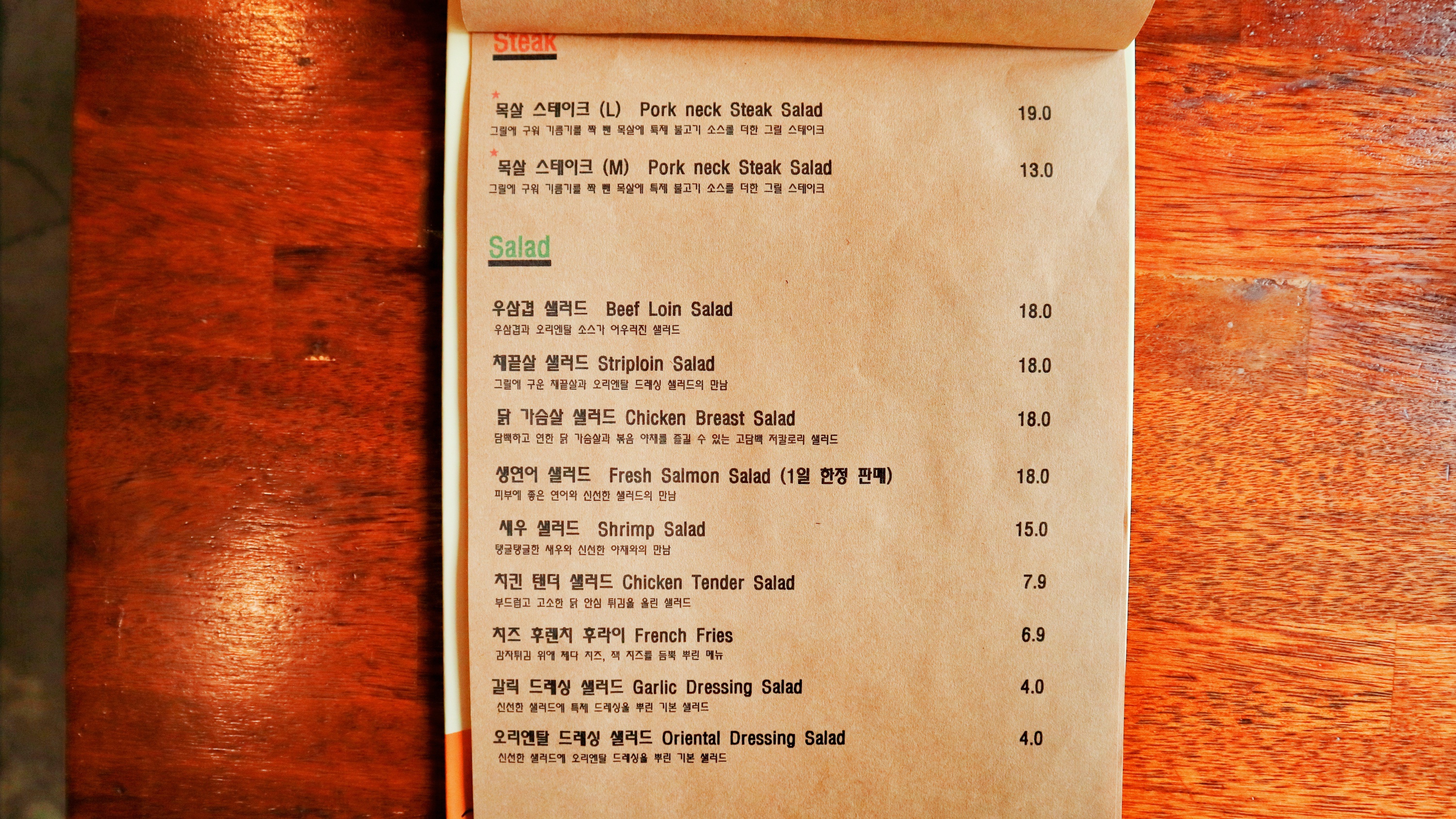 목살이라서 고기는 단독으로 먹기는 좀 그렇고 샐러드나 같이 주는 과일 등과 같이 먹으면 좋다.