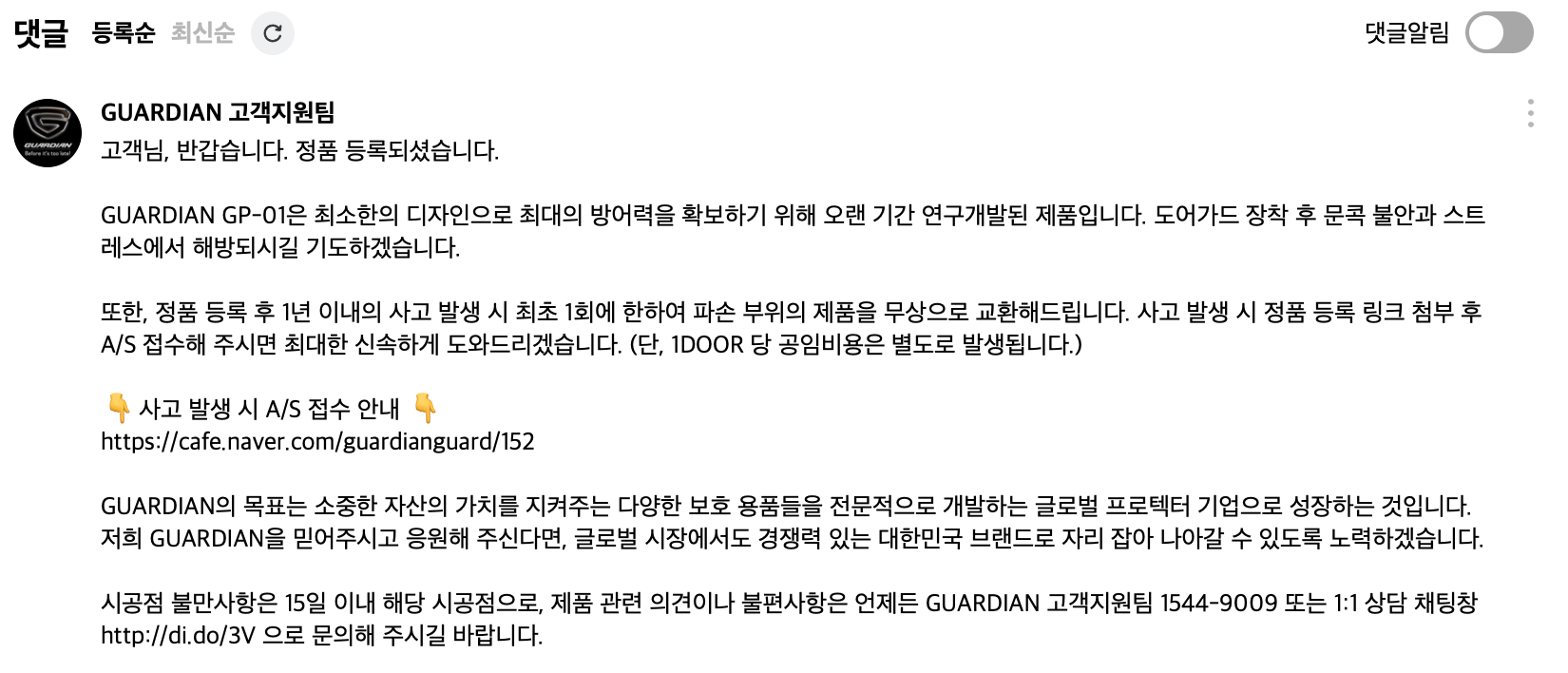 홈페이지에서 등록하는게 있는지 찾아봤더니 메뉴가 없었다. 가디언 도어가드 공식 네이버 카페가 있는데 여기에 가입해서 진행해야하는 프로세스였다. 그래서 간단하게 카페 가입 후 등업 한 다음에 제품 보증카드 사진 올리고 이것저것 입력된대로 입력해서 올리니까 댓글로 정품 등록되었다고 달렸다. 뭔가 아리까리하게 정품등록이 되는것 같지만, 뭐 증빙만 되면 나중에 되는거니까 그러려니 하는 중.