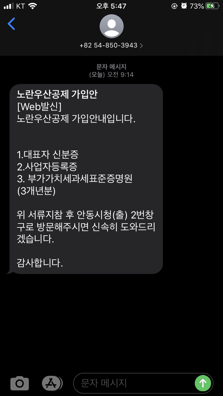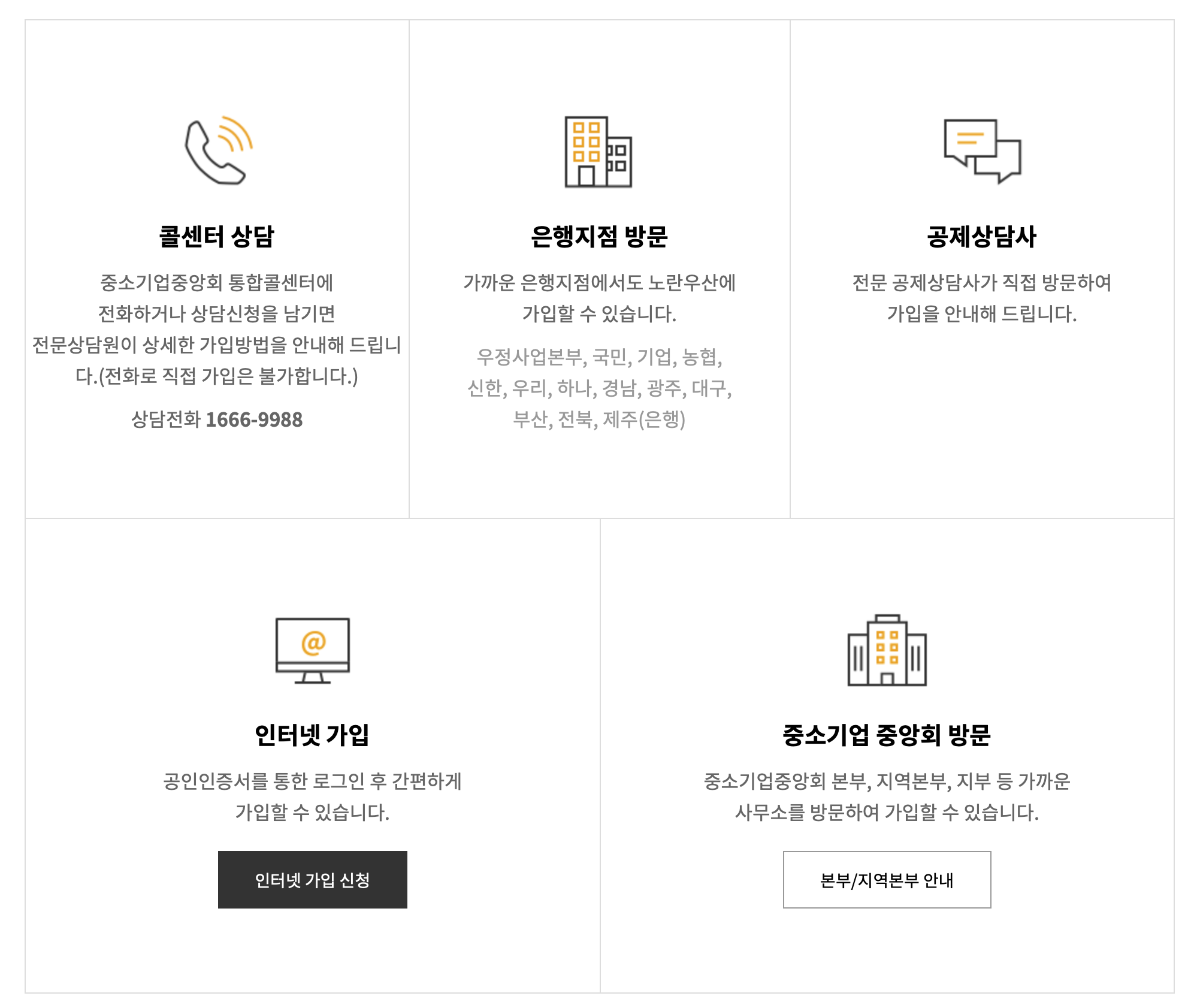 노란우산은 크게 5가지 방법으로 가입할 수 있다. 콜센터 상담 후 전문상담원과 가입, 은행지점 방문, 상담사가 직접 사업장을 방문하여 가입, 인터넷 가입, 중소기업 중앙회 방문이다. 중소기업 중앙회는 안동에 없어서 처음부터 패스였고 콜센터 상담과 공제상담사를 통해 가입할 경우 상담사가 사업장에 방문하여 가입하게 되는데, 요즘은 코로나 문제도 있고 모르는 사람이 우리 사업장에 방문한다는것 자체가 좀 꺼려지는게 있어서 배제했다. 그럼 남는건 은행지점방문과 인터넷 가입이 있는데 인터넷 가입의 경우에도 조금 알아보니까 나중에 상담사가 사업장에 방문한다는 이야기가 있어서 은행지점 방문을 통해 가입하기로 마음먹었다.