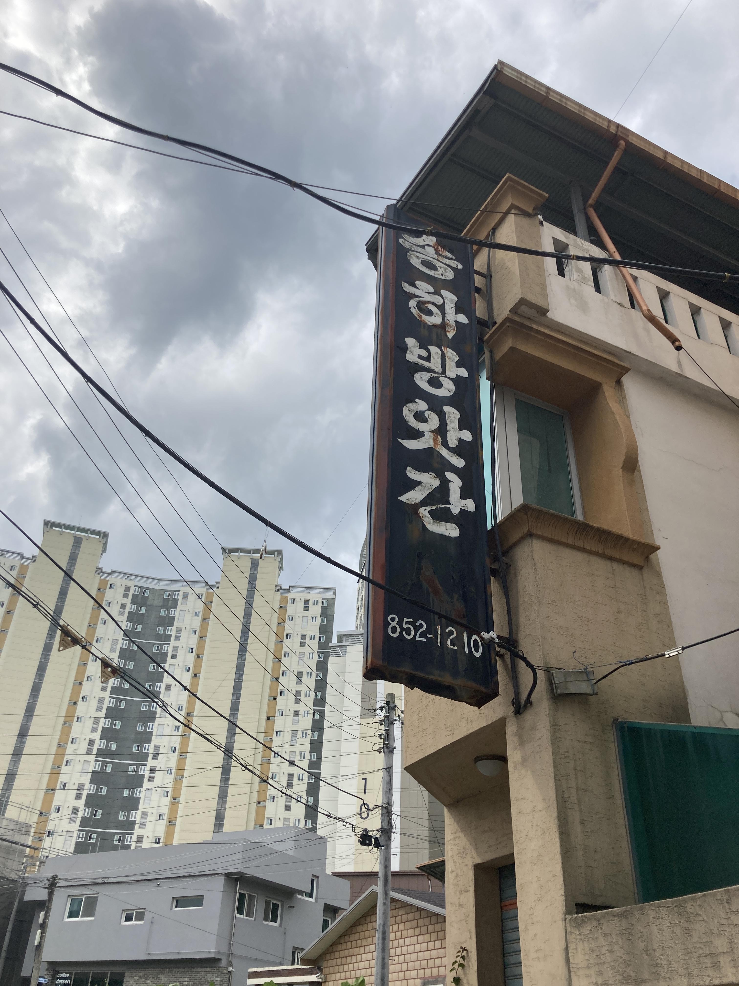 레트로를 넘어 과거형에 가까운 간판을 발견했다. 송하방앗간. 전화번호는 지금 852 국번으로 입력돼 있지만, 아래쪽에 자세히 보면 55번 국번의 자국이 남아있는걸 볼 수 있다. 방앗간 뒤로 하늘 높이 솟은 아파트와 굉장히 비교되는 간판의 모습이다.