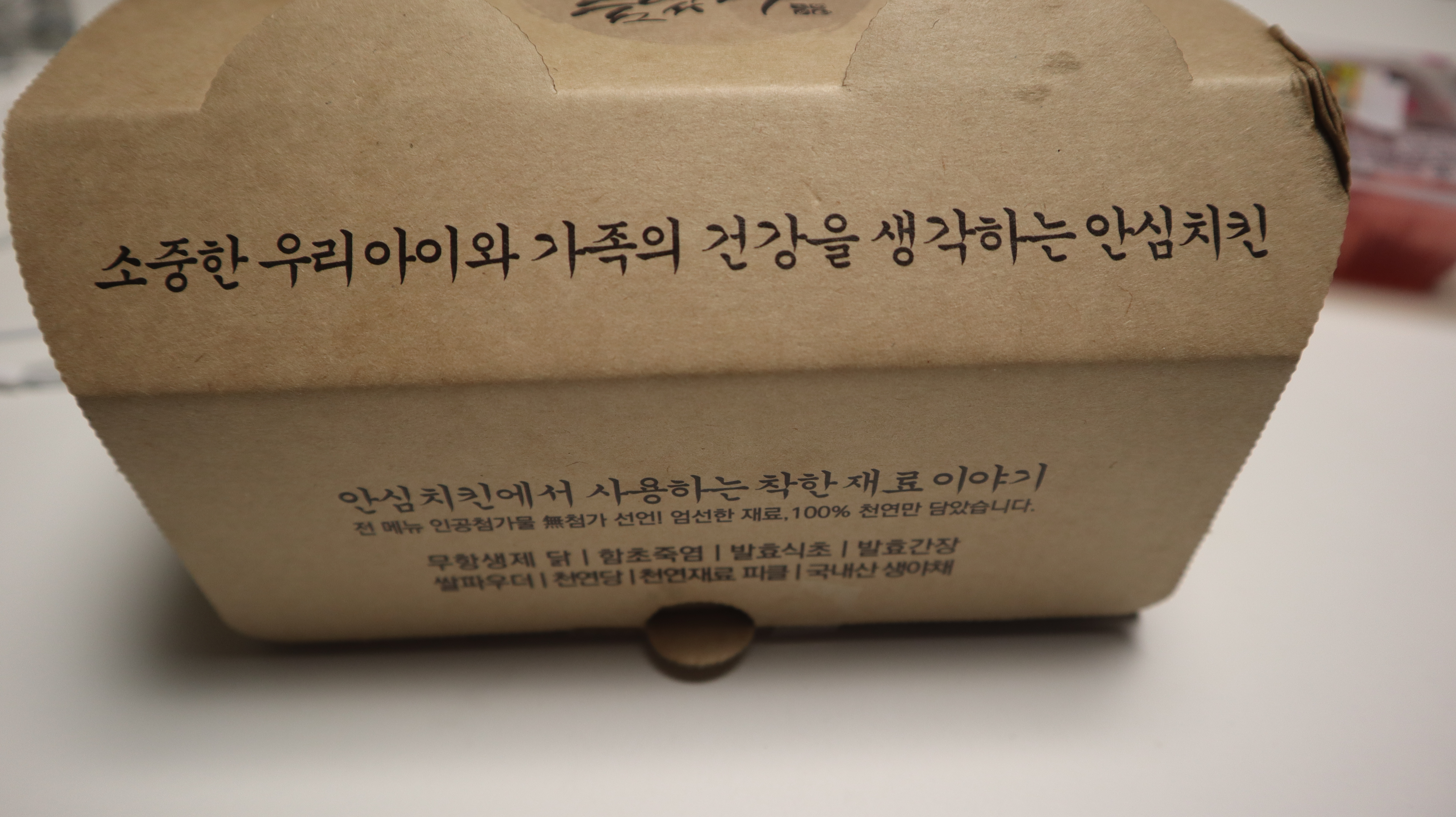 박스 디자인은 평범한 치킨 스타일이다. 그런데 구멍이 송송 뚫려 있는데 안심치킨의 쌀후라이드 치킨 자체가 겉이 바삭하고 매우 크리스피한 스타일이라서 가루가 조금 으러질 수 있다.