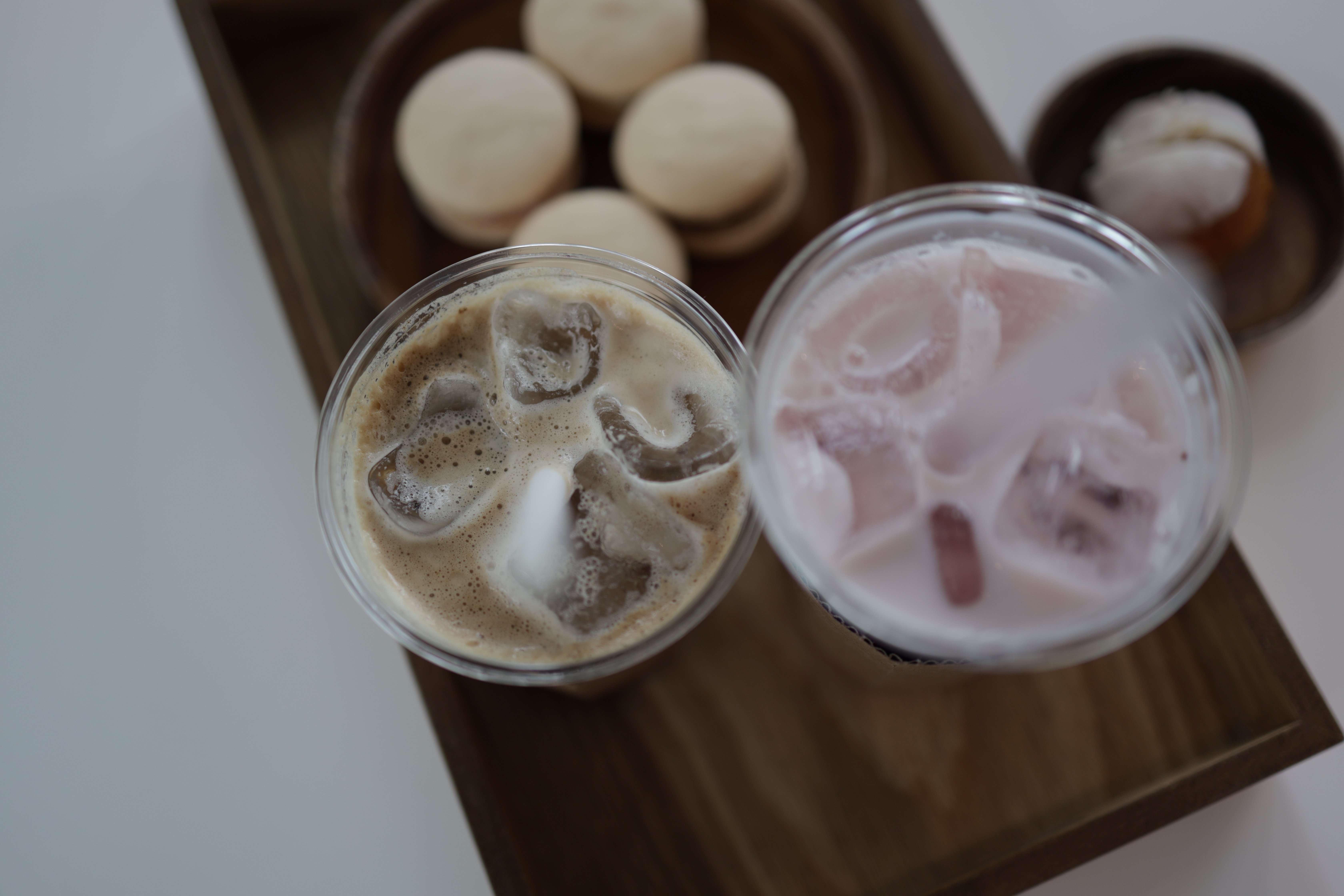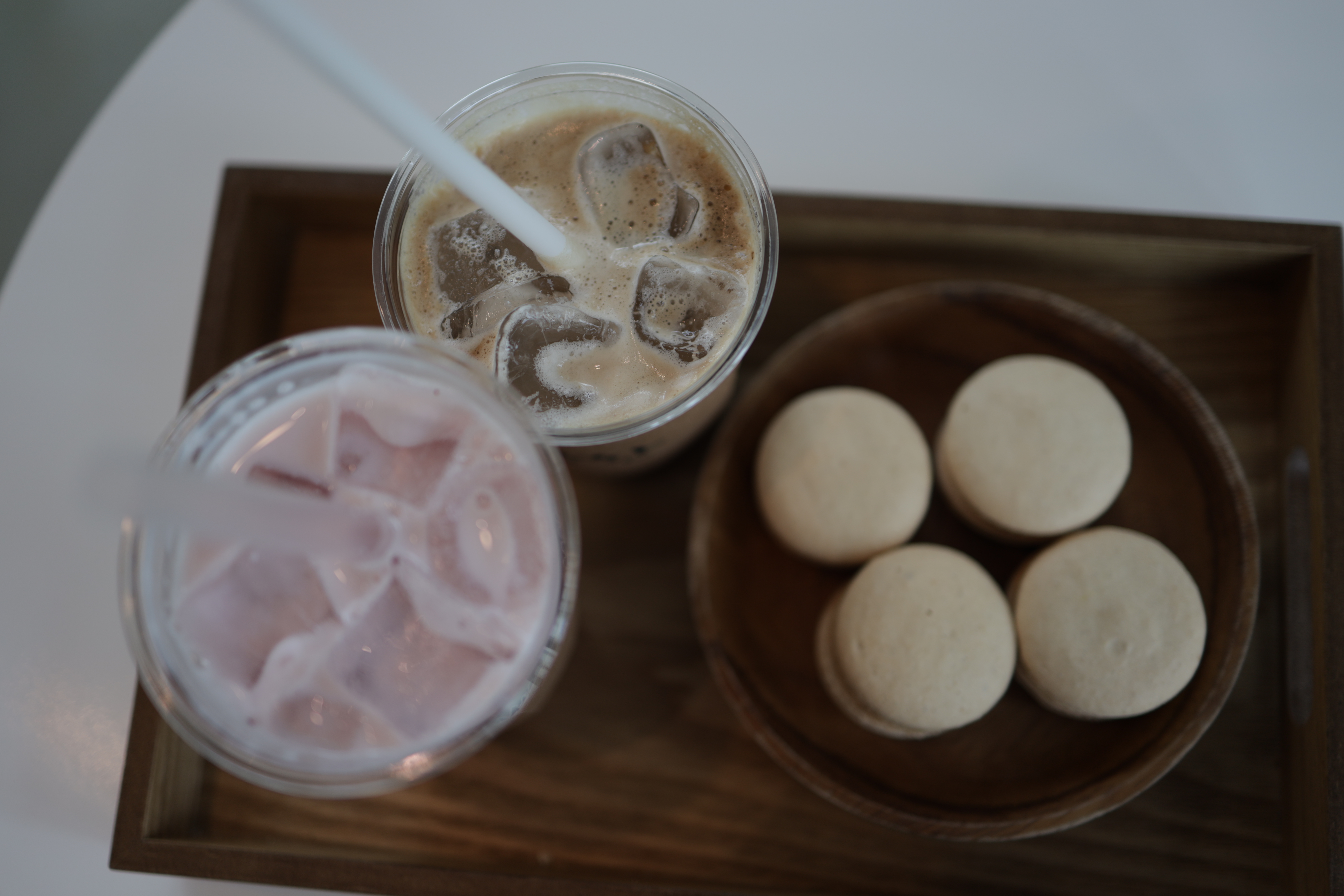 음료와 마카롱. 마카롱 색이 마치 계란 같다.