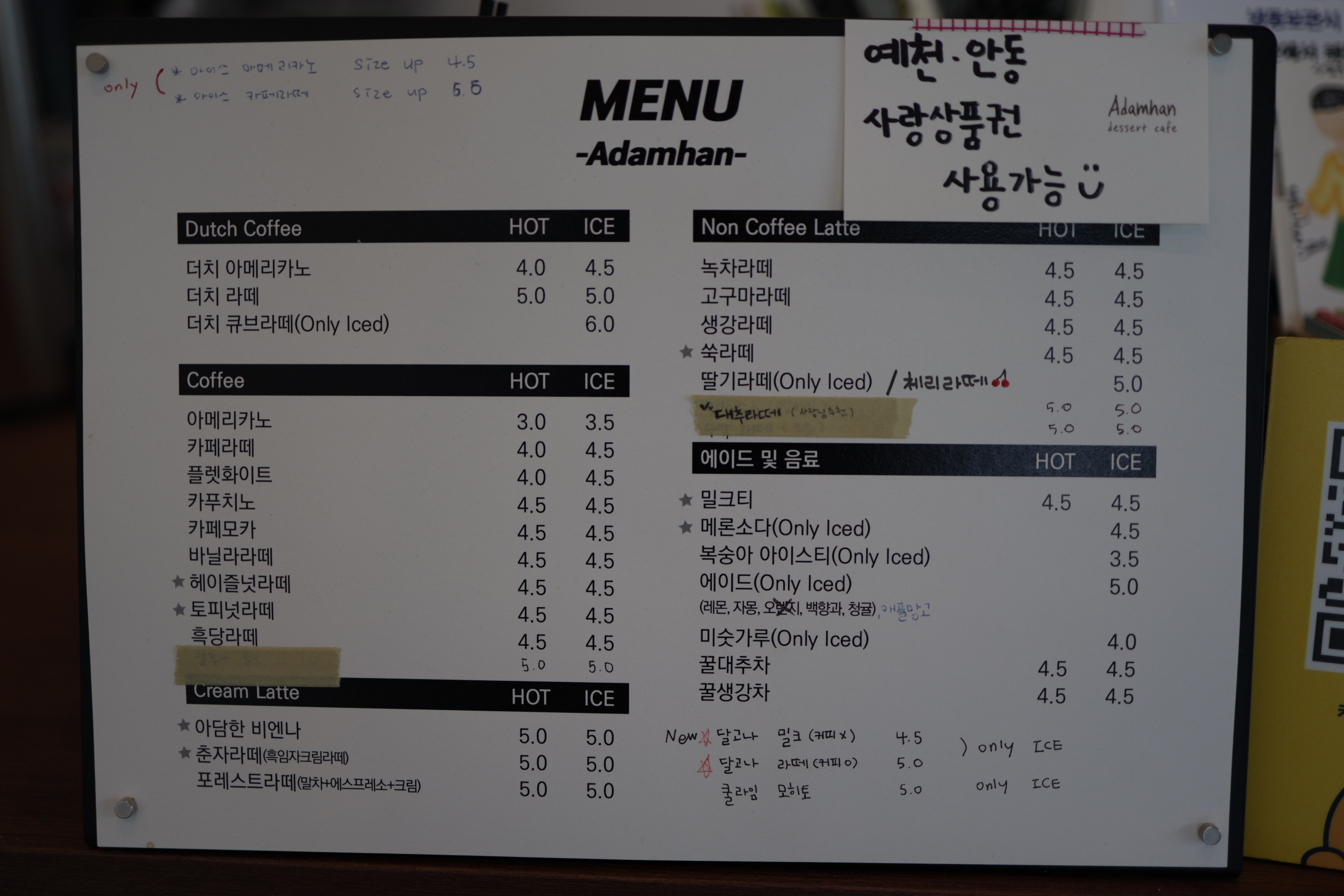 메뉴판. 안동사랑상품권과 예천사랑상품권을 동시에 사용할 수 있다는게 특이하다. 다양한 음료들이 준비되어 있다. 달고나 라떼 추가되었군.밀크티가 맛있어서 밀크티 먹었다. 같이 간 동생 녀석은 딸기라떼 고름 ㅋㅋ