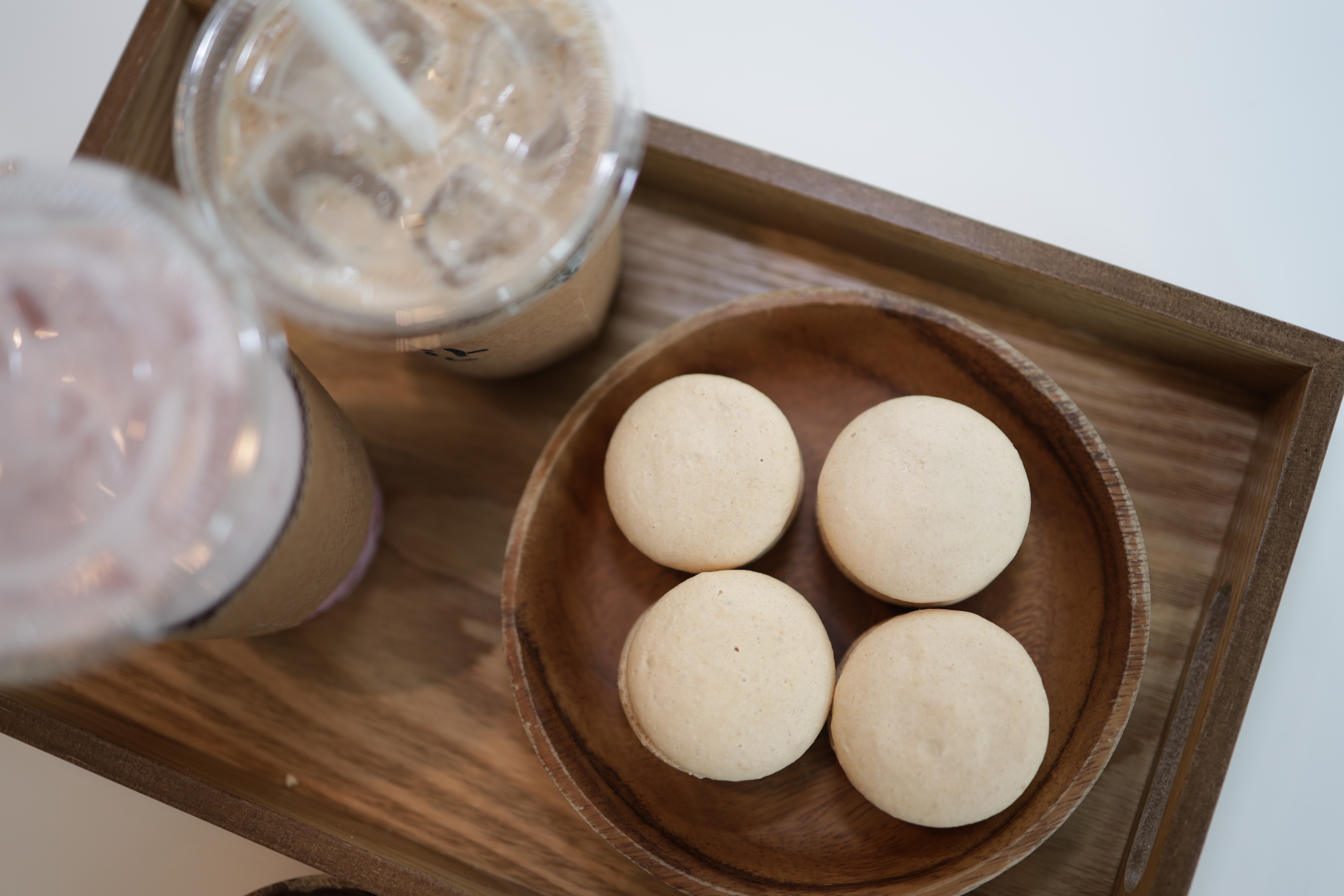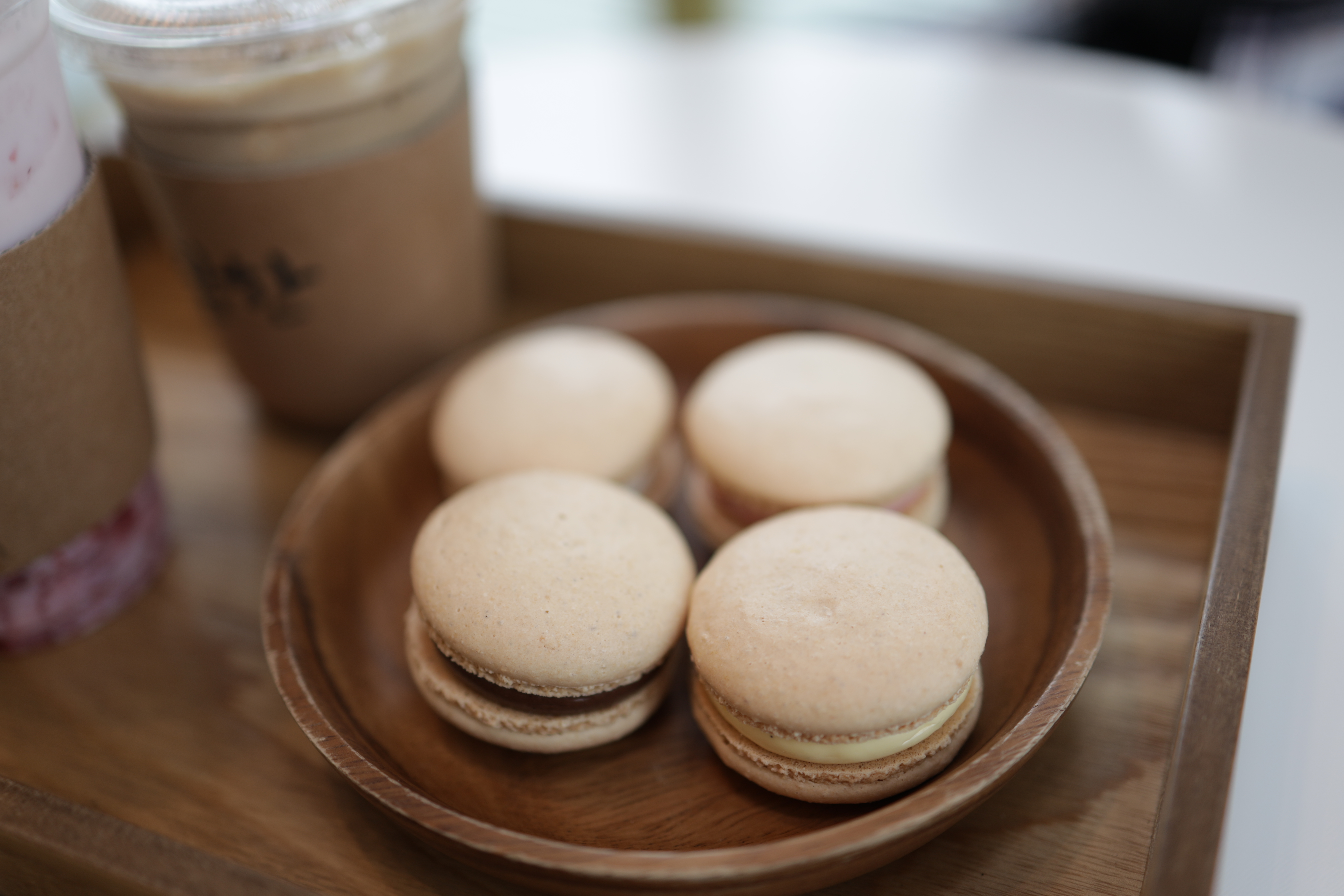 음료와 마카롱. 마카롱 색이 마치 계란 같다.
