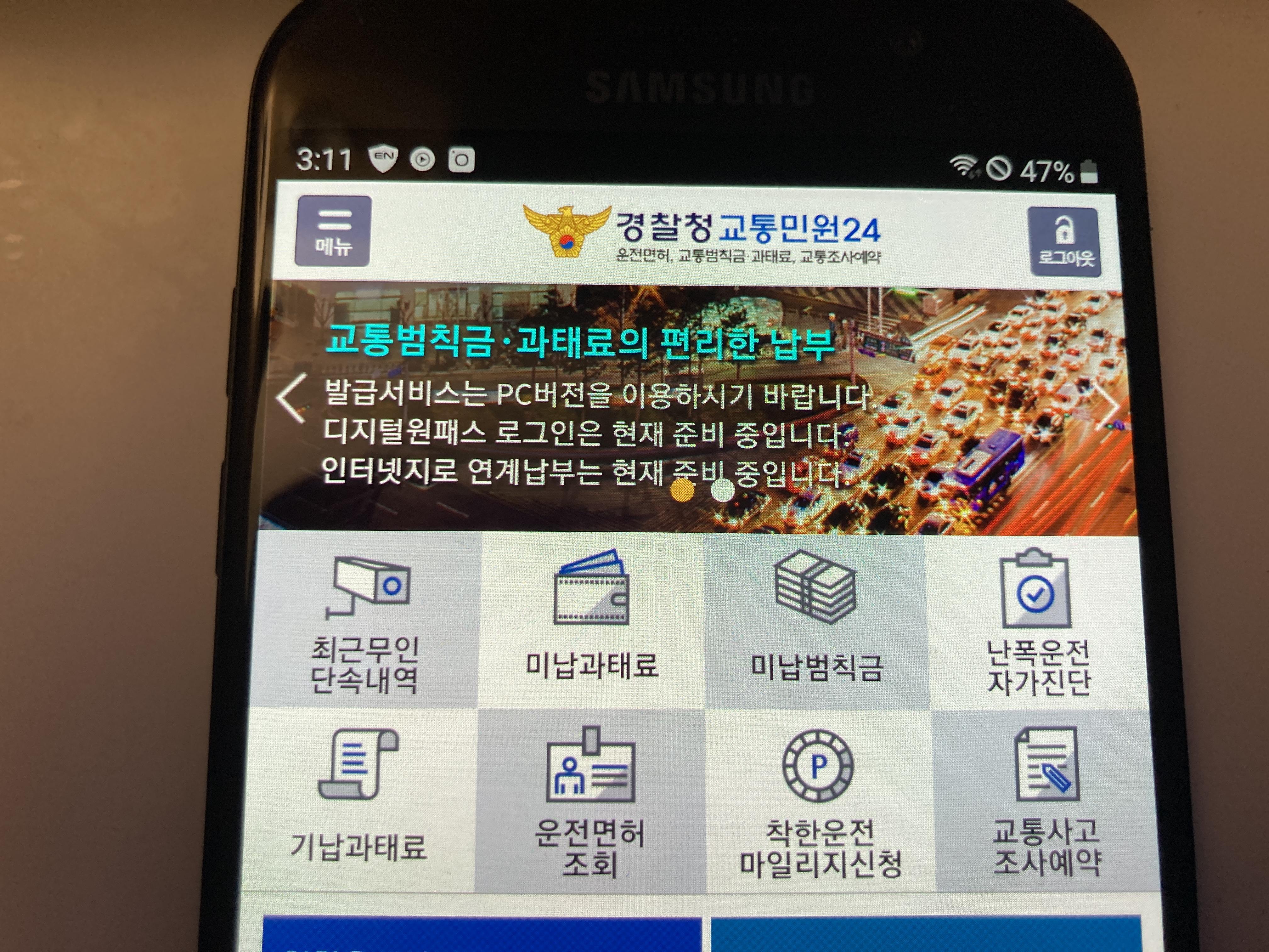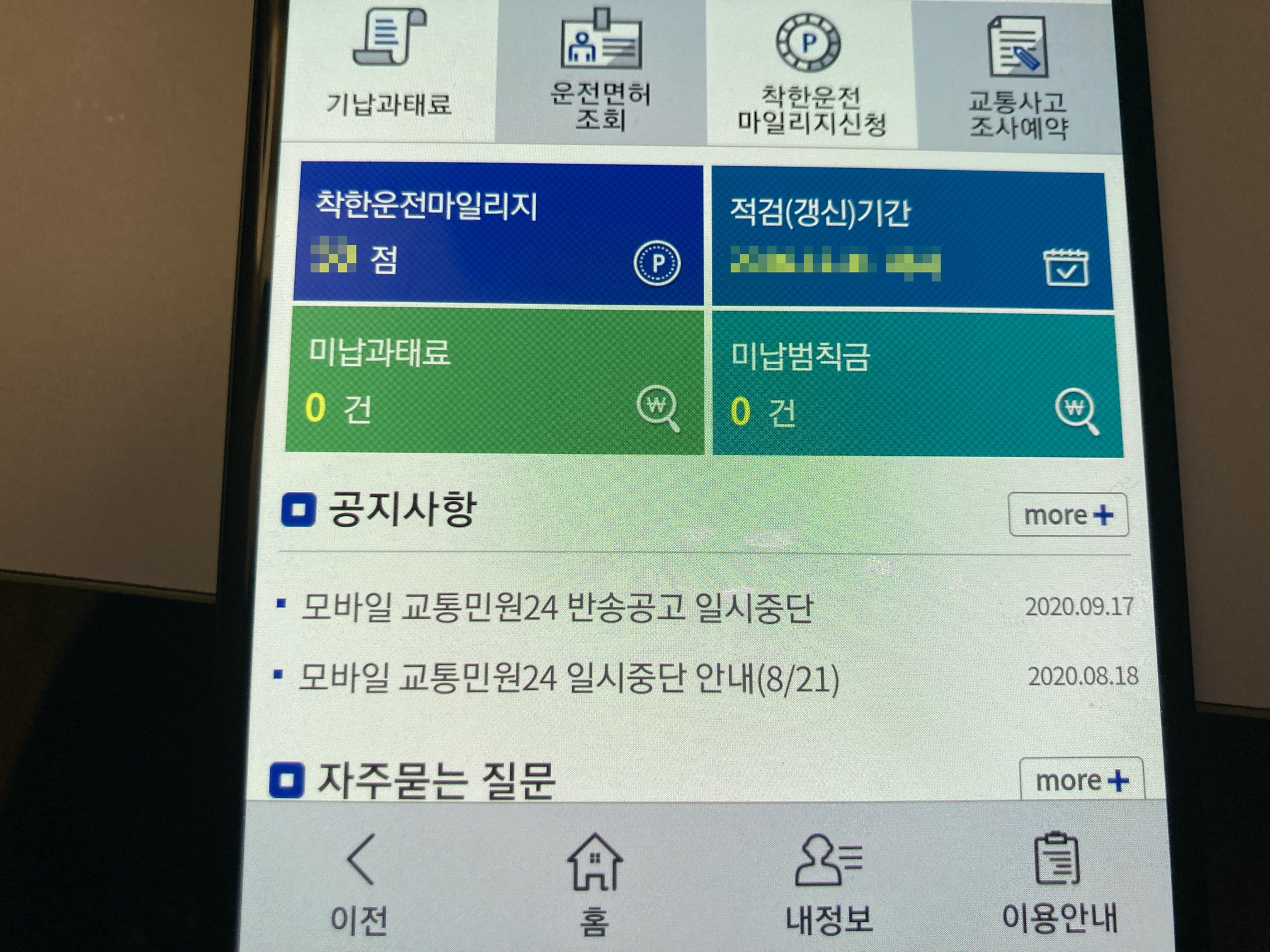 보안문제로 해당 화면은 캡쳐가 안된다. 그래서 폰으로 찍음. 스마트폰에서도 많은 항목들을 처리할 수 있다. 최근 무인단속 내역 확인부터 범칙금 확인, 착한운전마일리지 신청 등을 할 수 있어서 유용하다. 그리고 너무 편하다. 대신에 제일 처음에는 공인인증서를 스마트폰으로 옮기는 작업이 필요해서 윈도우 PC가 한 번은 있어야한다.