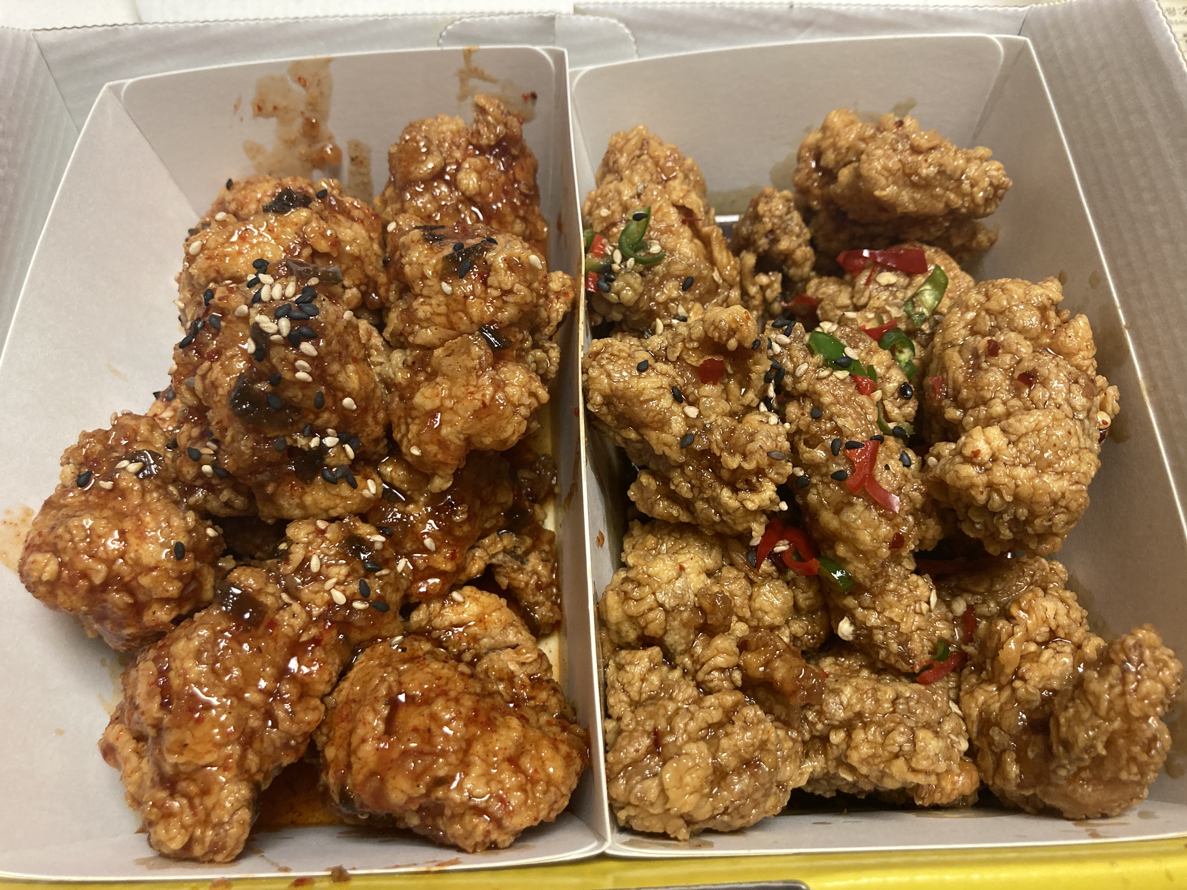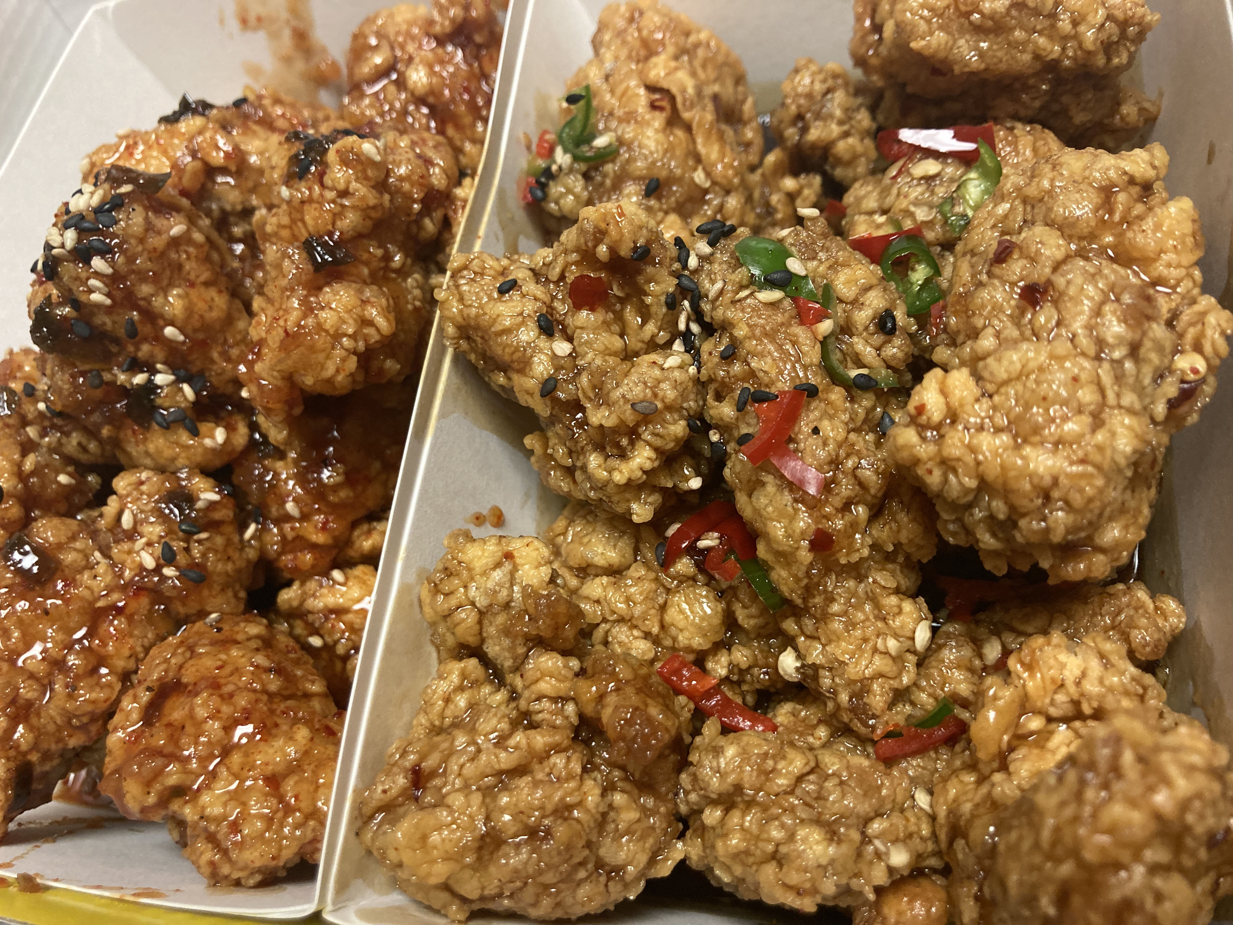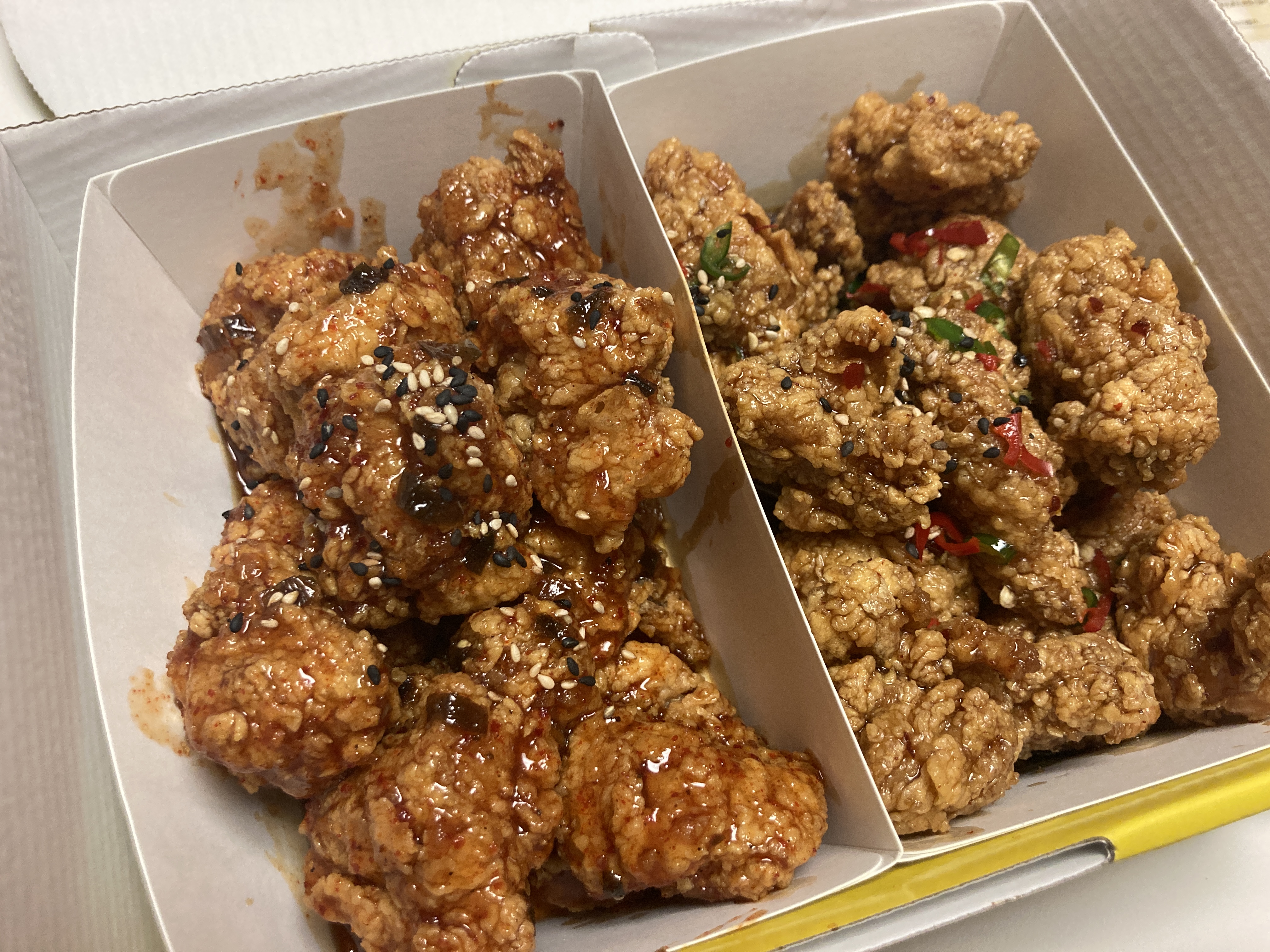 이번에 새로운 맛에 도전해보고 싶어서 이것저것 시켜봤다. 중화식깐풍 맛 하나랑 진짜고추맵닭 맛 하나로 주문.