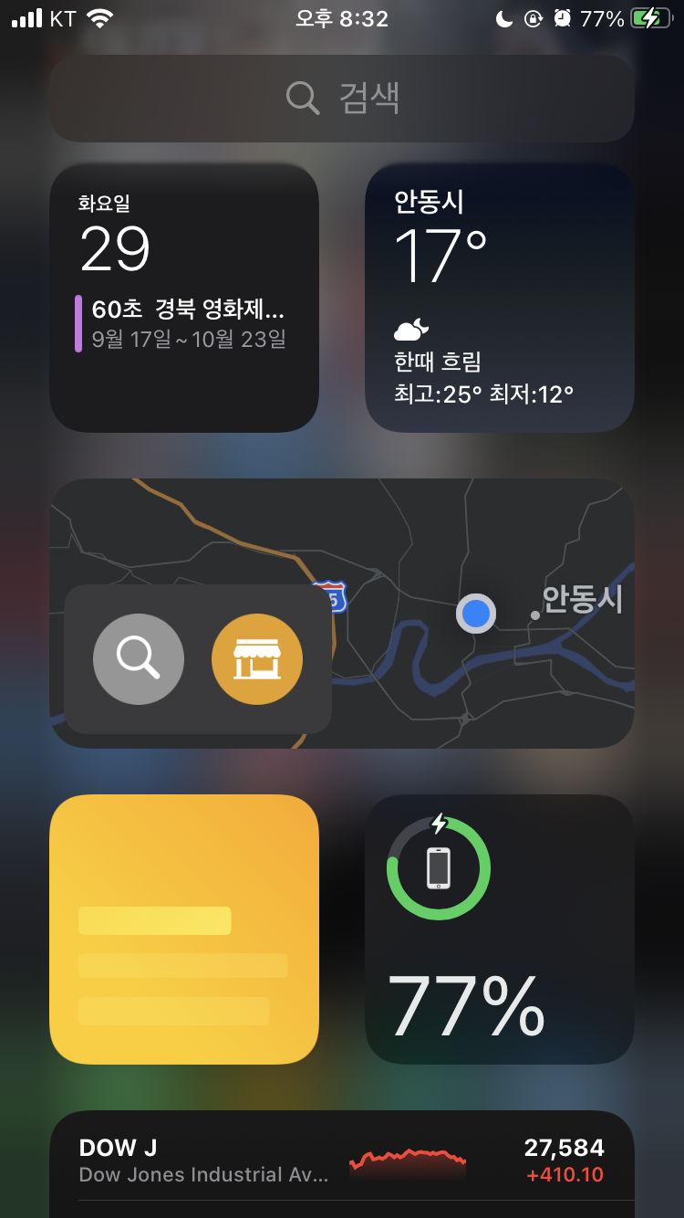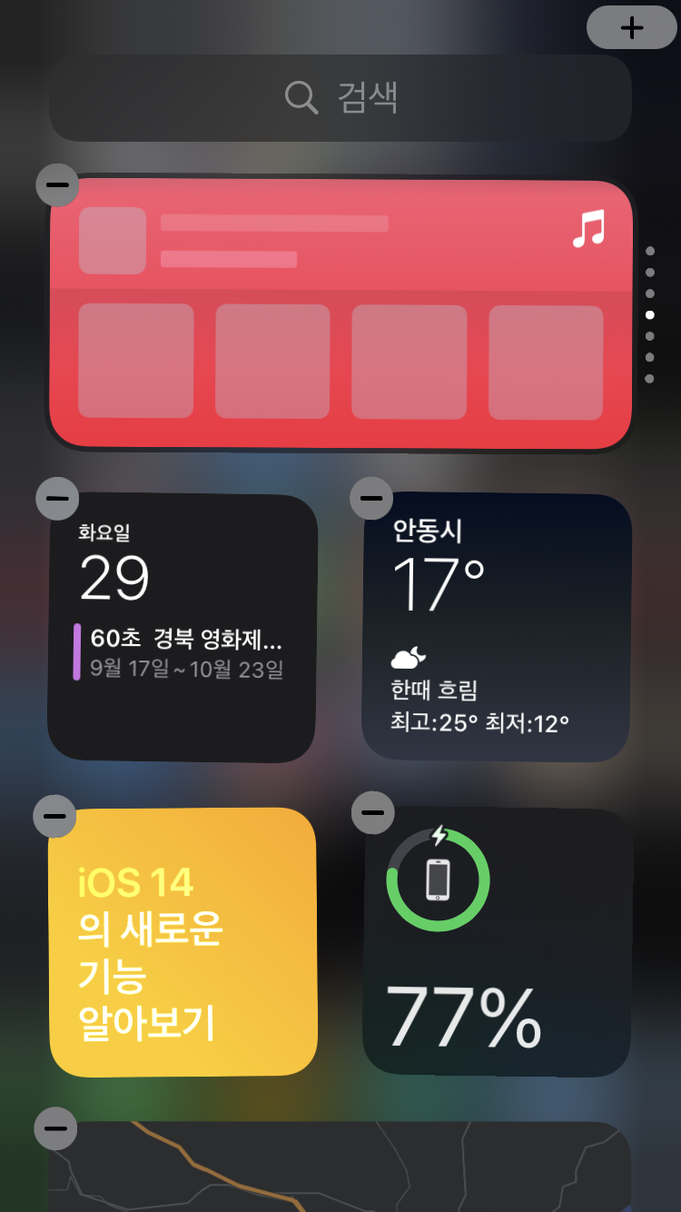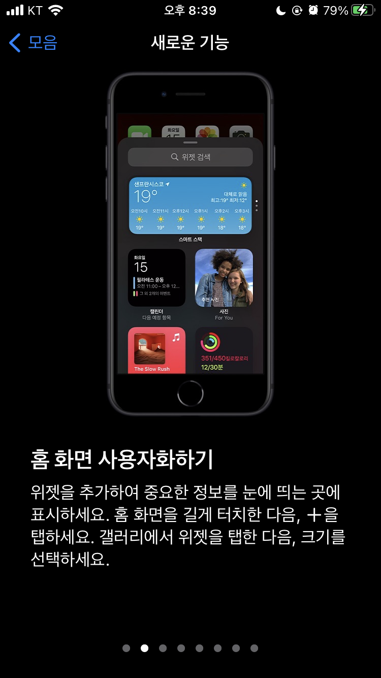 지금껏 안드로이드 운영체제와 가장 비교됐던 부분 중 하나가 위젯인데 이번에 위젯이 추가됐고 여러 방면에서 사용자화 할 수 있는 자유도가 있어서 적응이 된다면 썩 괜찮은 기능이 될거라고 보여진다. 특히 배터리, 지도, 날씨, 주가 등 원하는 위젯들을 작게 만들어서 넣어두면 한 눈에 전체 흐름을 볼 수 있어서 아주 유용하다. 홈 화면에서 왼쪽으로 한번만 쓸어주면 되니까 간편하다.