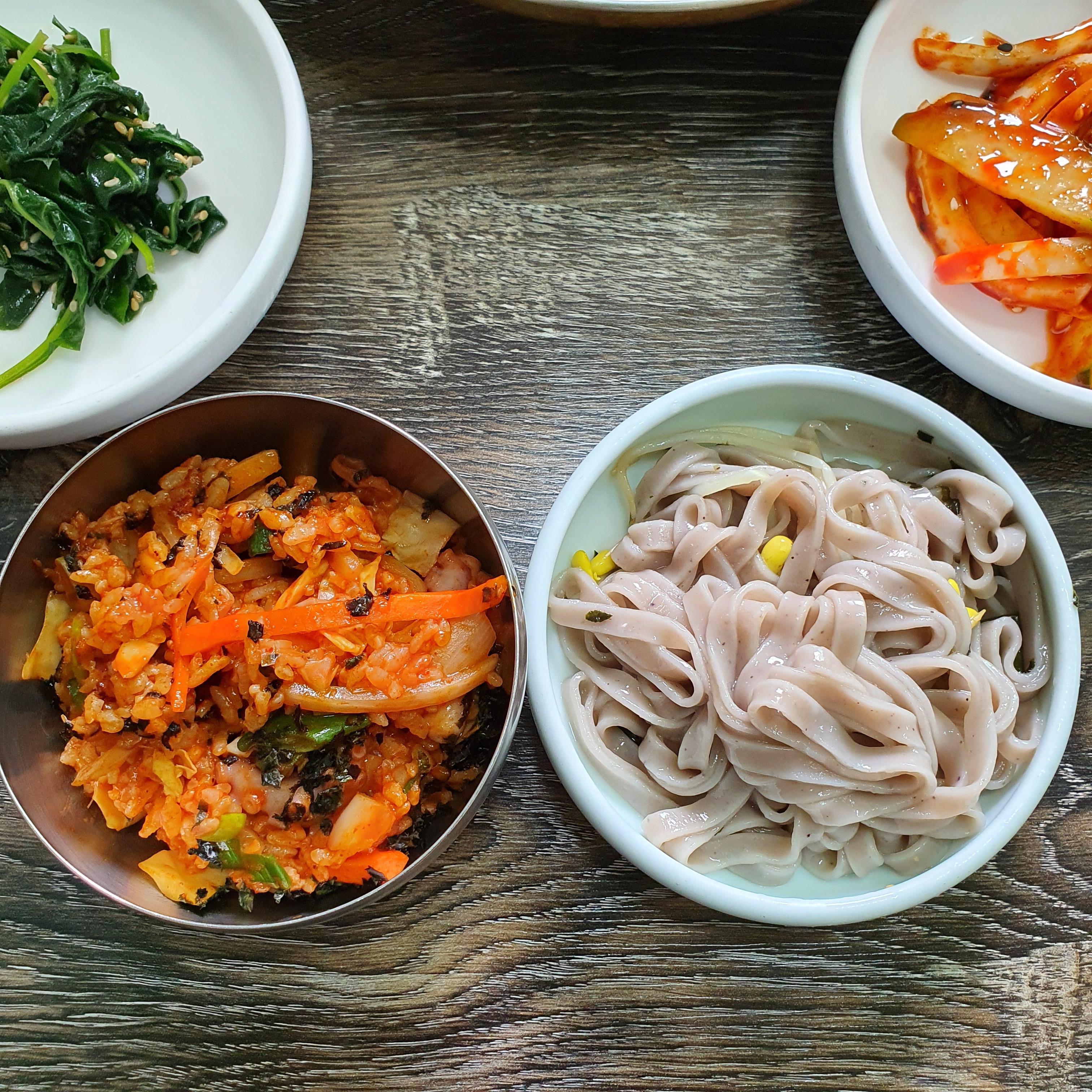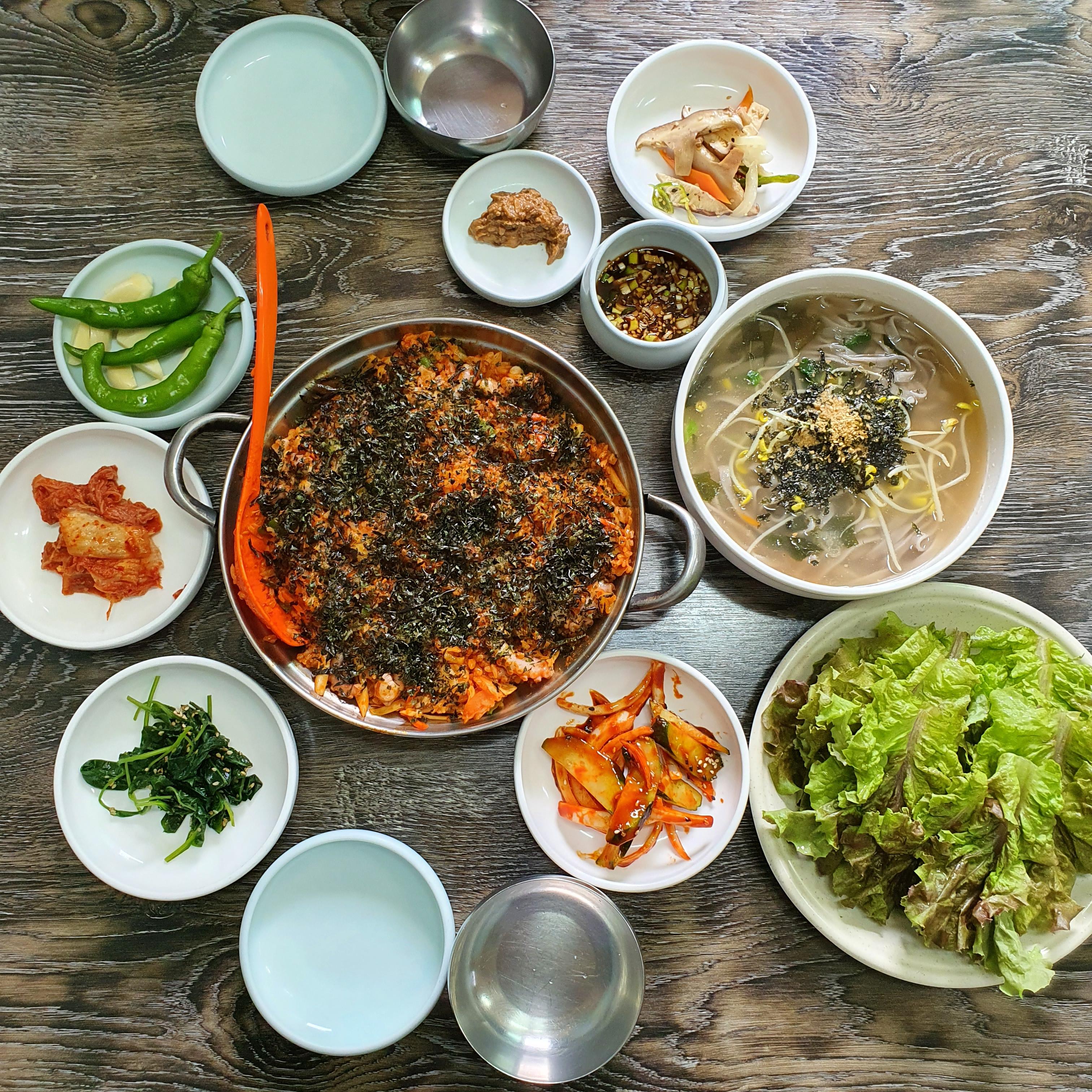 처음 가봐서 직원분께 메뉴를 추천받았는데 낙지볶음밥 2인분과 칼국수를 추천해주셔서 이 조합으로 골랐다.