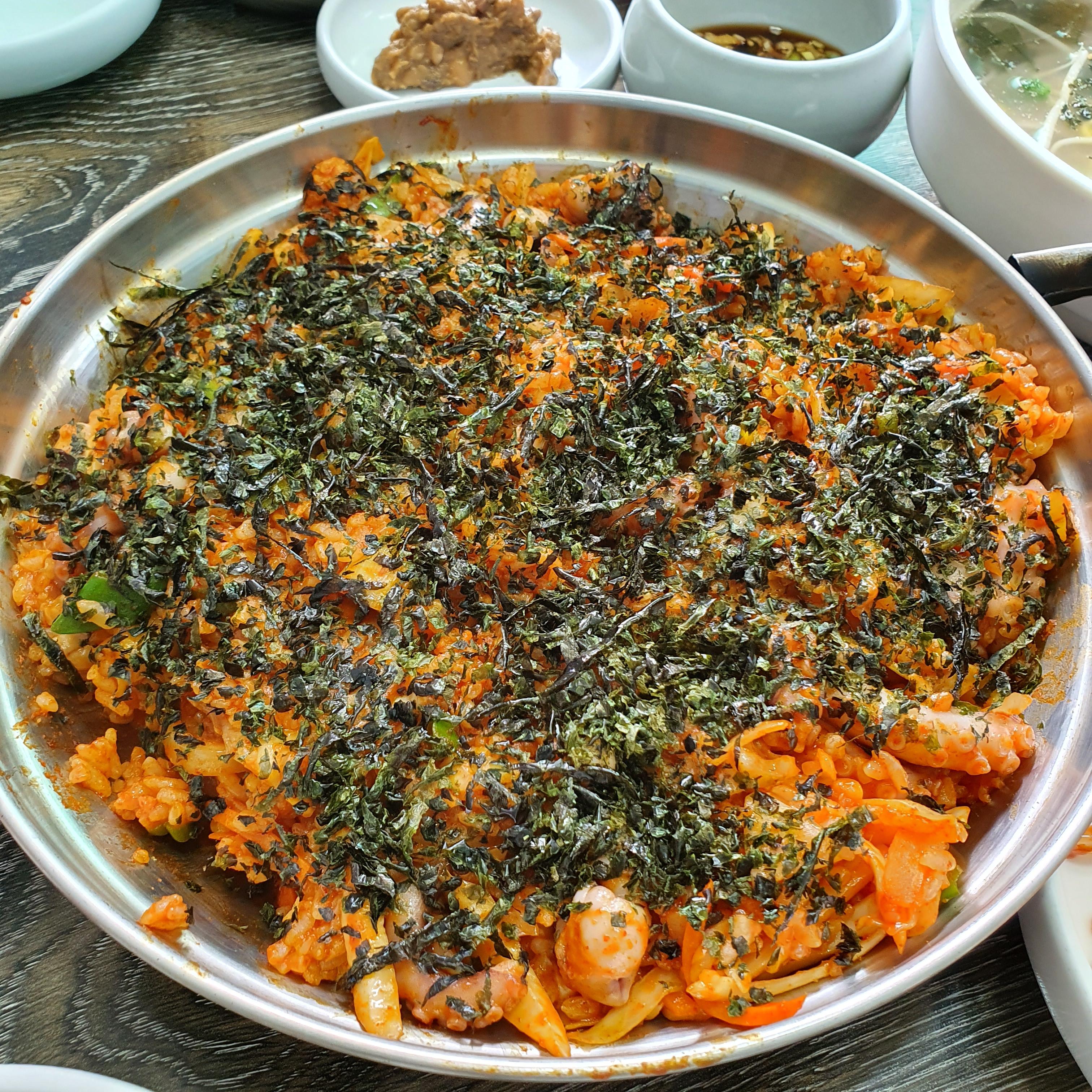 낙지볶음밥. 다 볶아서 나오기 때문에 바로 그냥 먹으면 된다. 약간 꼬들한 스타일이라서 무난하다. 촉촉하게 먹을려면 칼국수 국물을 국처럼 먹으면 된다 ㅋㅋ 낙지도 푸짐하게 많이 들었기 때문에 가성비도 굿!