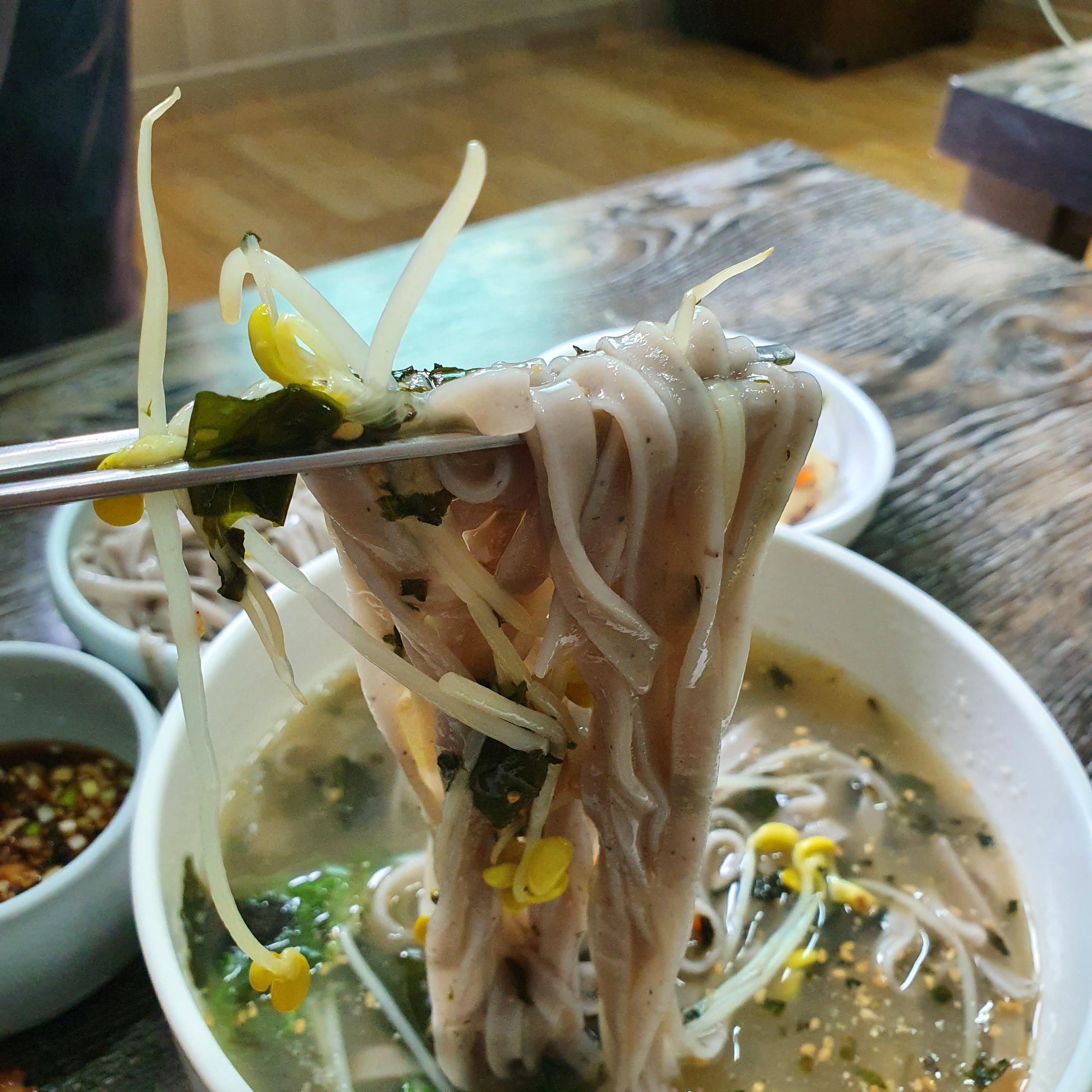 칼국수. 별도로 메뉴를 말한적은 없는데 기본 검은콩 칼국수로 나온것 같다. 국물이 와~~ 진짜 진국이다. 내 블로그를 오래도록 구독해오고 찾아주신 독자분들은 익히 알겠지만, 내 블로그에는 칼국수가 거의 없다. 왜냐하면 내가 칼국수를 별로 안좋아하거든. 잔치국수는 좋아하는데 칼국수는 이상하게 안땡겨서 별로 선호하는 편이 아닌데 여기 칼국수는 진짜 부드럽고 정말 맛있다. 면도 면이지만 국물이 진짜 와~~ 대박