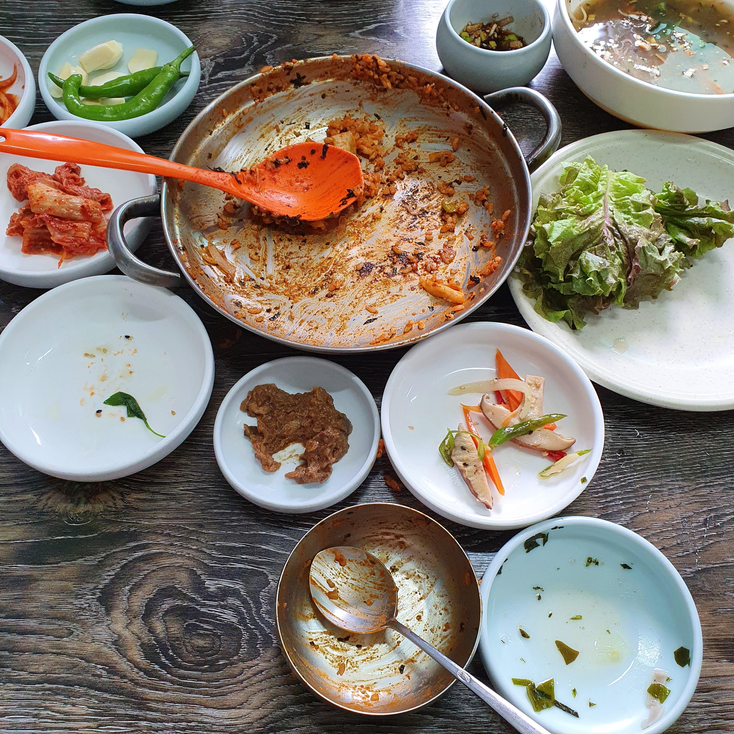 밑반찬들은 나물 종류들로 건강하면서도 간단하게 차려진다. 오이 진짜 맛있었다. 버섯도 굿. 의외로 김치에는 손이 잘 안가더라. 낙지볶음 자체에 어느정도 매운맛이 있어서 고추에도 손이 잘 안가게 됐다. 그런데 같이 주는 장물(칼국수용)과 된장이 진짜 레전드였다. 안동 전통식 스타일 ㅎㅎ 내 스타일 ㅎㅎ