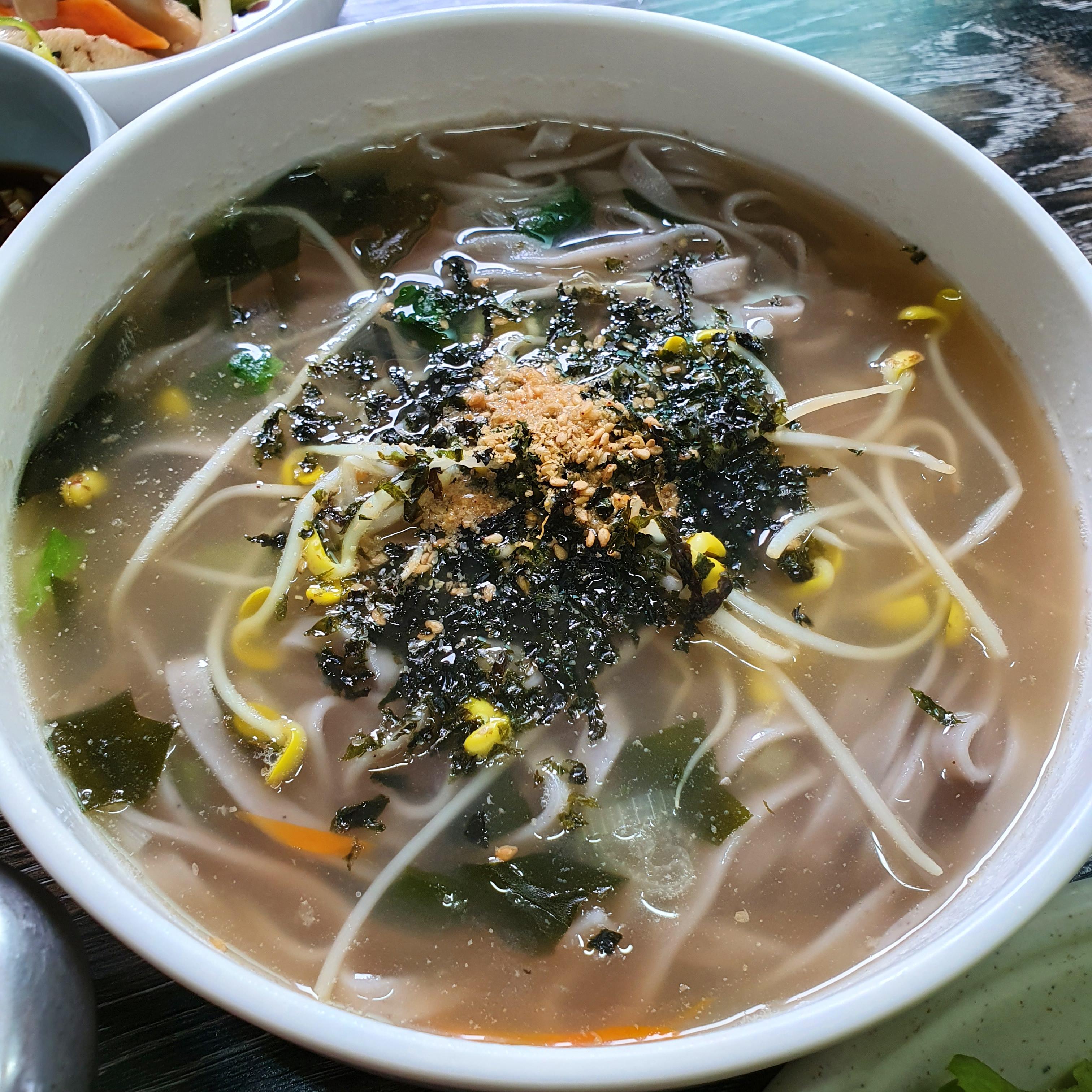 칼국수. 별도로 메뉴를 말한적은 없는데 기본 검은콩 칼국수로 나온것 같다. 국물이 와~~ 진짜 진국이다. 내 블로그를 오래도록 구독해오고 찾아주신 독자분들은 익히 알겠지만, 내 블로그에는 칼국수가 거의 없다. 왜냐하면 내가 칼국수를 별로 안좋아하거든. 잔치국수는 좋아하는데 칼국수는 이상하게 안땡겨서 별로 선호하는 편이 아닌데 여기 칼국수는 진짜 부드럽고 정말 맛있다. 면도 면이지만 국물이 진짜 와~~ 대박