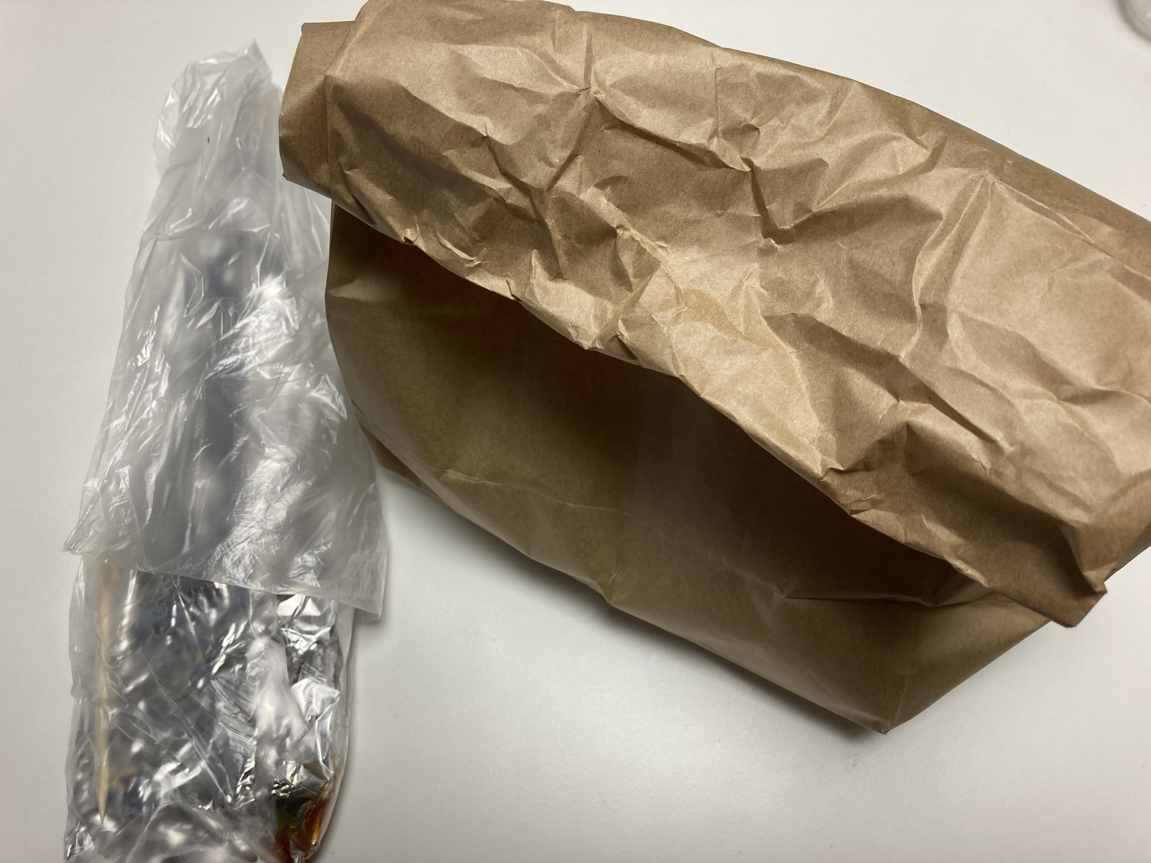 배달 안전. 든든. 닭꼬치는 소스 안흐르게 봉투에 감싸져 있다. 따뜻할 때 배달 잘되었군.