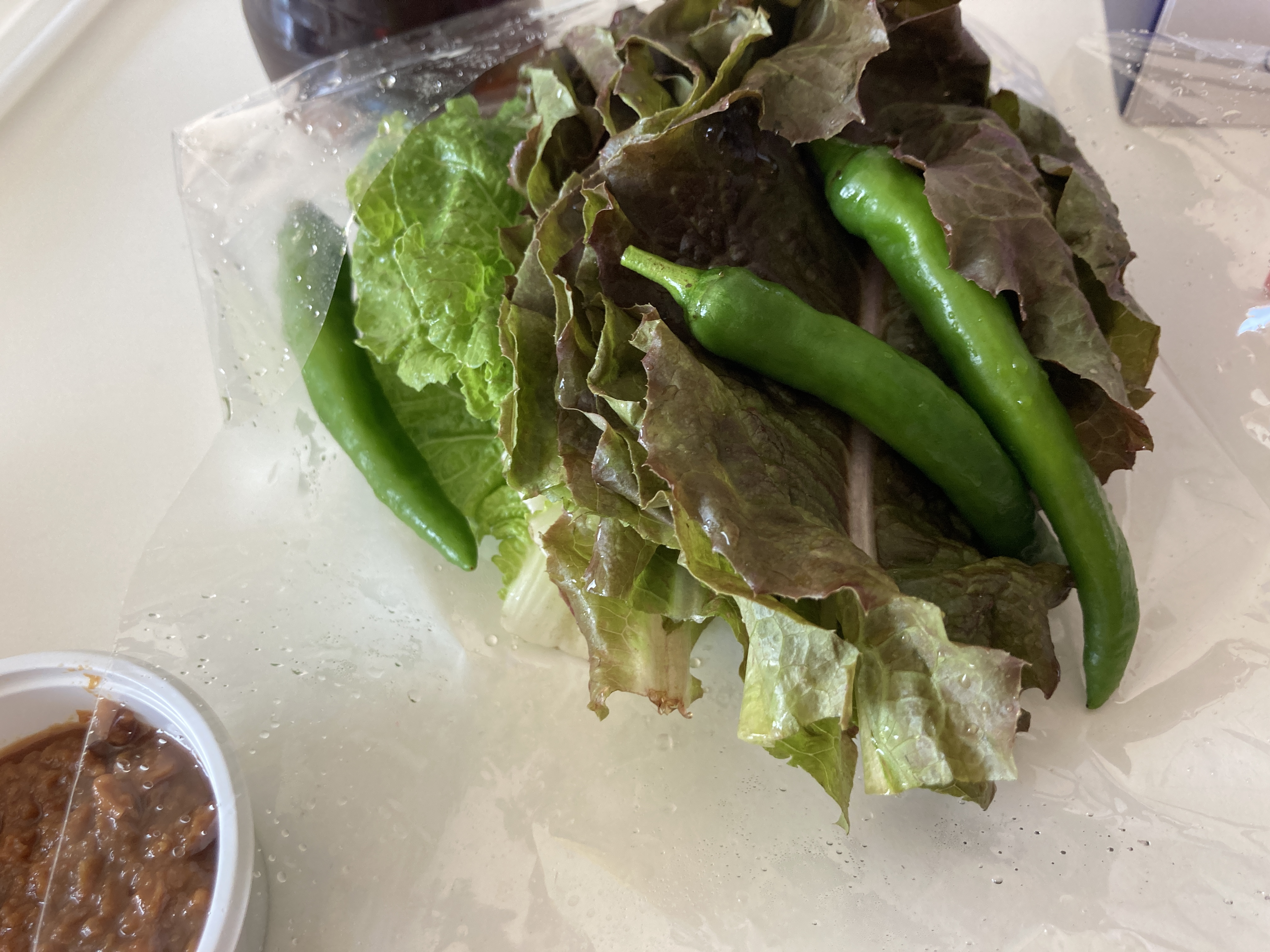 쌈채소도 꽤나 푸짐하게 제공되는데 특히 매운 고추 3개가 들어있어서 딱 좋았다.