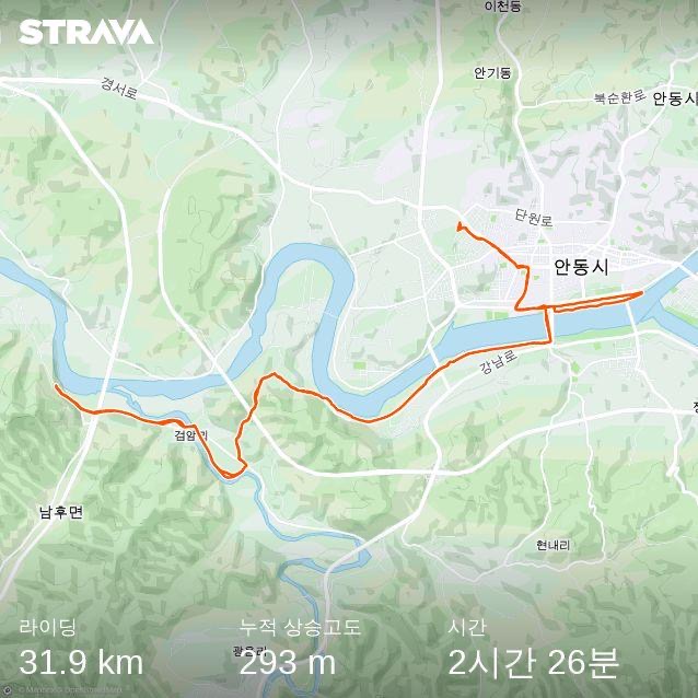 이 코스는 풍산 단호샌드파크까지 다녀오는 코스인데 전기자전거로 탈 때에는 힘을 절약할 수 있어서 2시간 안에 다녀올 수 있었지만, 로드 자전거로는 특히 업힐에서 시간이 많이 소요되고 체력도 많이 필요했던 까닭에 2시간 30분 코스, 약 3시간 코스가 되었다.