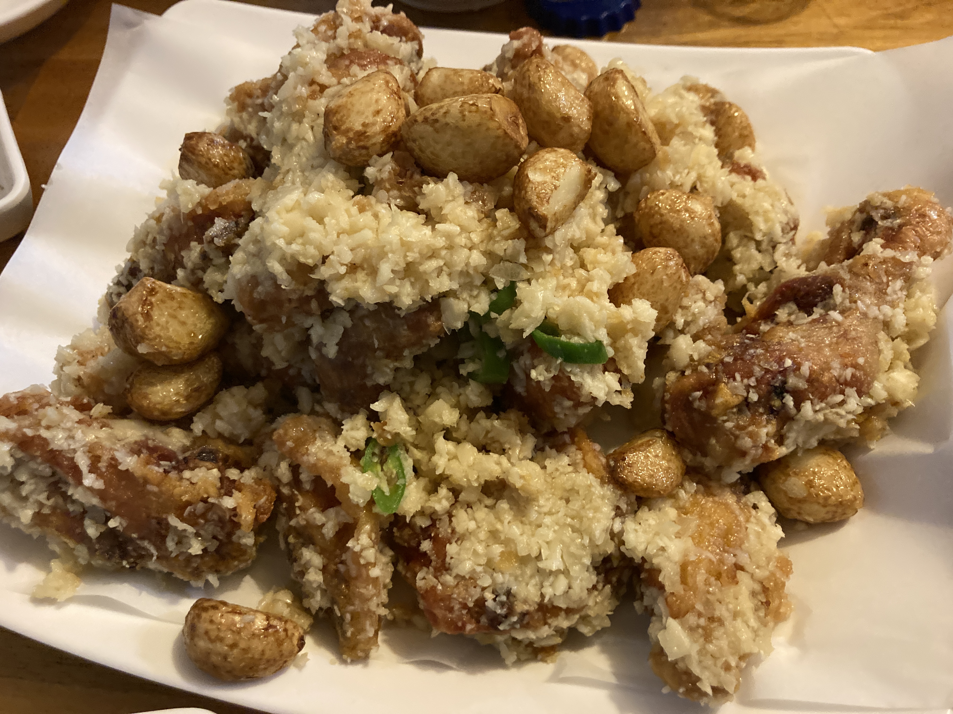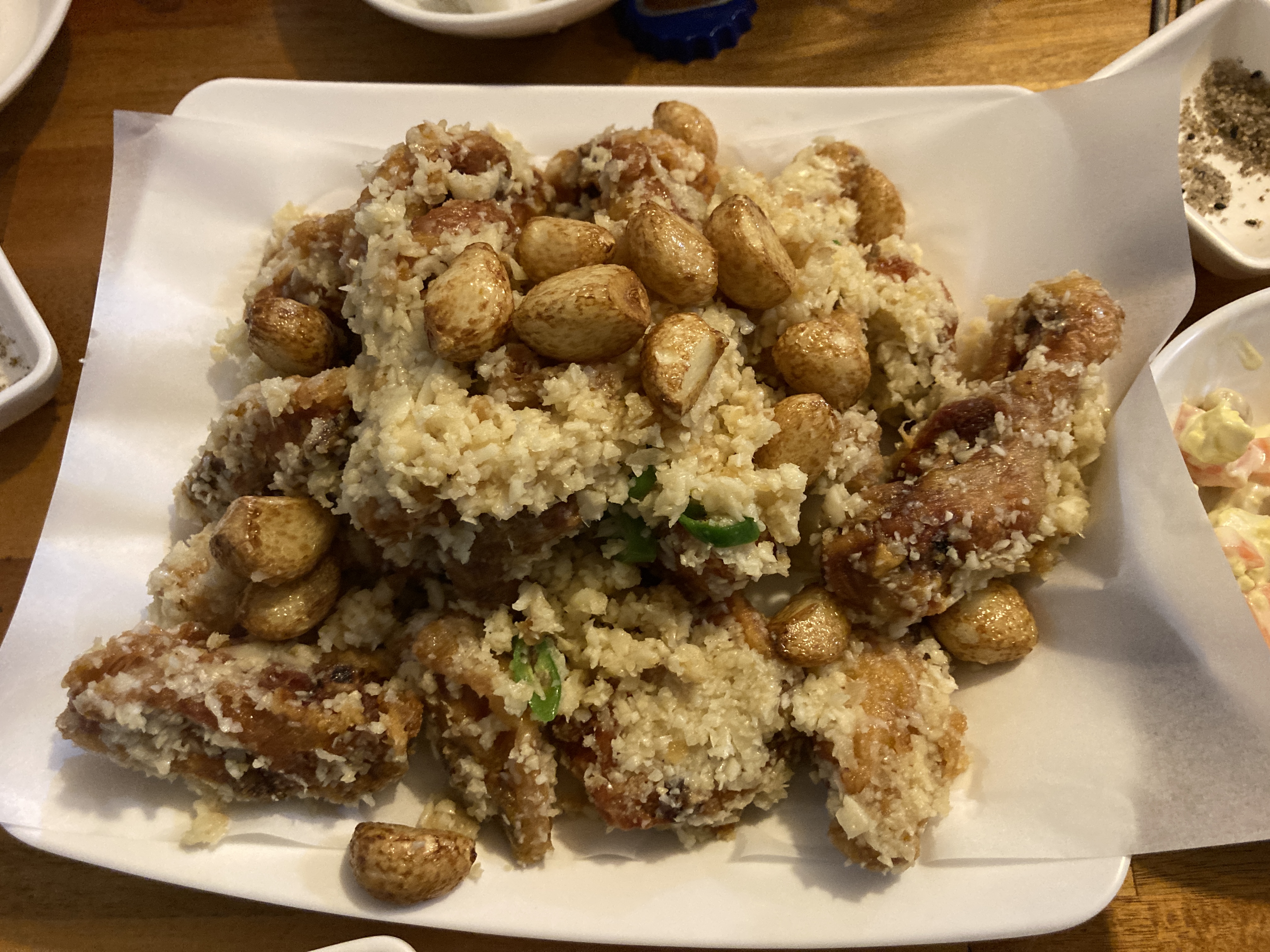 일단 배가 고파서 마늘치킨부터 우선 먹었다. 통마늘이 들어가 있는데 굉장히 매력적인 치킨이다. 운안동에 있는 실내포차라서 맛을 엄청 기대한건 아니지만 굉장히 맛있게 먹었다. 마늘도 알싸한게 마음에 들고 마늘이 듬뿍 들어가 있는게 딱 내 스타일. 의외로 분위기도 괜찮고해서 종종 가볼만 할 것 같다. 테이블도 약간 프라이빗하게 돼 있고.