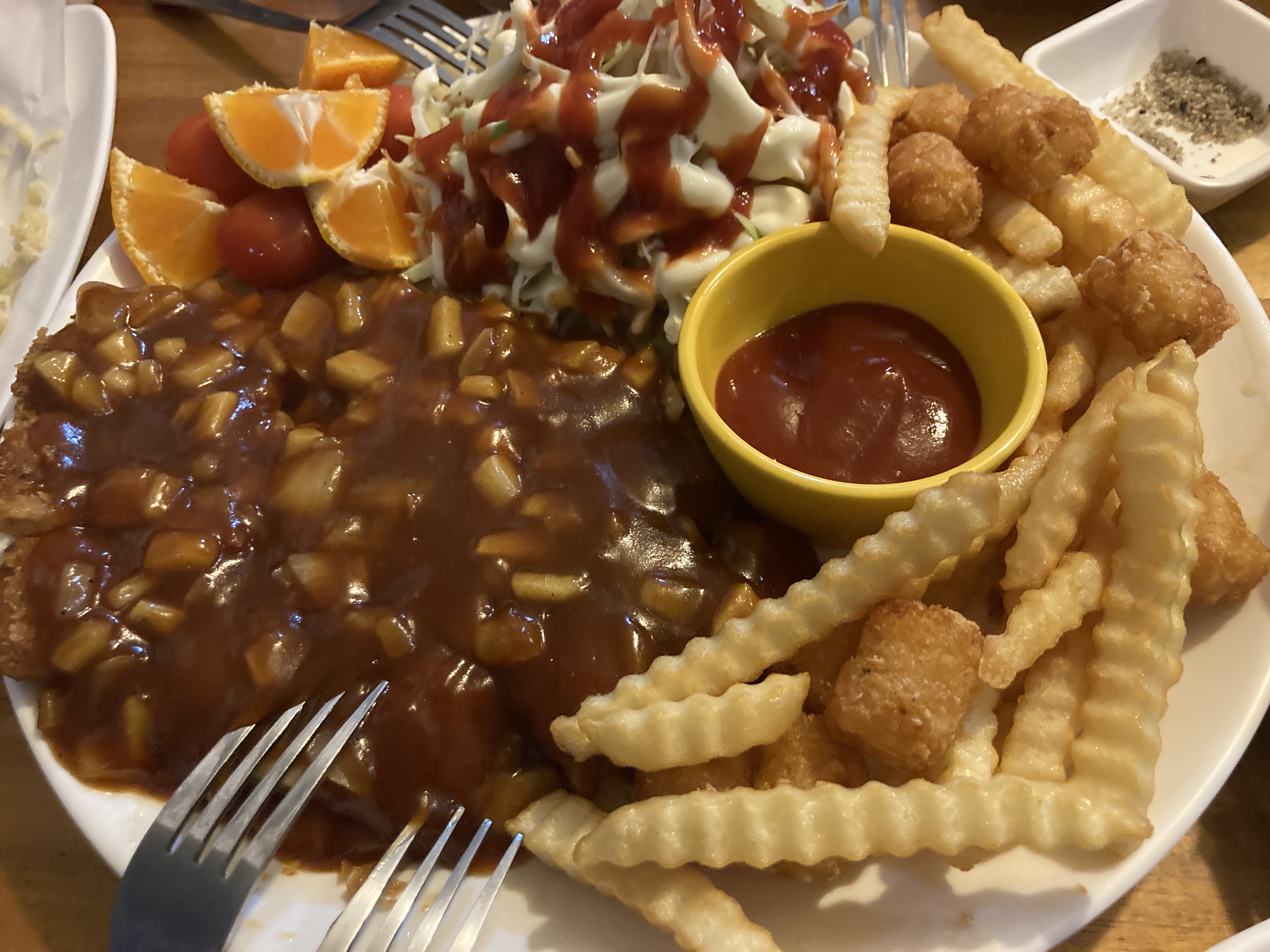 돈가스도 생각보다 맛이 괜찮았고 딱 먹기 좋게 한 입 사이즈로 잘려서 나와서 좋았다. 감자튀김이랑 과일이 있는 것도 매력적. 무엇보다 샐러드가 진짜 맛있어서 샐러드랑 술을... 먹었었네.ㅋㅋㅋ 양이 살짝 아쉬웠다.