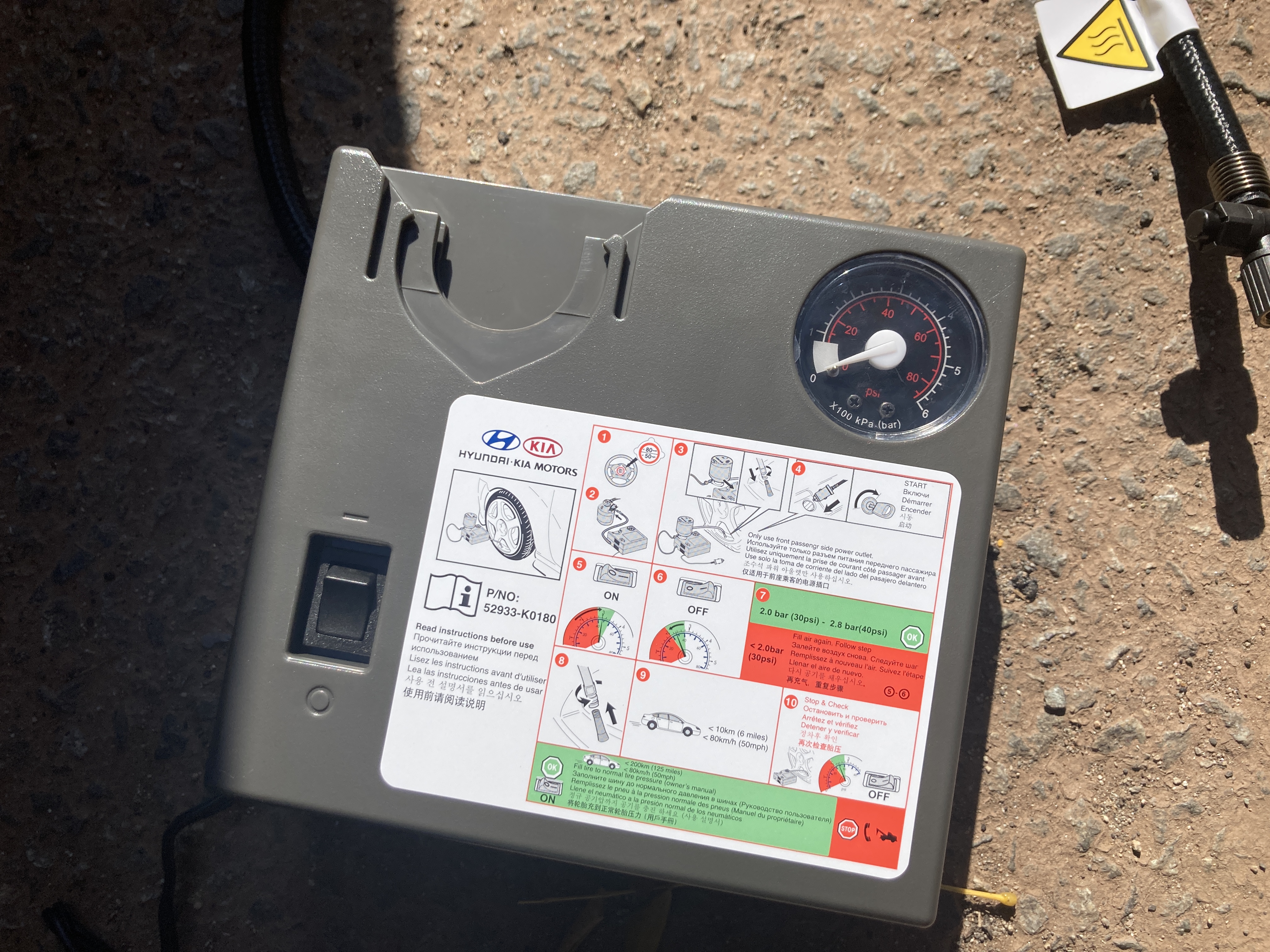 일단 이렇게 기기를 꺼낸 뒤에 보면, 자동차 담배 불 붙이는 곳에 전원을 연결하는 선이 하나가 있고, 나머지 선은 타이어에 꽂는 선이다. 우선 자동차 담배 불붙이는 곳을 열어 전원을 연결해준다. 나는 혹시 몰라서 시동을 켜 둔 채로 작업했다. 그런 다음 기기를 끌고와서 공기압을 채울 타이어 근처에 가져다 놓는다. 전선이 생각보다 꽤 길기 때문에 4쪽 타이어 모두 작업이 가능하다.