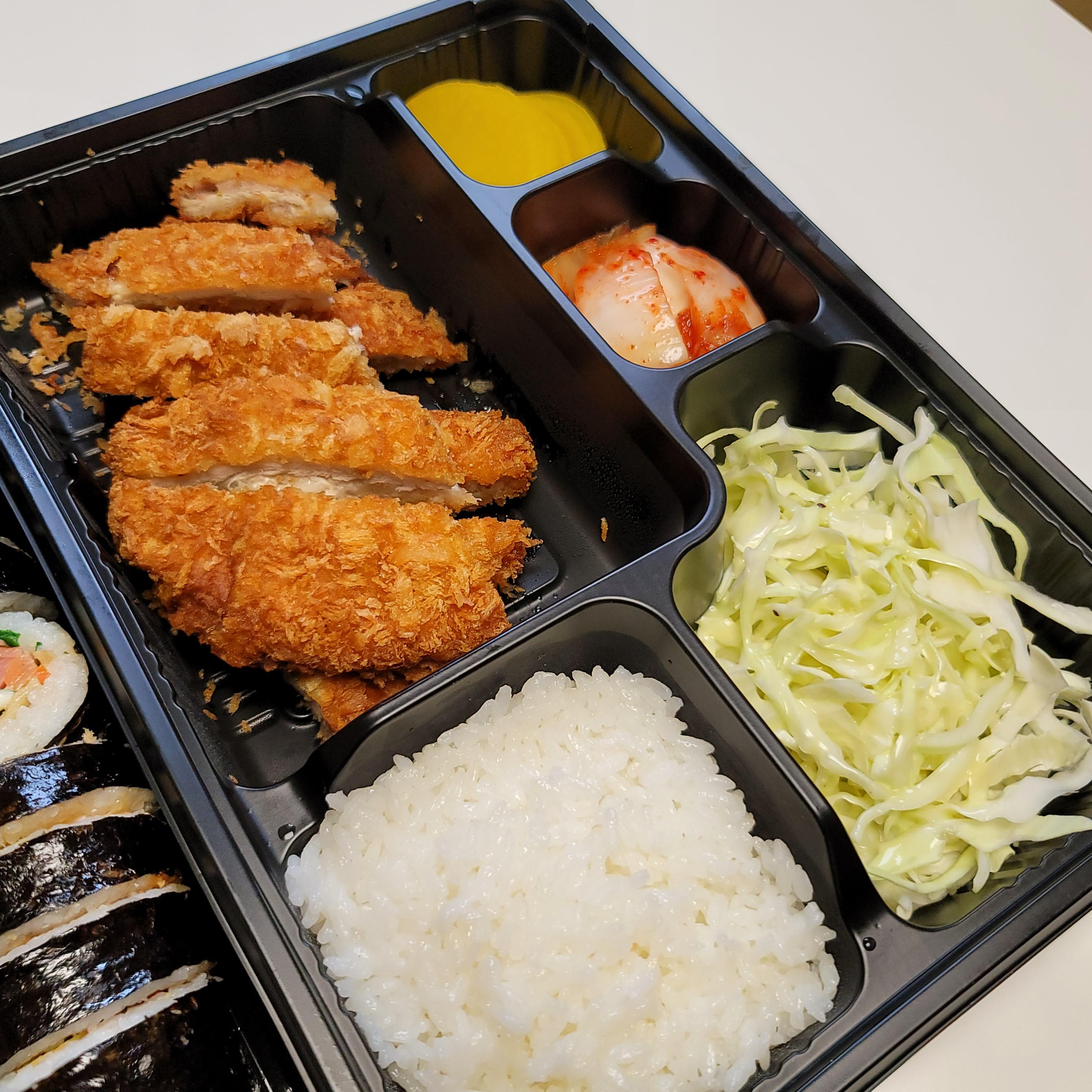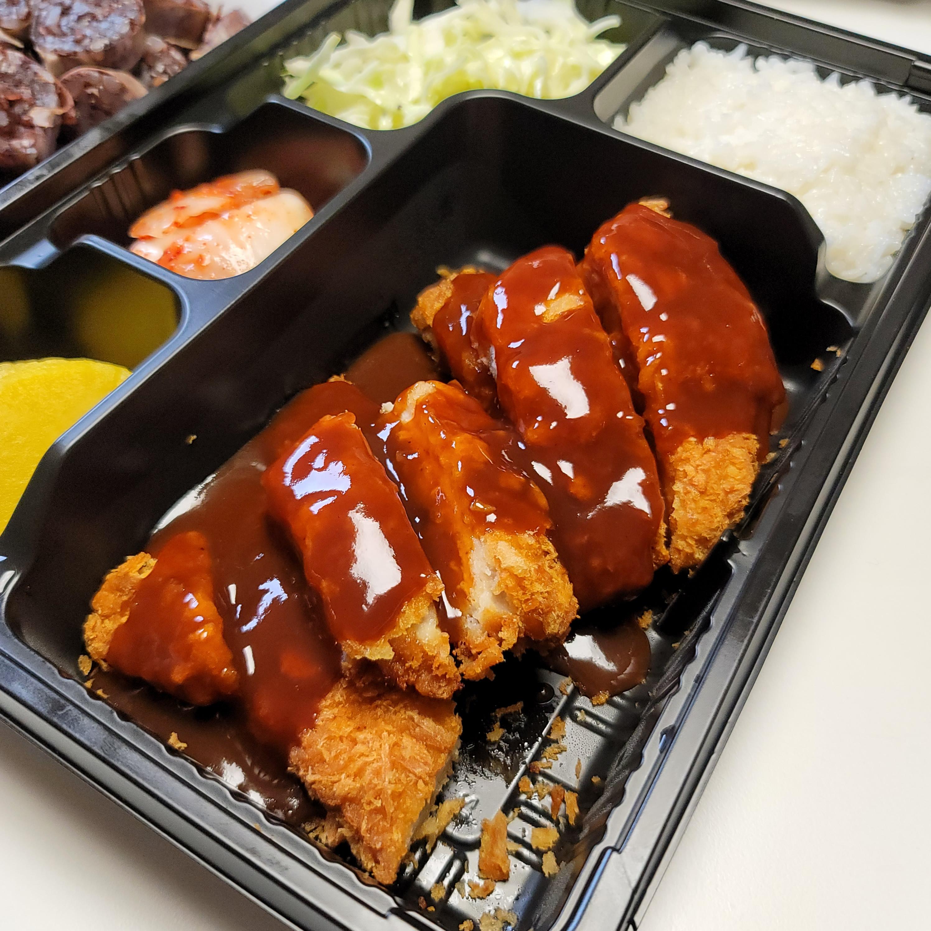돈가스. 봉맘수제등심돈가스다.; 치즈돈가스도 있는데 치즈보다는 등심이 맛날 것 같아서 등심돈가스로 골랐다. 밥 적당량 들었고 돈가스도 알맞은 양이다. 소스는 따로 준다.
