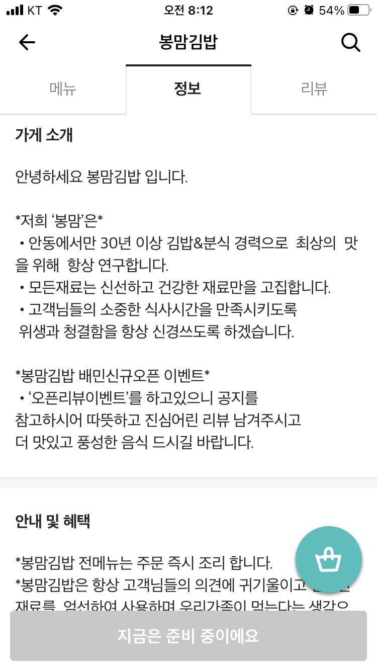배달의 민족 앱에서 봉맘김밥을 찾을 수 있다. 현재 신규 업체로 등록돼 있고 리뷰 이벤트 진행 중. 맛있는 간식을 준다. 매주 일요일은 휴무이고 평일과 토요일은 오전 11시부터 오후 8시까지 영업한다. 서부시장에 가게가 있어서 안동 거의 대부분의 지역에 배달이 가능하다.