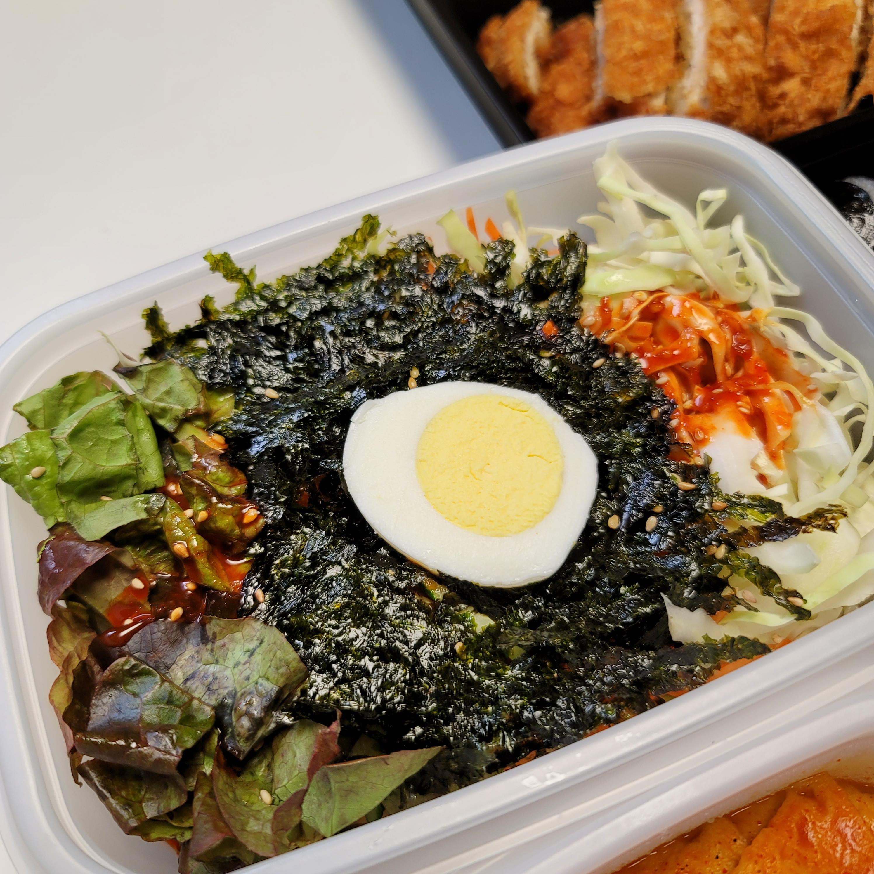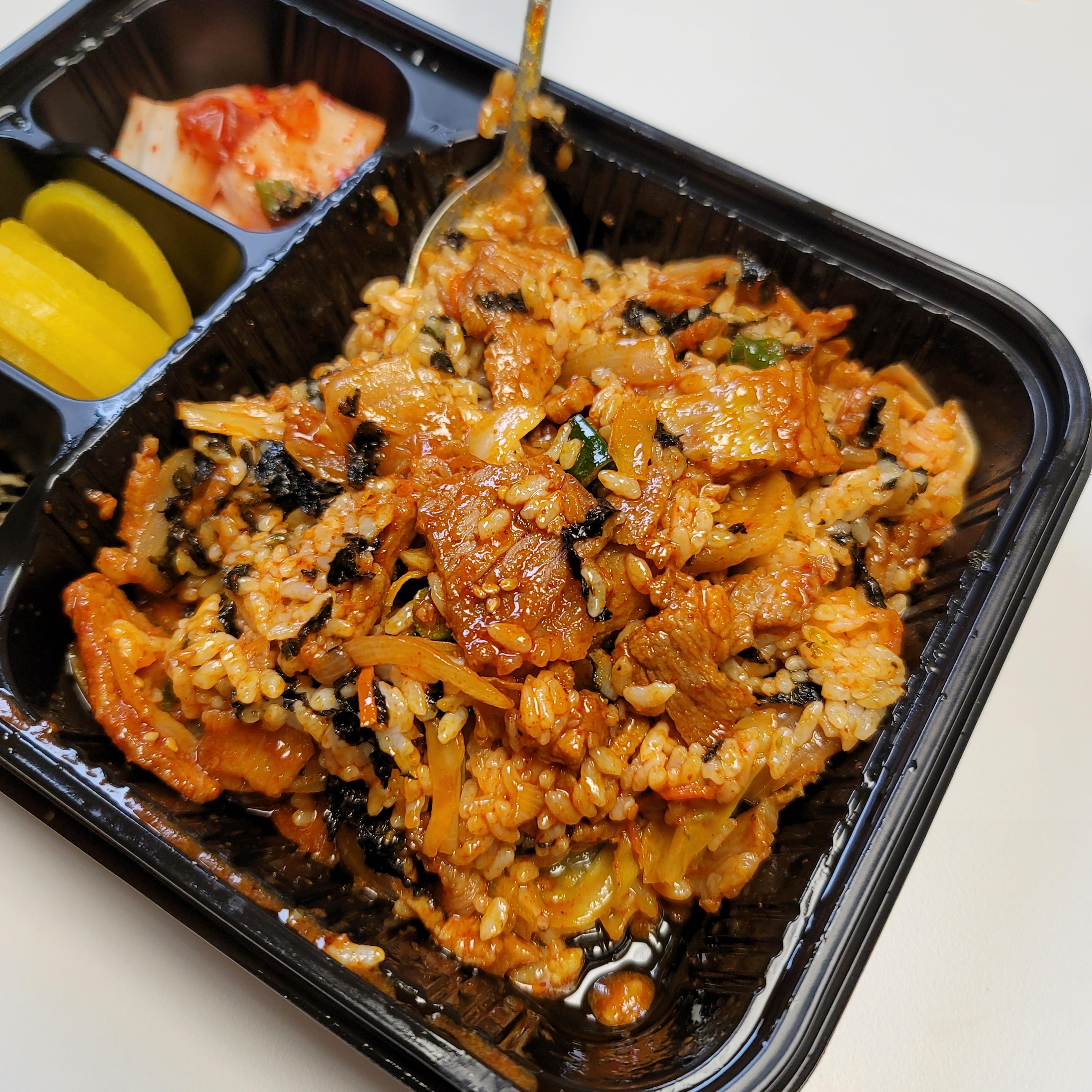 매콤제육덮밥. 푸짐한 밥에 매콤한 스타일의 제육과 김이 듬뿍 들어있는 메뉴다. 같이 주는 반찬 중에 멸치가 진짜 너무 맛있었다.