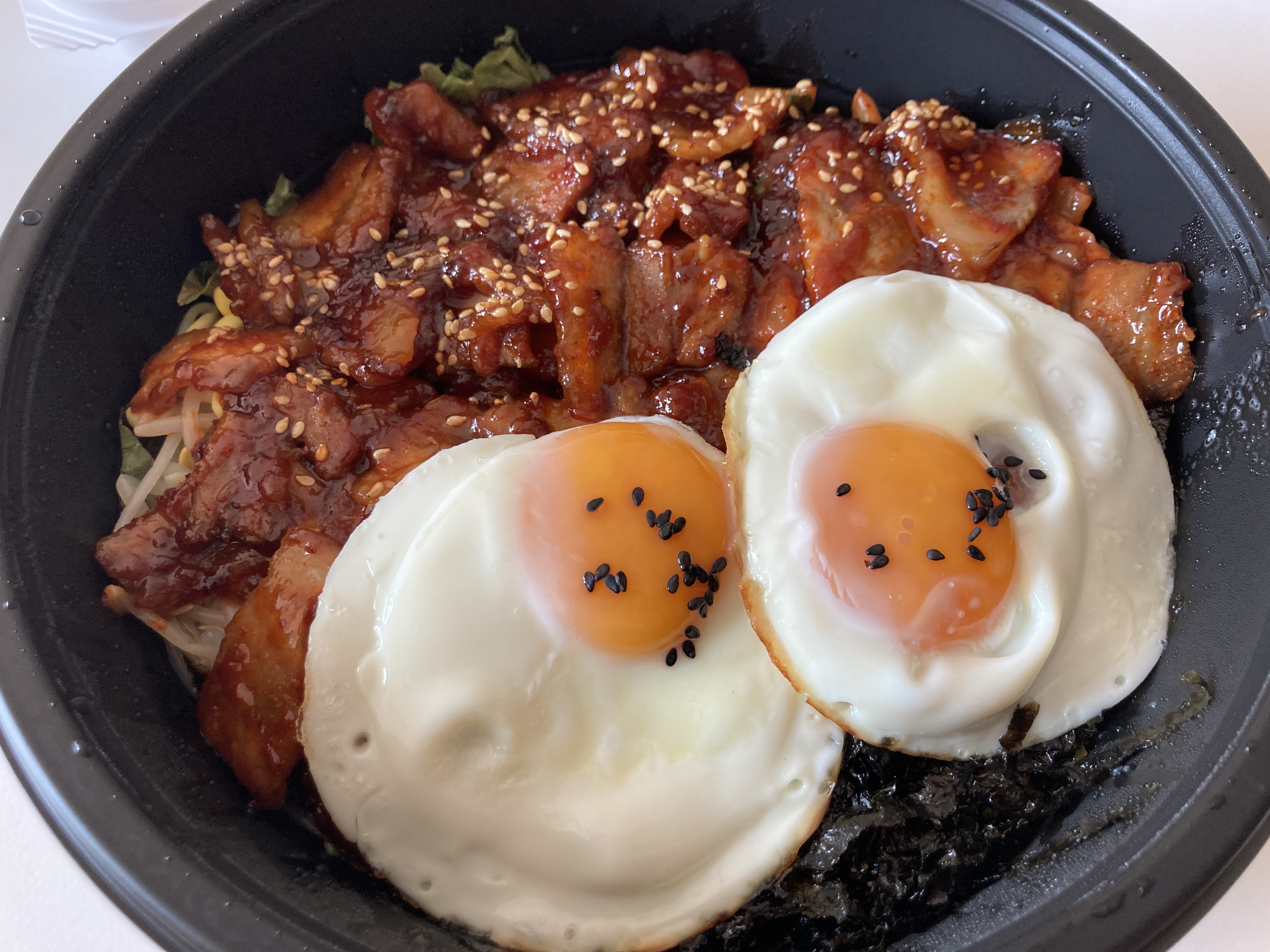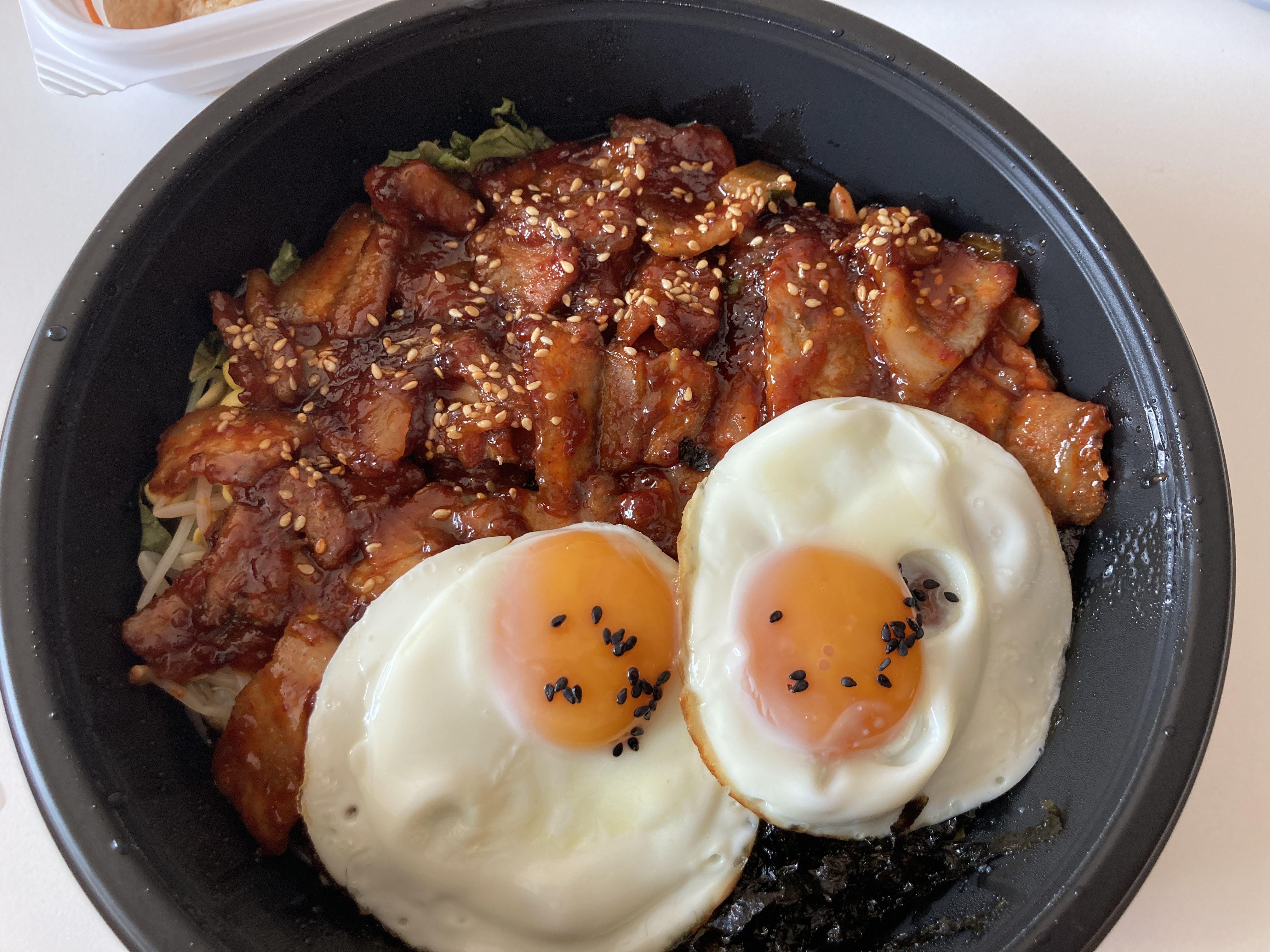 제일 기대했던 매운삼겹덮밥. 리뷰쓴다고하면 고기인지 계란후라이인지 더 넣어준다. 대접같은 그릇에 진짜 양이 많은 덮밥이다.