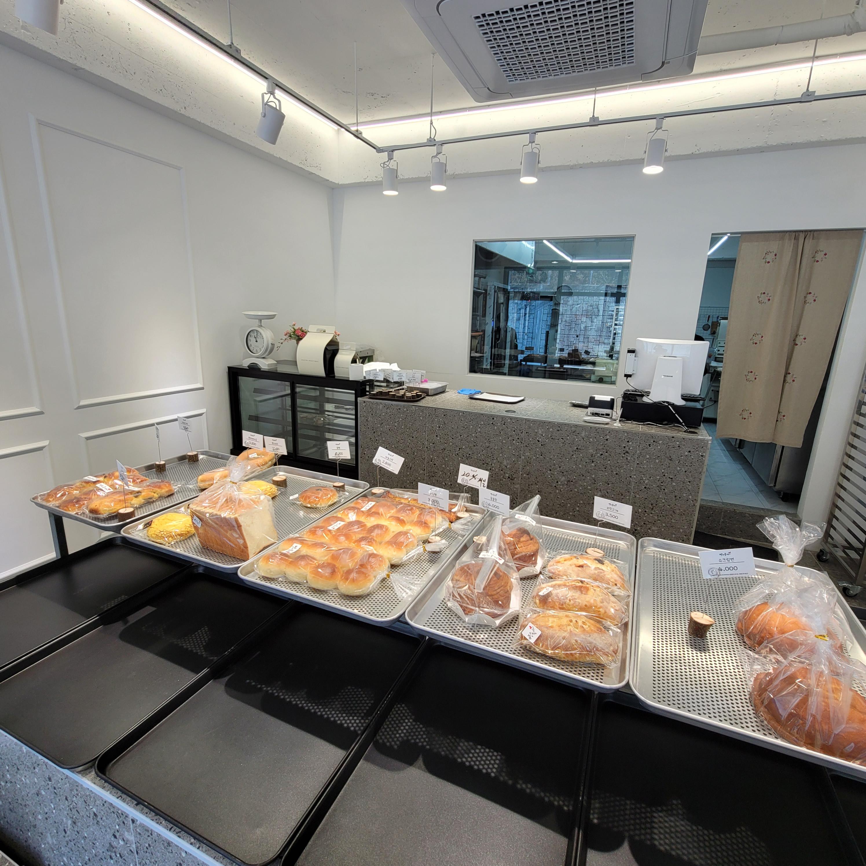 빵집 내부는 대체로 아담한 스타일이고 빵집 안에서 먹을 수 있는 홀은 없다. 주로 포장 위주 판매일듯! 난 집이랑 가까워서 관계없고 ㅋㅋ 가게가 새로생겨서 깔끔하고 빵 냄새가 좋다. 사장님 둘내외 분도 굉장히 친절하신듯하다. 인상도 좋으시고 ㅎㅎ 담에 빵 많이 있을 때 다시 가봐야할 듯 ㅠㅠ
