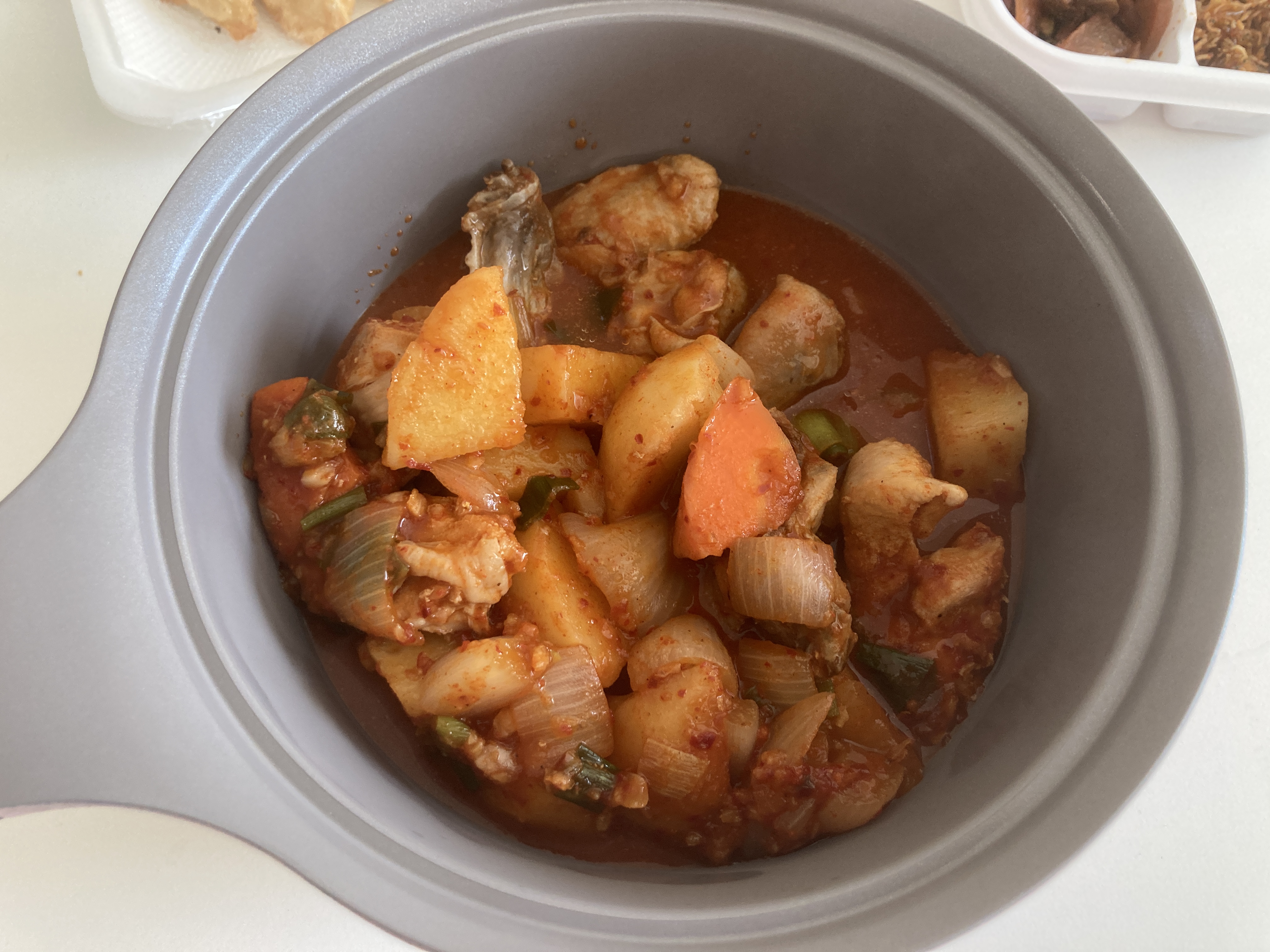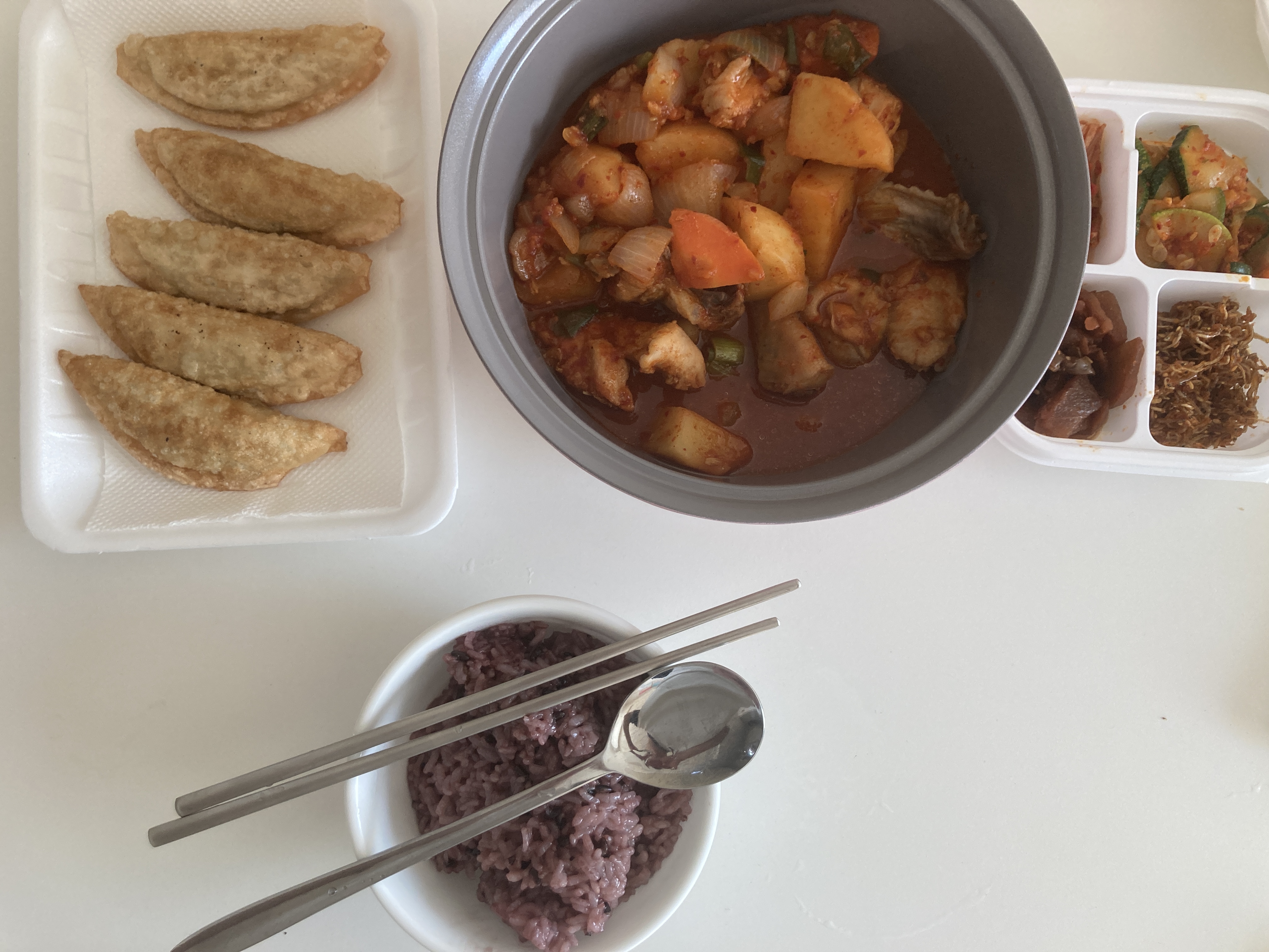 플라스틱 그릇에 먹는걸 별로 안좋아해서 집에 있는 냄비에 옮겨 담아 먹었다. 밑반찬은 간소하게 4종류. 그런데 밑반찬 딱히 필요없을 정도로 닭도리탕 맛이 훌륭했다. 양도 푸짐하고 ㅋㅋ