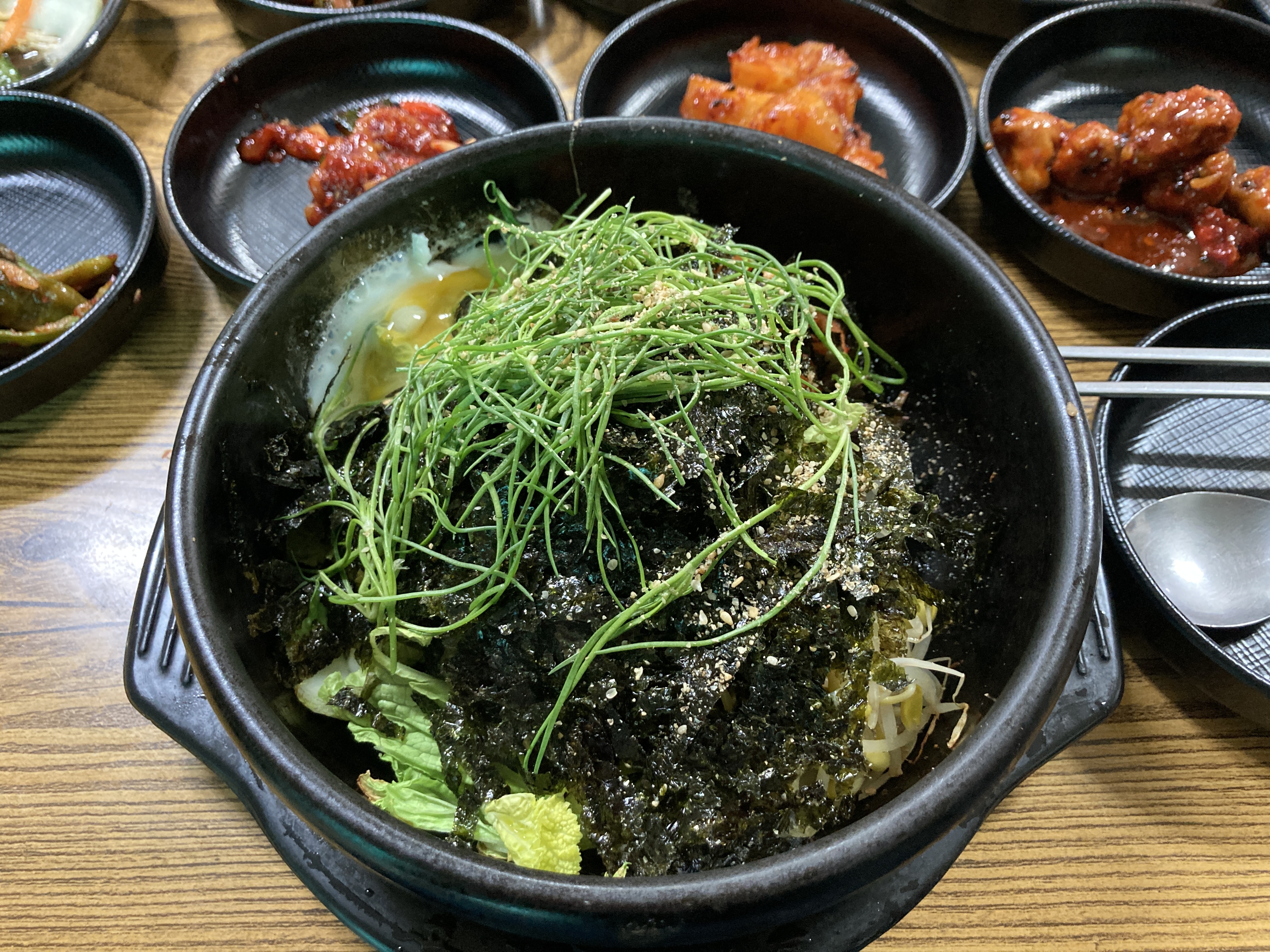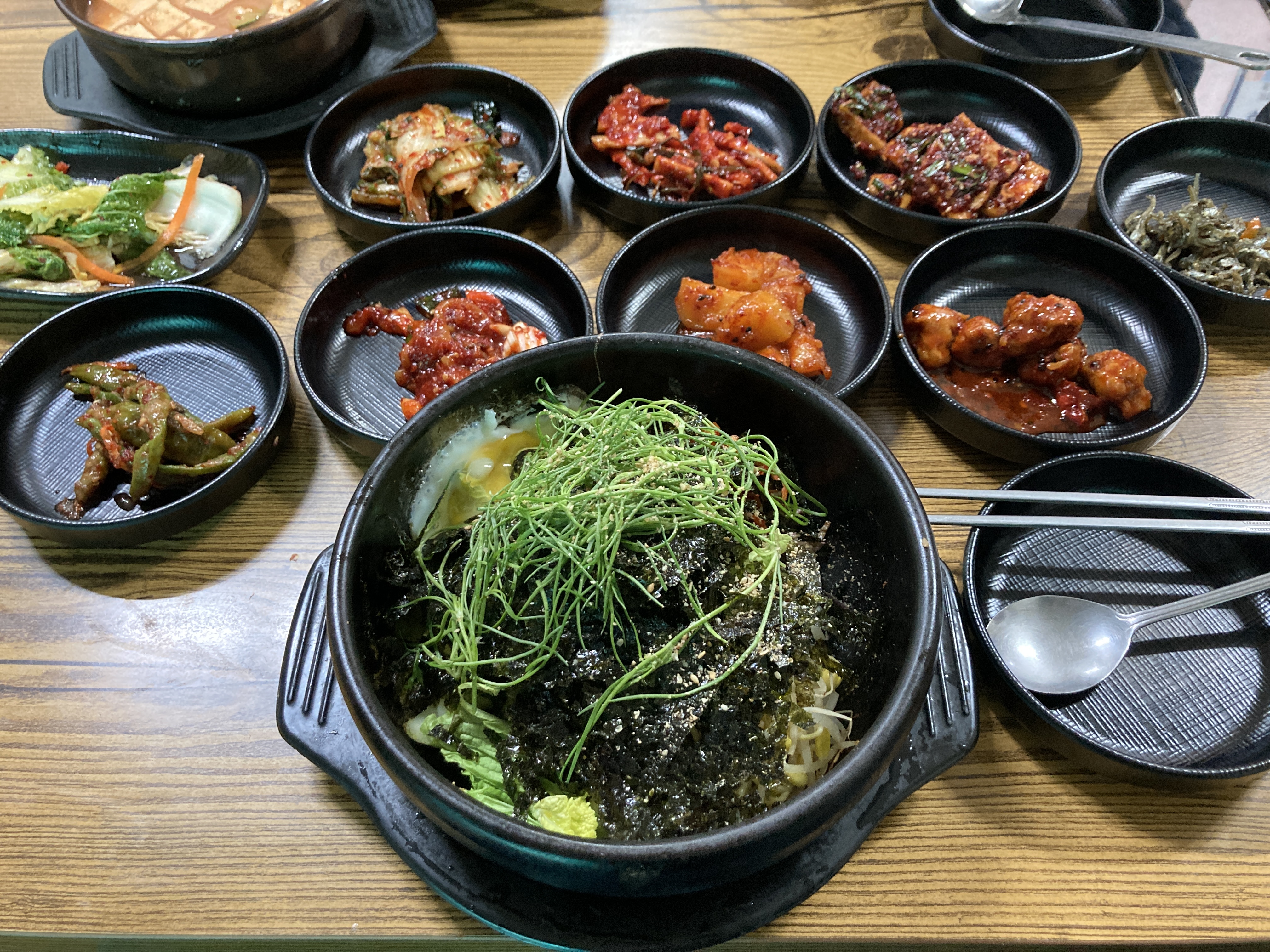 전체 풀샷. 된장찌개도 한 뚝배기 나온다. 된장찌개는 덜어서 먹었고 돌솥비빔밥 슥슥삭삭 비벼서 맛있게 먹었다. 양도 푸짐하고 가격도 저렴하고 반찬도 맛있고 단점은 거의 없는듯. 유일한 단점이라면 사람이 좀 많다는거? 추천 맛집 !