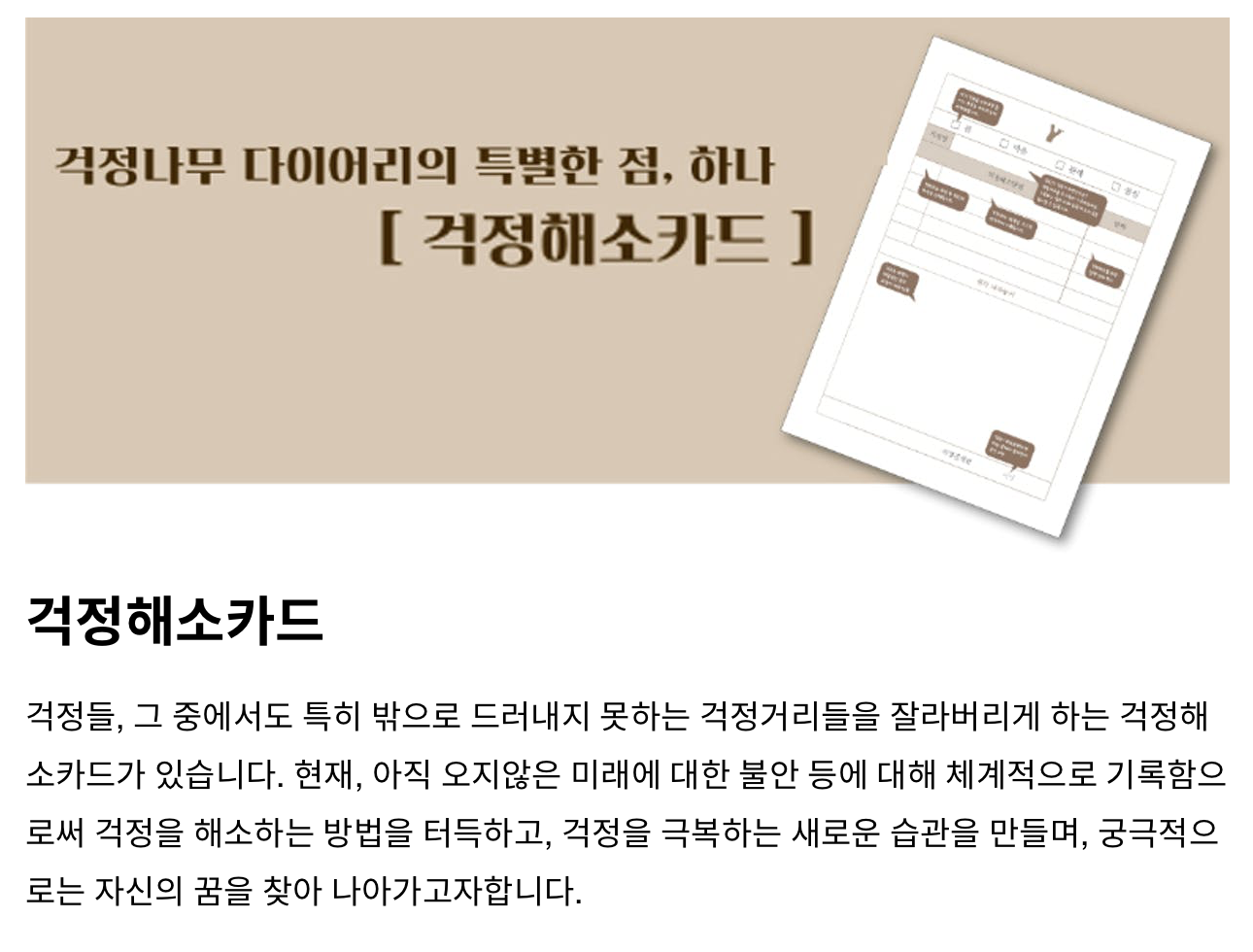 걱정나무 다이어리 구성은 걱정해소카드, 위로의 메시지가 포함돼 있습니다. 걱정해소카드는 걱정거리를 기록하고 걱정을 실제 잘라버리는 카드입니다.