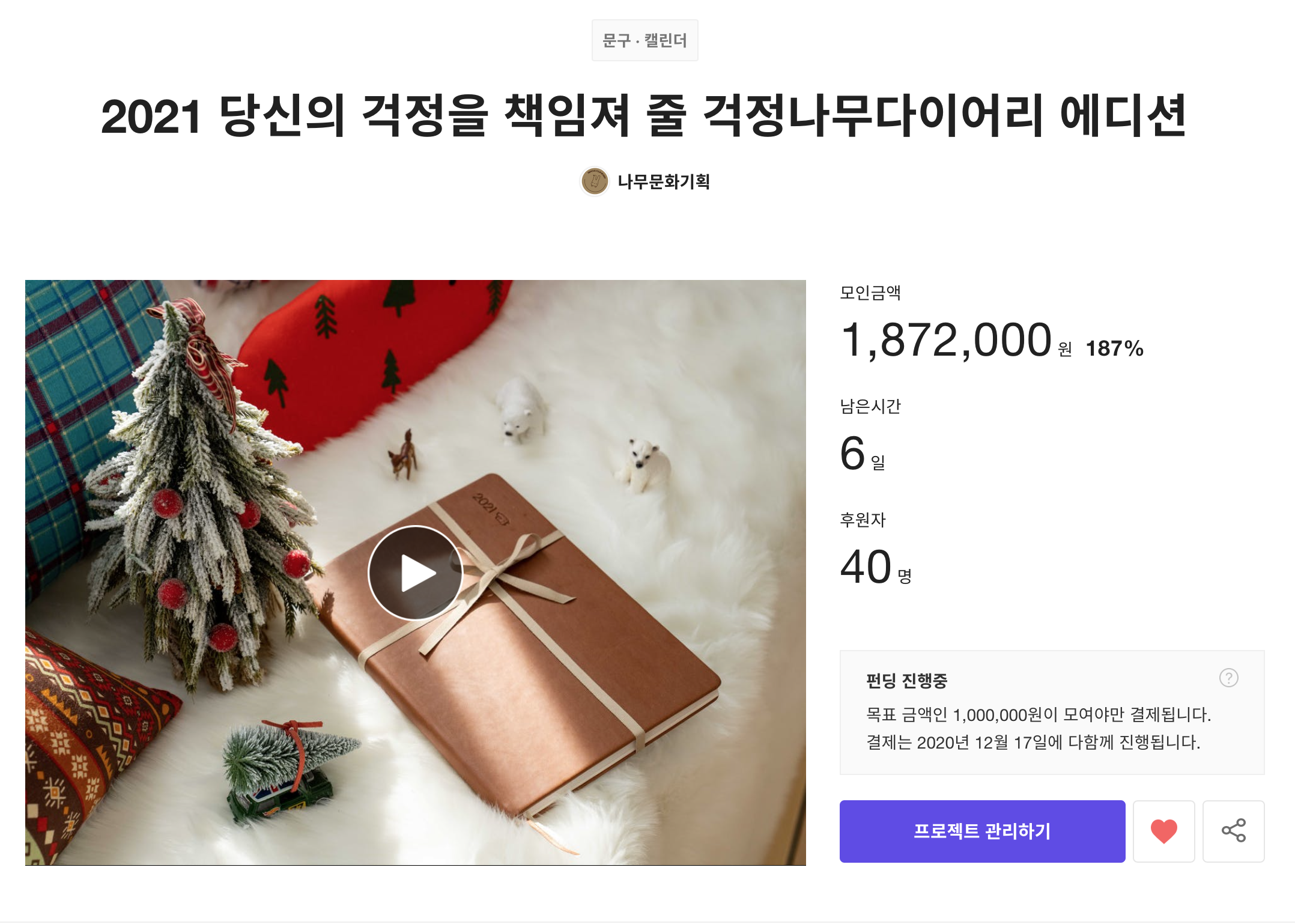 주문제작 상품으로 단품으로는 구할 수 없는 리미티드! 현재 187% 펀딩으로 인기를 끌고 있어요. 안동의 나무문화기획이라는 업체에서 제작한 2021년 걱정나무 다이어리 에디션을 만나볼까요?