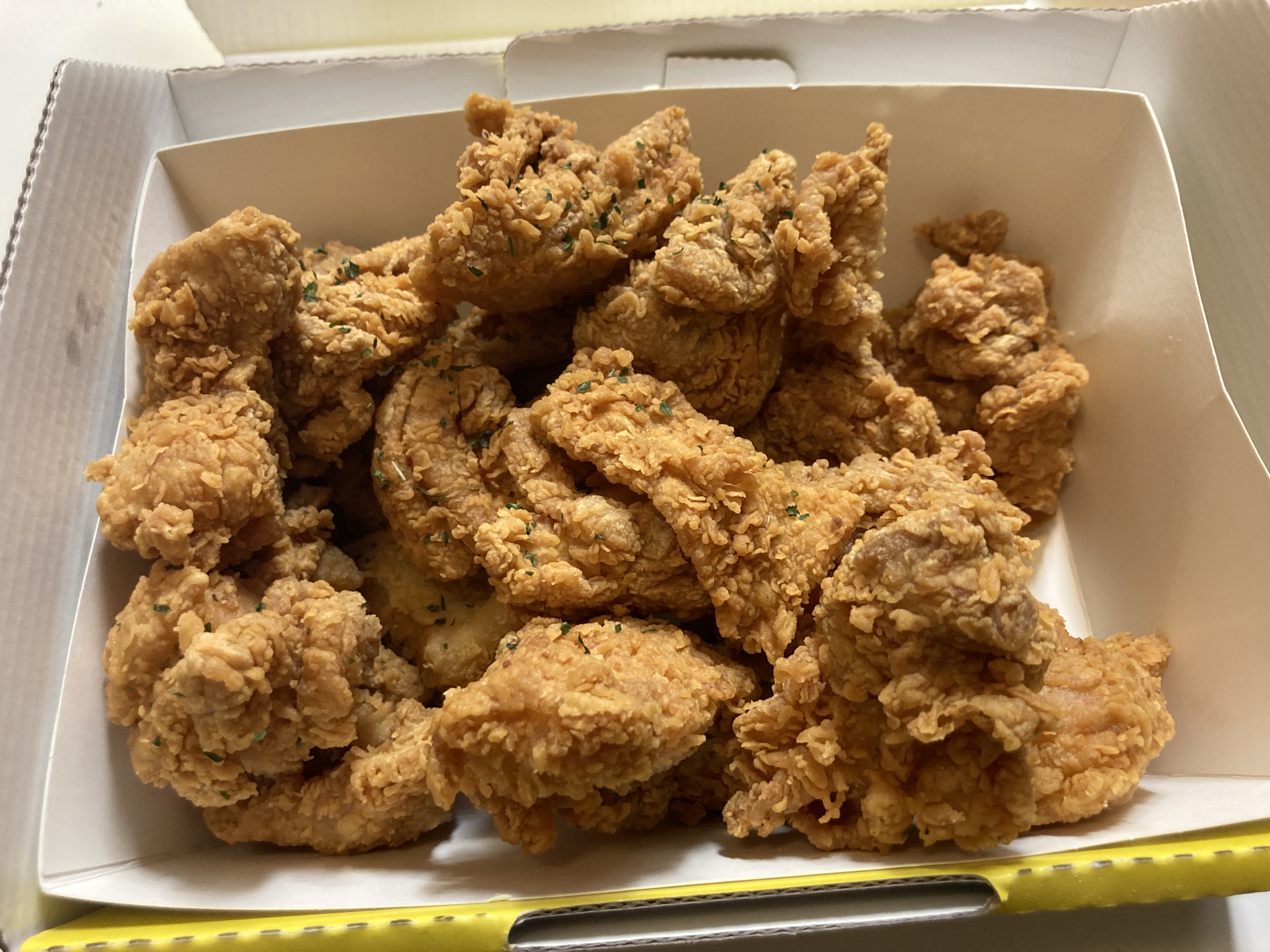치킨연구소 핫후라이드 실물 영접! 뼈 처리하기가 귀찮기도하고 치킨연구소의 순살은 다리살 100%라서 너무 맛있어서 대부분 순살로 시키는데 순살이 좋다. 핫후라이드는 일반 후라이드에 아주 살짝, 매콤한 맛이 가미된 녀석이다. 1,000원 추가.