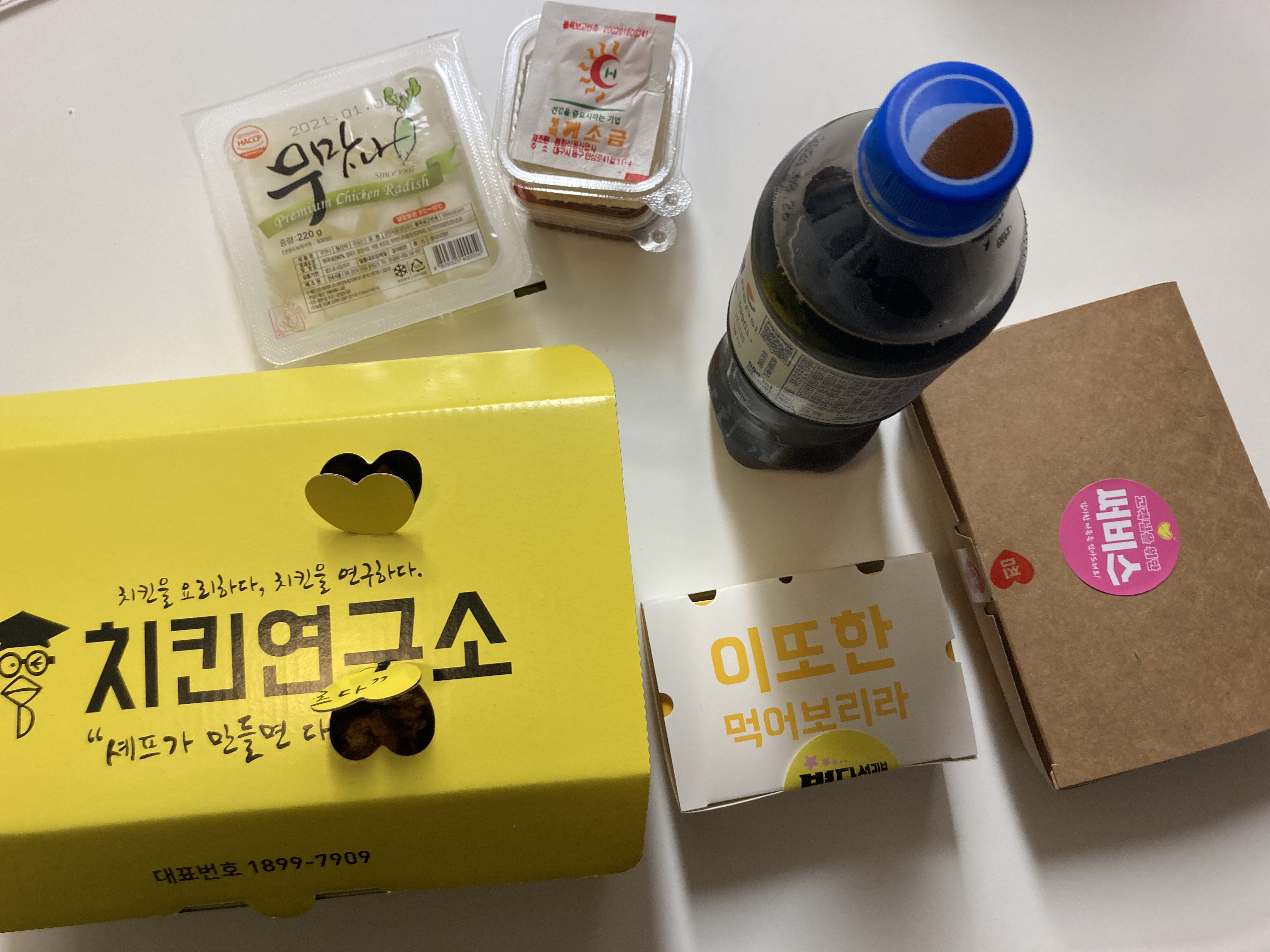 치킨연구소의 경우 소스나 파채 이런것들도 많이 주는 편이다. 후라이드 메뉴의 경우 소스를 2종을 주는데 소스도 꽤 맛있는 편이다. 그런데 진짜 맛있는 치킨은 그냥 소금만 찍어 먹는게 제일 괜찮은것 같아서 소금 위주로 찍어먹고 있다. 치킨연구소 후라이드가 진짜 맛있어서 소스 없이 소금만 찍어먹어도 정말 맛있게 먹을 수 있다. 겉바속촉! 소금으로 짭조름하게 즐기기 가능 ㅋㅋ