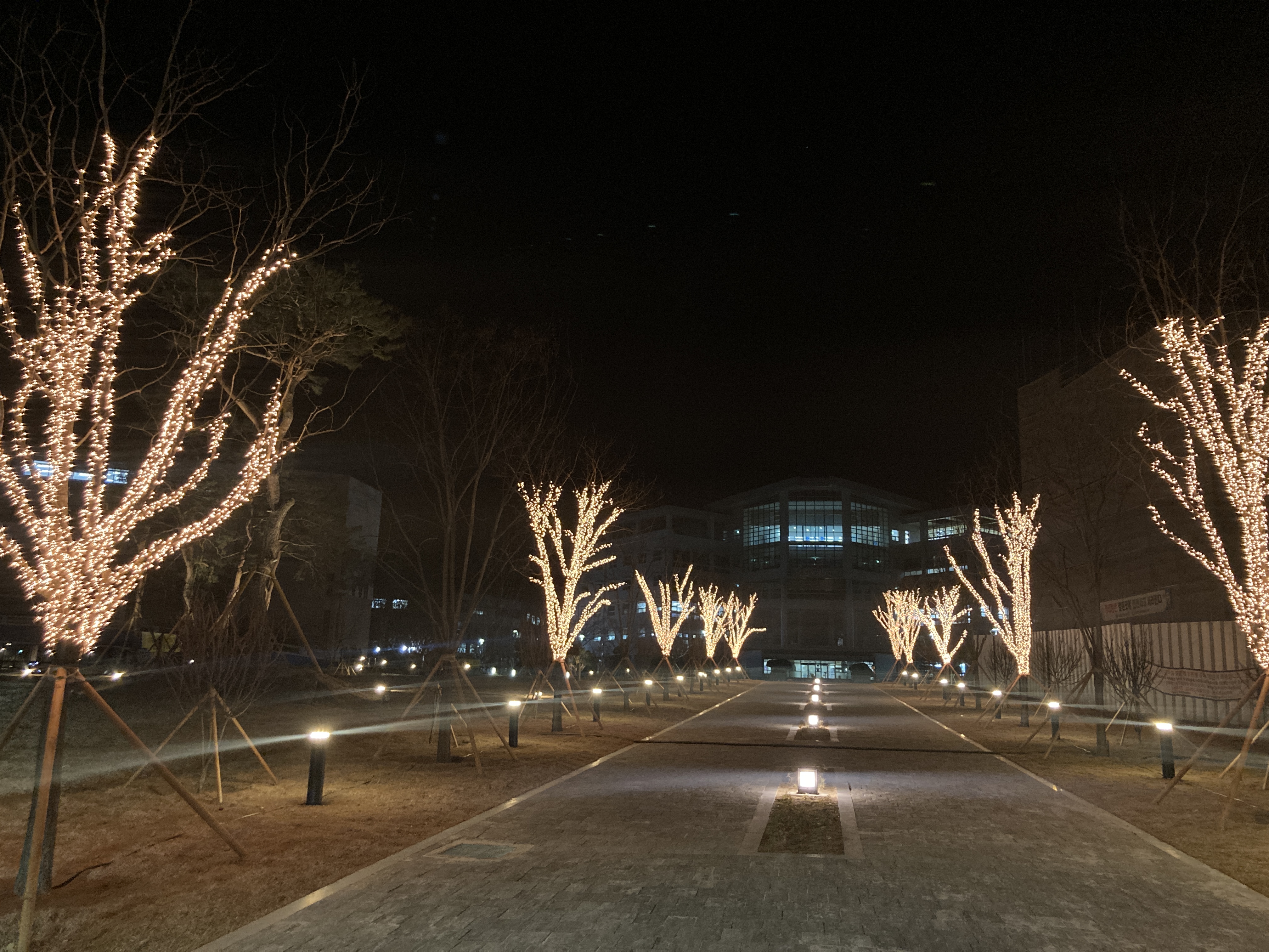 아름다운 조명을 설치해두어서 겨울 분위기가 물씬나는 공간이 되었다. 실물로 보면 훨씬 예쁘다. 사진 한 장 안남길 수가 없어서 잠시 내려서 한장 찰칵. 사진 찍기에도 좋은 공간인 것 같은데 안타깝게도 코로나 등으로 인해서, 그리고 날씨가 무척이나 추웠던 날이라 사람들이 거의 없었지만 학생들은 오고가며 사진도 찍고 하는 것 같았다.