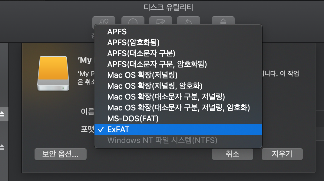 WD 외장하드의 경우 처음 연결하면 이름이 My Passport로 돼 있는데 이름은 알아서 바꿔주면 된다. 연결된 외장하드를 누르고 상단에 있는 '지우기' 버튼을 클릭해서 포맷을 해준다. 이때 이름을 바꿔주는 것도 좋겠는데, 중요한건 포맷을 잘 정해야한다. 여기에서 선택할 수 있는 유일한 포맷은 ExFAT 포맷이다. 다른걸로 하면 어느 한쪽에서는 인식이 안되므로 주의할 것. 처음 살 땐 윈도우 파일 시스템인 NTFS로 포맷되어 있는 모양이다. 어차피 포맷 한 번 하고 사용할거니 관계는 없지만.