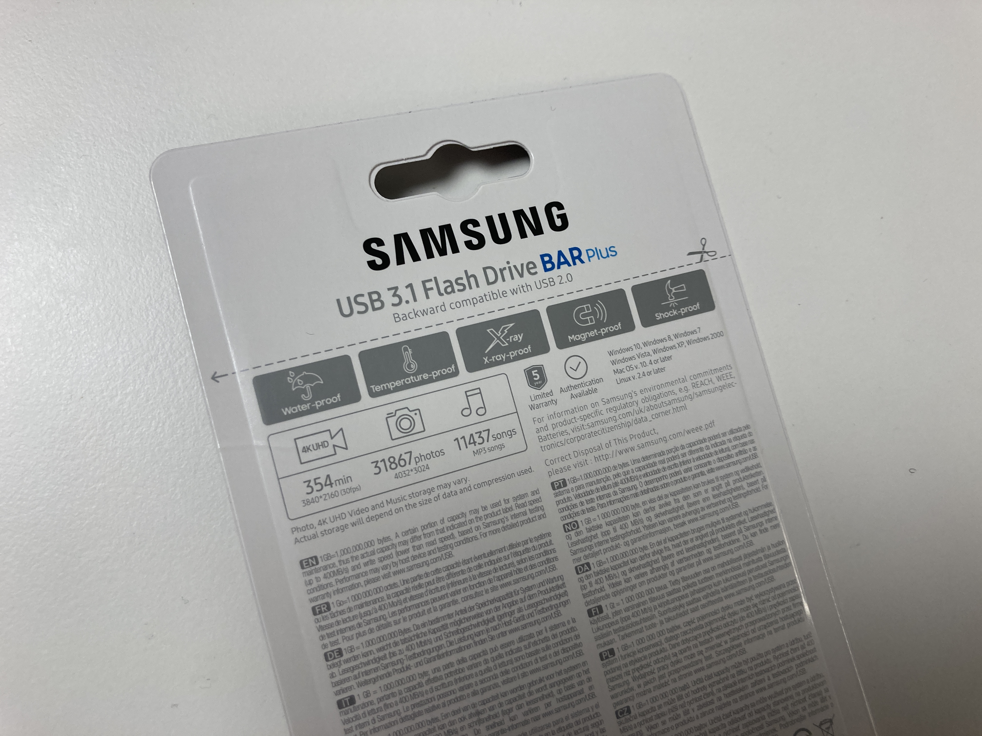 뒷면은 대충 이렇게 간단한 설명이 적혀있다. 4K 비디오를 354분 또는 사진을 3만장 이상 담을 수 있다고 나와있다. 음악은 1만곡 이상. 나는 영상 자료랑 강의 자료 PPT를 넣어둘거라 이거는 별로 관계없다. 안 잃어버리길... 강의 현장은 대부분 매우 정신없어서 까딱하면 이런걸 잃어버리기 십상이다.