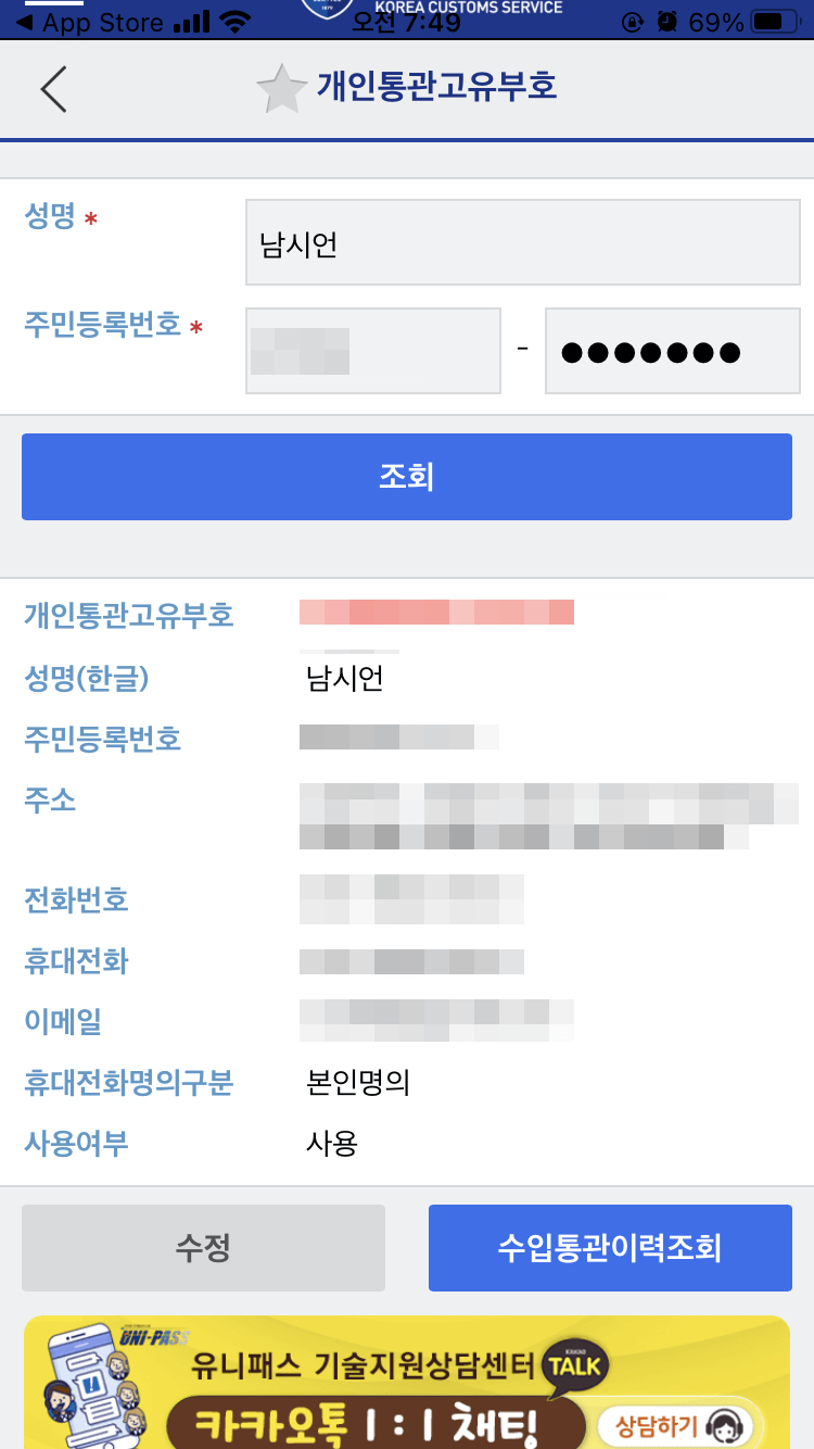 카톡으로 받은 개인통관고유부호 등록 링크를 클릭해서 들어가준다.