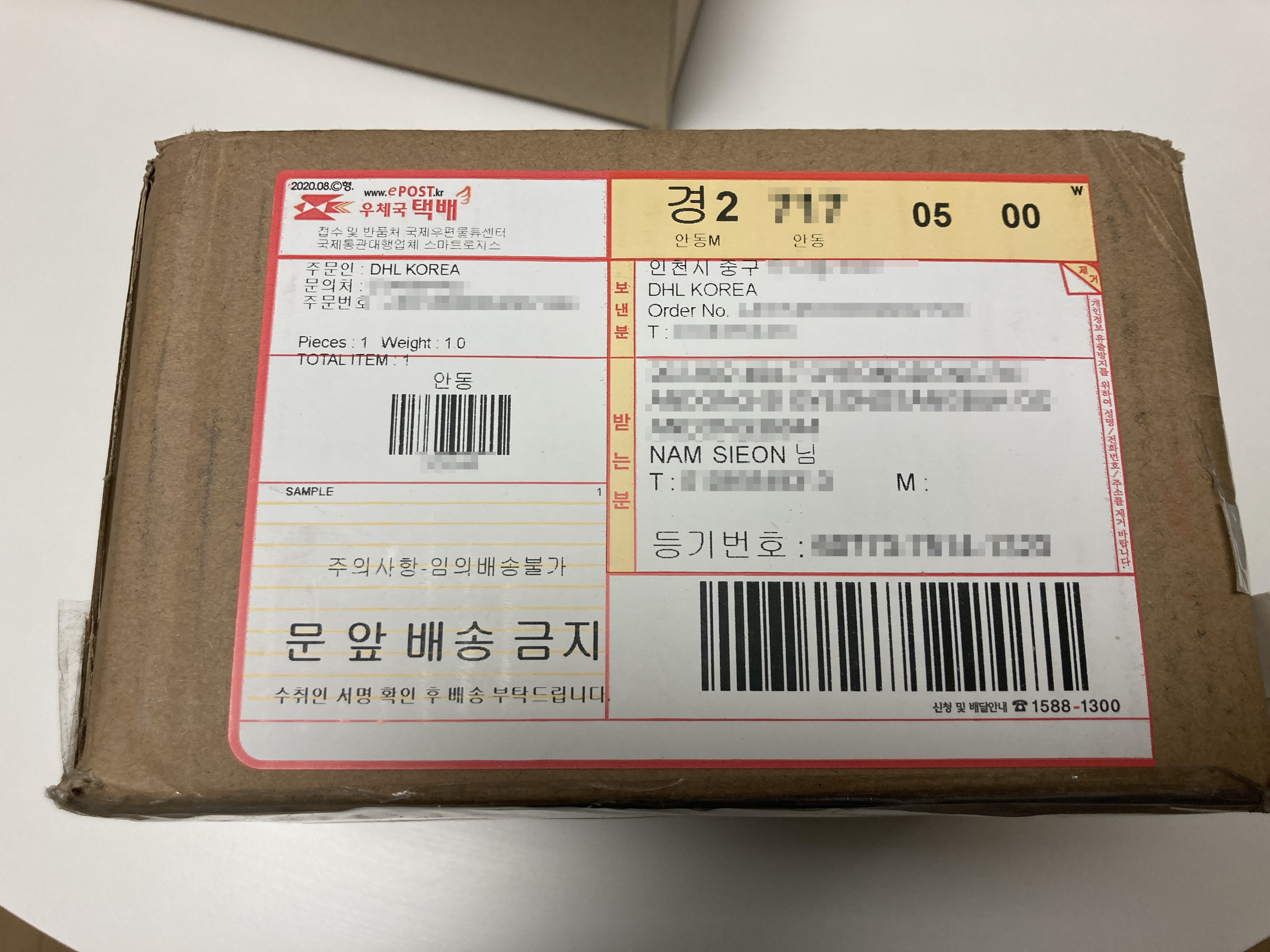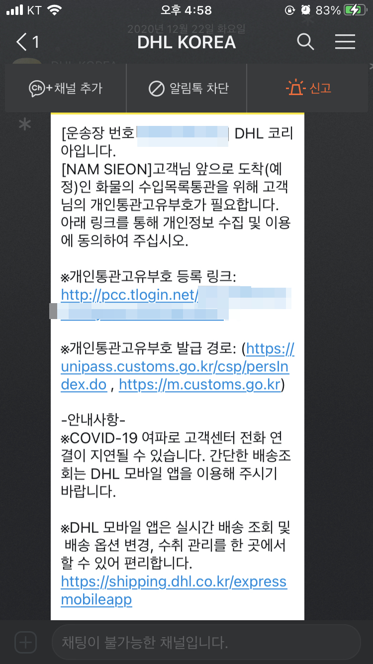 해외 택배를 받아야할 일이 있으면 DHL 택배로 오는 경우가 있다. 중간에 거치는 단계를 만들지 않고 해외에서 직배송으로 보내게 되면 기간은 좀 걸리지만 오긴 온다. 예전에는 개인통관고유부호를 입력하는 카톡이 온 것 같진 않은데, 이제는 해당 상품에 대해 개인통관고유부호가 필요하며 입력하지 않을 경우 그대로 반송된다. 따라서 DHL KOREA라는걸 통해서 카톡으로 오는 개인통관고유부호 등록을 꼭 해주어야한다. 내가 해보니까 이건 배송되는 당일인가 전날인가 오는 것 같다. 국내에선 우체국 택배로 받았다.