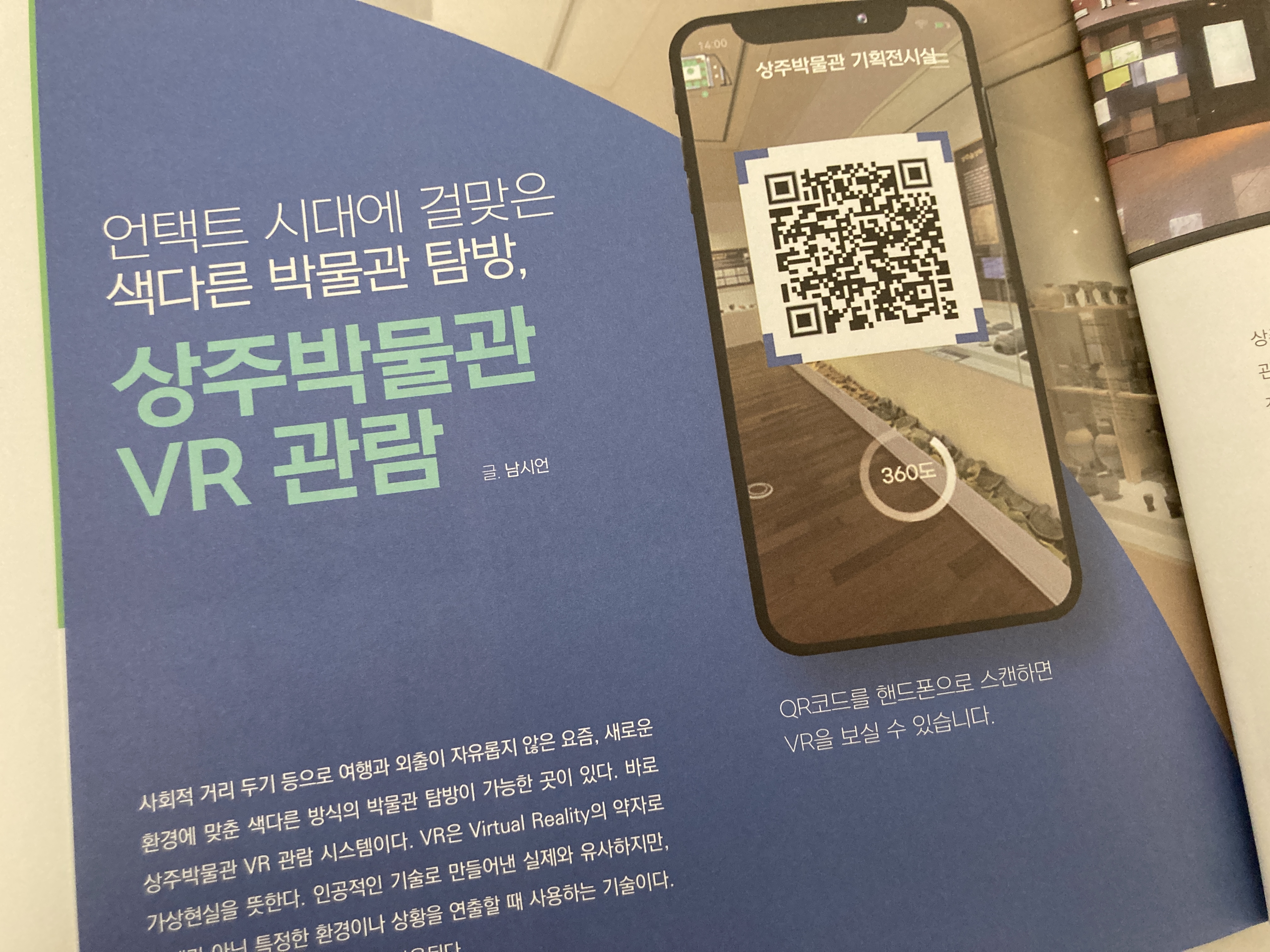 담당 팀장님과 이야기를 나누다가 언택트 시대에 걸맞게 박물관을 VR로 관람할 수 있는 시스템이 있다고 아이디어를 주셔서 해당 박물관 VR 탐방을 소개하는 원고로 방향을 잡고 기고하였다. 주제는 상주박물관 VR 이다. 박물관은 오프라인에 직접 보고 체험하는게 좀 더 나은 선택이겠지만, 요즘처럼 언택트 시대에는 여러가지 정보들을 안전하게 학습하는 것도 중요하기 때문에 상주박물관의 VR 탐방을 통해 보다 많은 분들이 상주박물관에 관심을 가져주셨으면 한다.