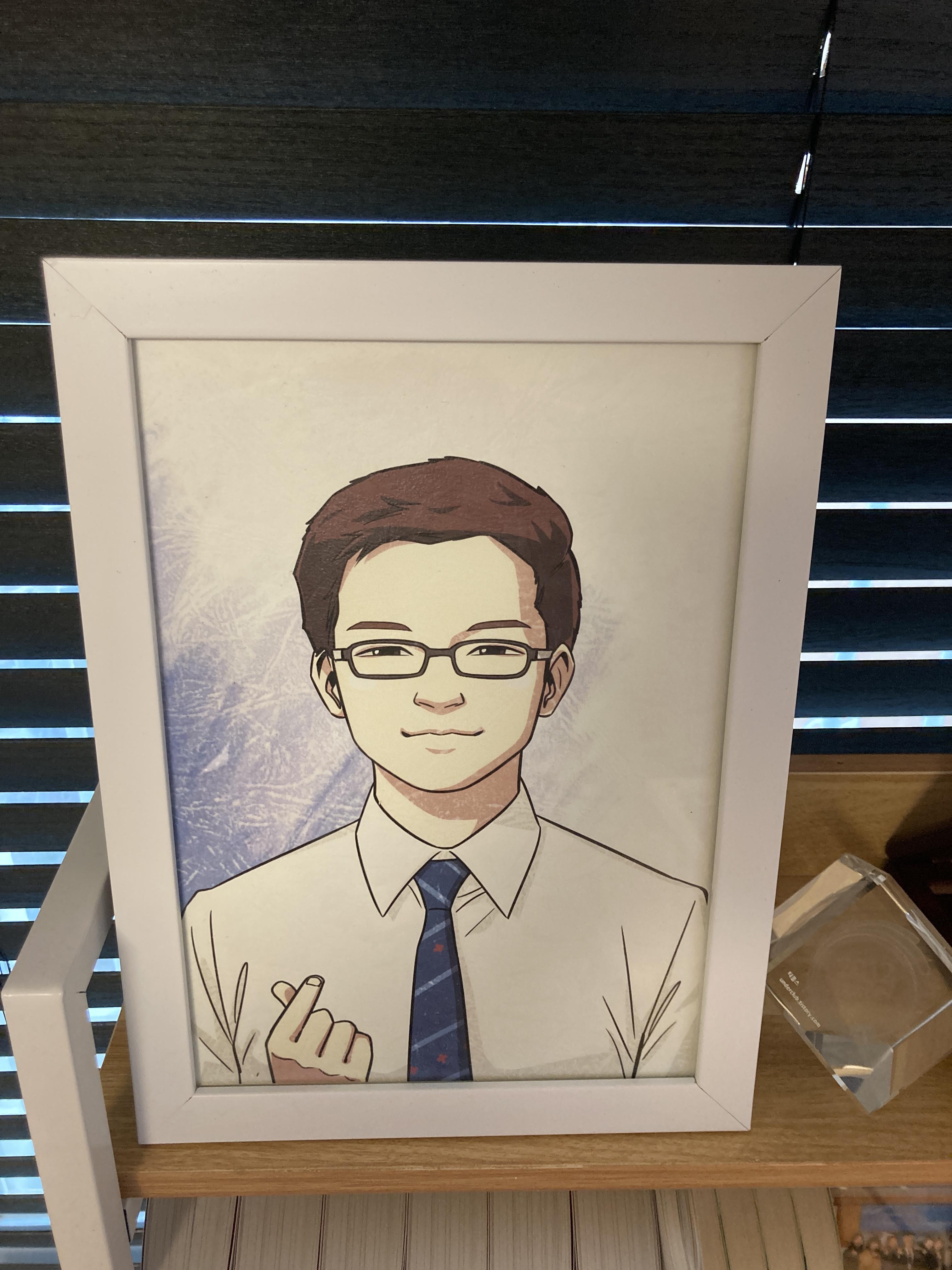 일단 웹툰 스타일, 만화 스타일이라서 그림이 굉장히 입체적인 느낌이고 선처리가 깔끔하다. 그림은 나는 잘 몰라서 그냥 느낌만 봐도 그렇다. 일반적으로 팝아트 형식으로 그려주는 캐리커쳐나 아니면 옛날에 유행하던 얼굴 대빵만하게 그려주는 캐리커쳐도 물론 재미있지만, 이렇게 만화 웹툰 스타일에 가까운 캐리커쳐는 진짜 재미있고 인테리어 효과도 좋다. 이렇게 액자로도 주니 더욱 만족!