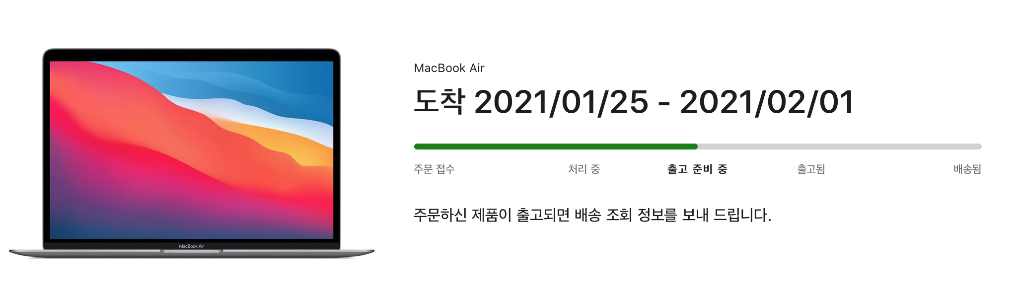 지난번에 애플 공홈에서 주문한 M1 맥북에어~! 드디어 처리 중에서 출고 준비 중으로 바뀌었다!!! 휴... 제품 생산 밀려서 엄청 오래 기다려야해서 기다리기 힘든데 생각보다는 조금 일찍 올 것 같은 예감이 든다. 예전에 아이맥 살 땐 이렇게까지 오래걸리진 않았는데, 아무래도 M1 맥북에어가 인기모델인데다가 최신 제품이고 CTO라서 좀 더 오래 걸리는 것 같다.