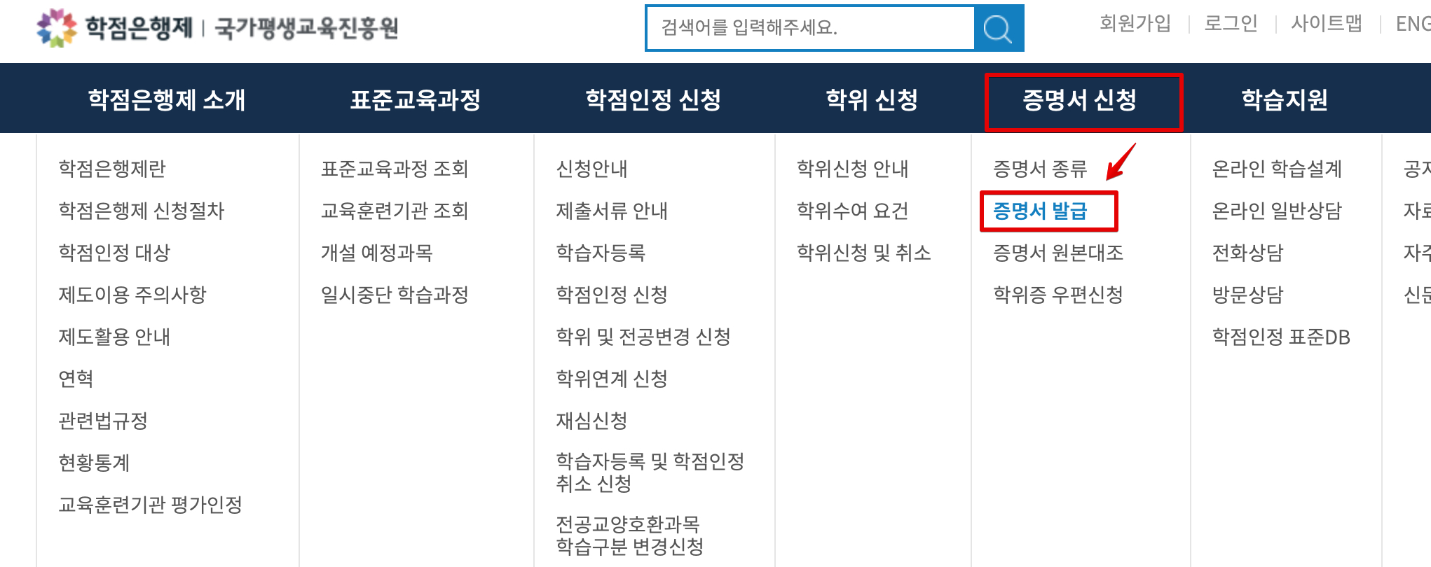 학점은행제 홈페이지 상단에 있는 '증명서 신청' 메뉴에서 '증명서 발급' 메뉴를 클릭합니다.