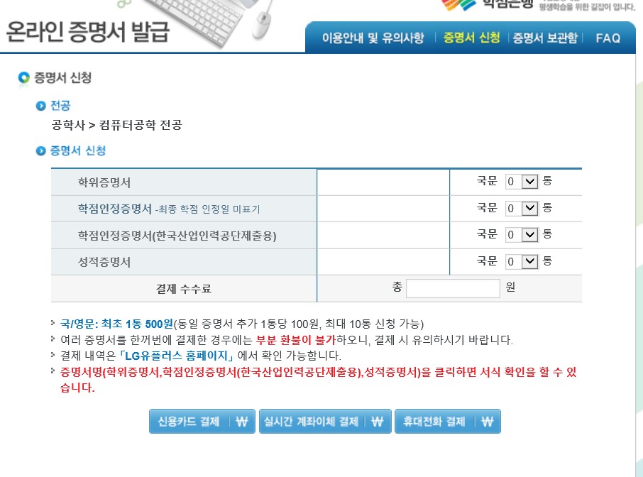 온라인 증명서 발급 창이 나오면 여기에서 원하는 증명서를 선택합니다. 수수료는 500원이 들고 신용카드, 계좌이체, 휴대폰 결제 등 편리한 방법을 이용할 수 있습니다.