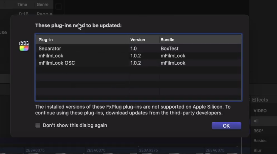 호환되지 않는 플러그인을 사용할 경우 파이널컷을 실행하면 위와같은 메시지가 나타납니다. 서드파티 플러그인이 애플 실리콘 맥을 지원하지 않으므로 업데이트가 필요하다는 내용입니다.