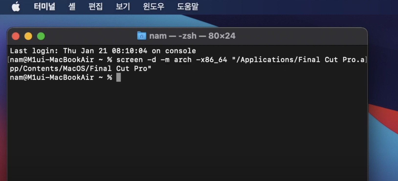 로제타로 실행되는 파이널컷 호환성 모드로 진입하려면 터미널 명령어를 써야합니다. 터미널을 실행하고
