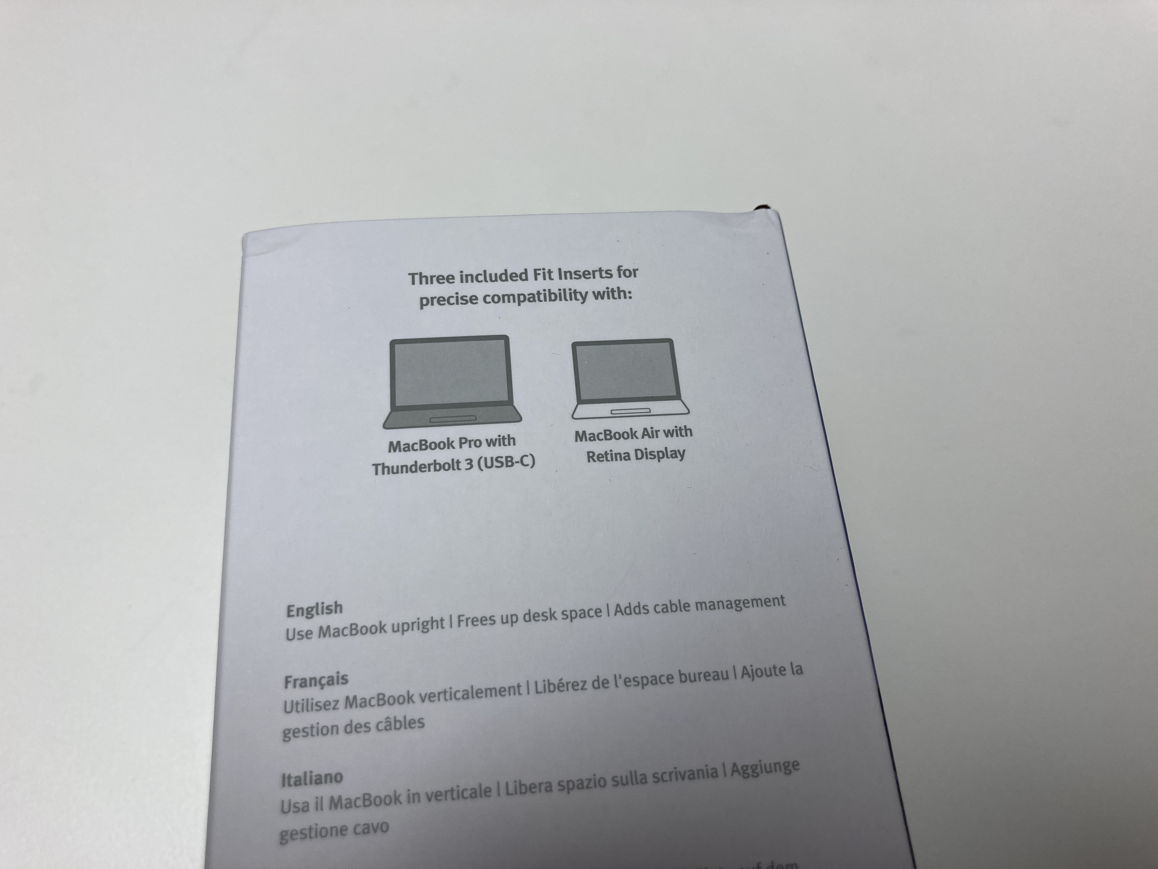 상자에는 이런식으로 거치하라고 돼 있지만, 최근 나오는 M1 맥북은 썬더볼트 충전 단자가 애플 로고를 정면으로 봤을 때 왼쪽이 아니라 오른쪽에 배치되어 있다. 따라서 선을 직선으로 연결하려면 맥북을 오른쪽이 아니라 왼쪽에 두어야한다.
